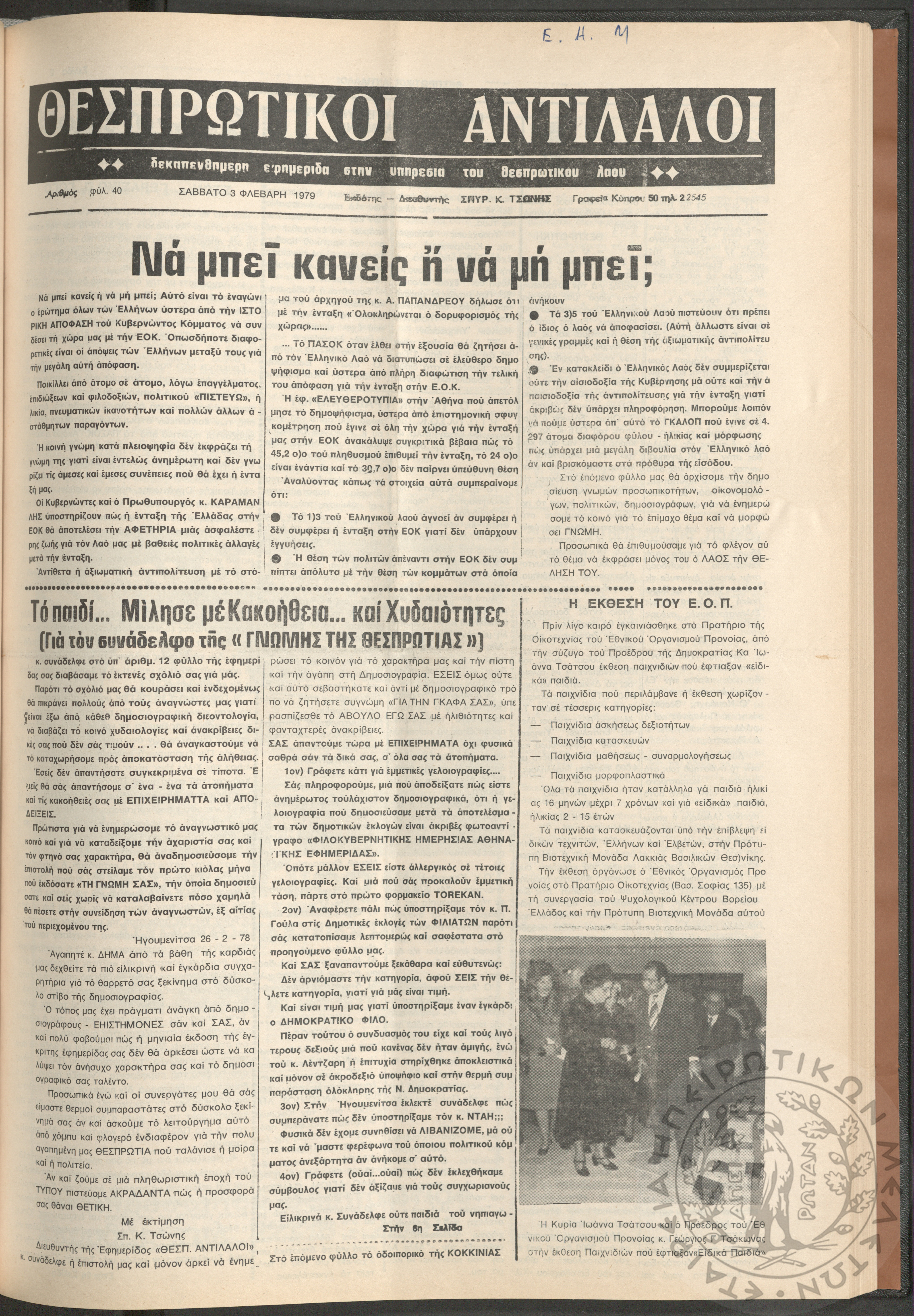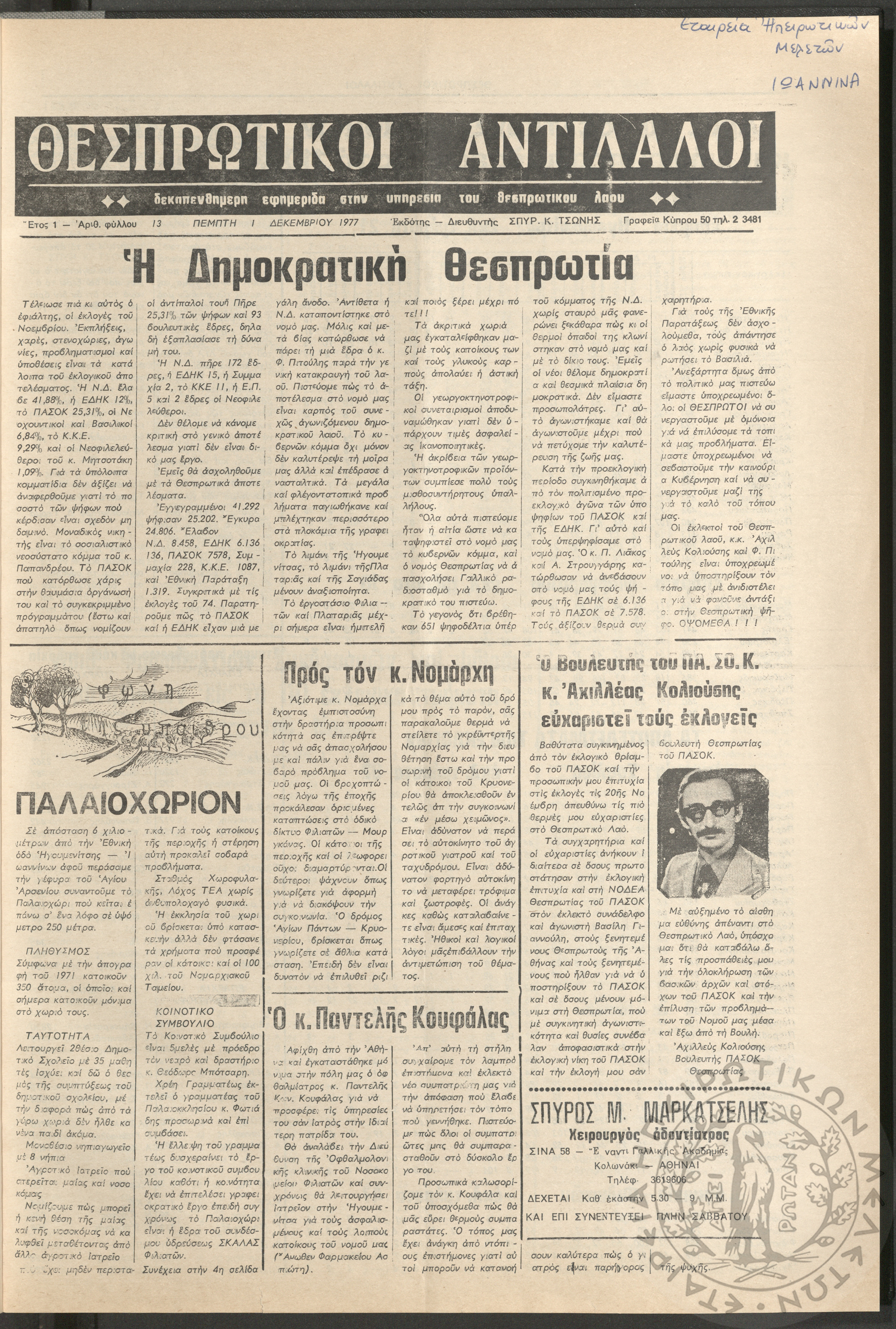Θεσπρωτικοί Αντίλαλοι: Δεκαπενθήμερη εφημερίδα στην υπηρεσία του Θεσπρωτικού λαού, 1977, φ. 13Έτος 1, φ. 13...