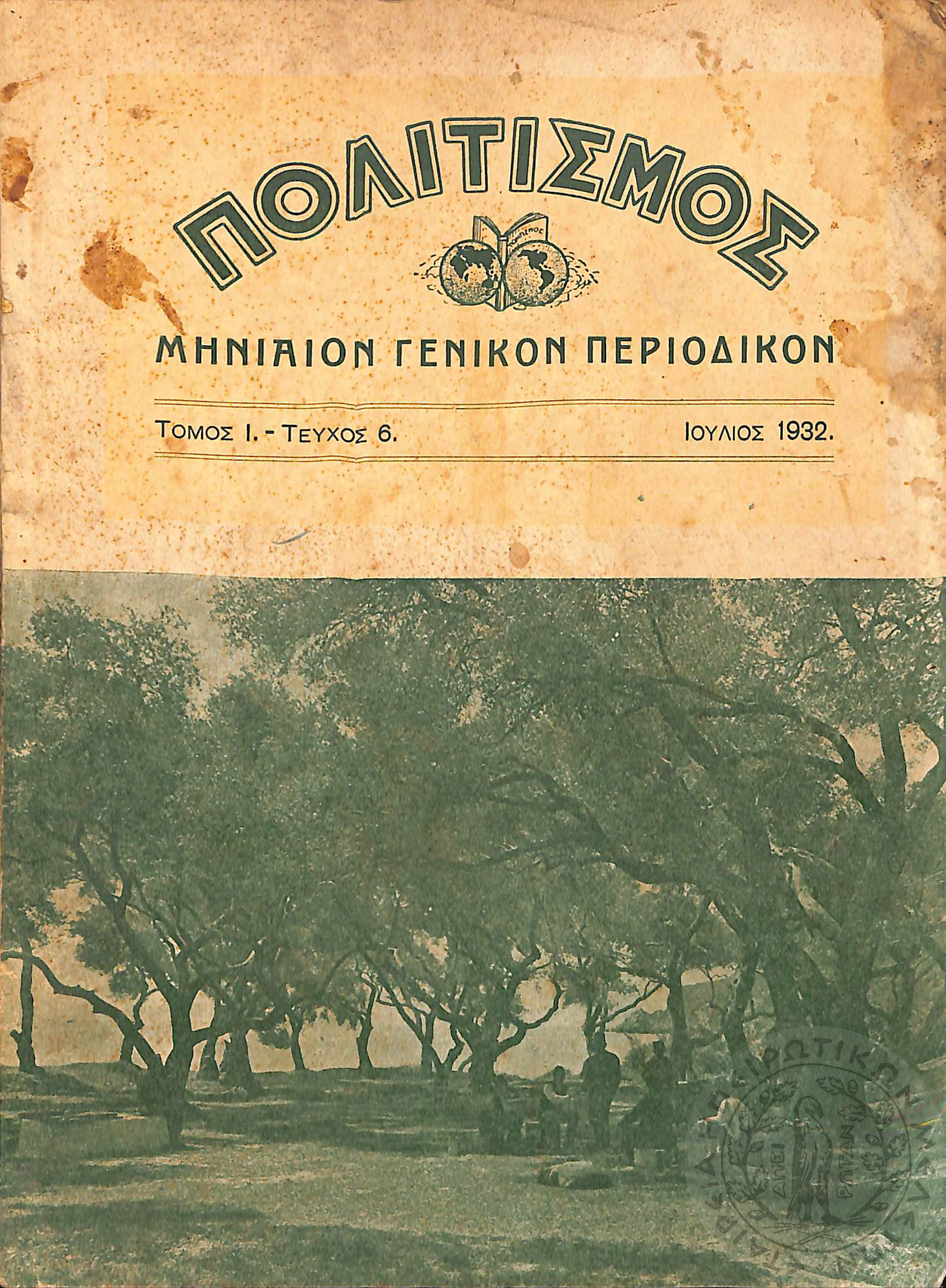 Πολιτισμός: μηνιαίον γενικόν περιοδικόν εκδιδόμενον την 10ην εκάστου μηνός - πολιτική, κοινωνιολογία, οικονομολογία, επιστήμαι, γράμματα και τέχναι (τεύχ. 6)Έτος Ι΄, τεύχ. 6...