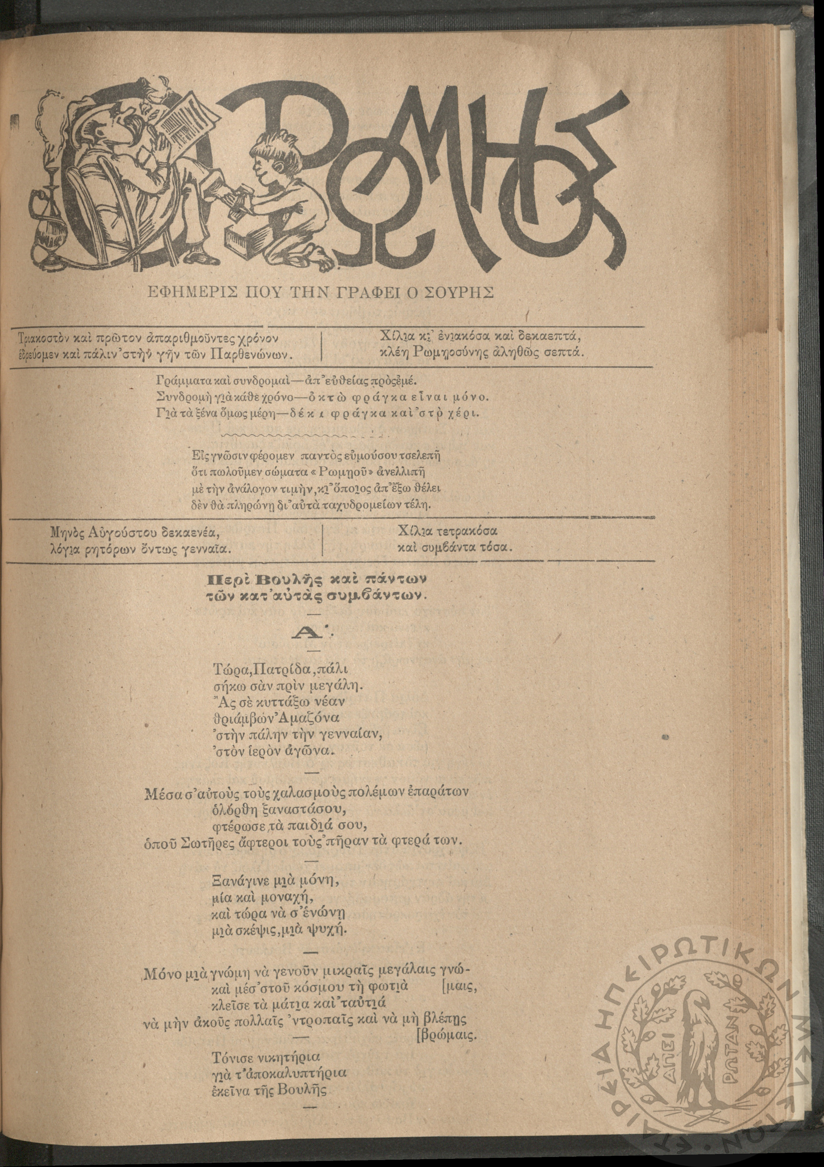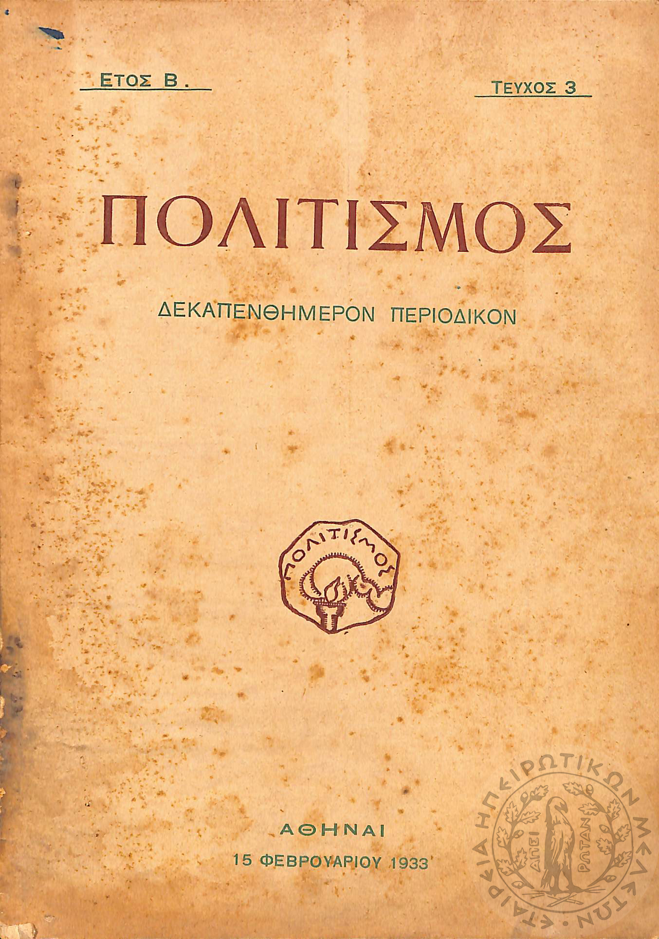 Πολιτισμός : δεκαπενθήμερον γενικόν περιοδικόν - πολιτισμός, κοινωνιολογία, οικονομολογία, επιστήμαι, γράμματα και τέχναι (τεύχ. 3)Έτος Β', τεύχ. 3...