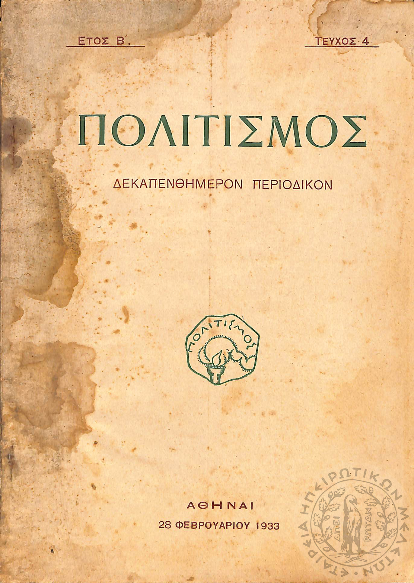 Πολιτισμός : δεκαπενθήμερον γενικόν περιοδικόν - πολιτισμός, κοινωνιολογία, οικονομολογία, επιστήμαι, γράμματα και τέχναι (τεύχ. 4)Έτος Β', τεύχ. 4...