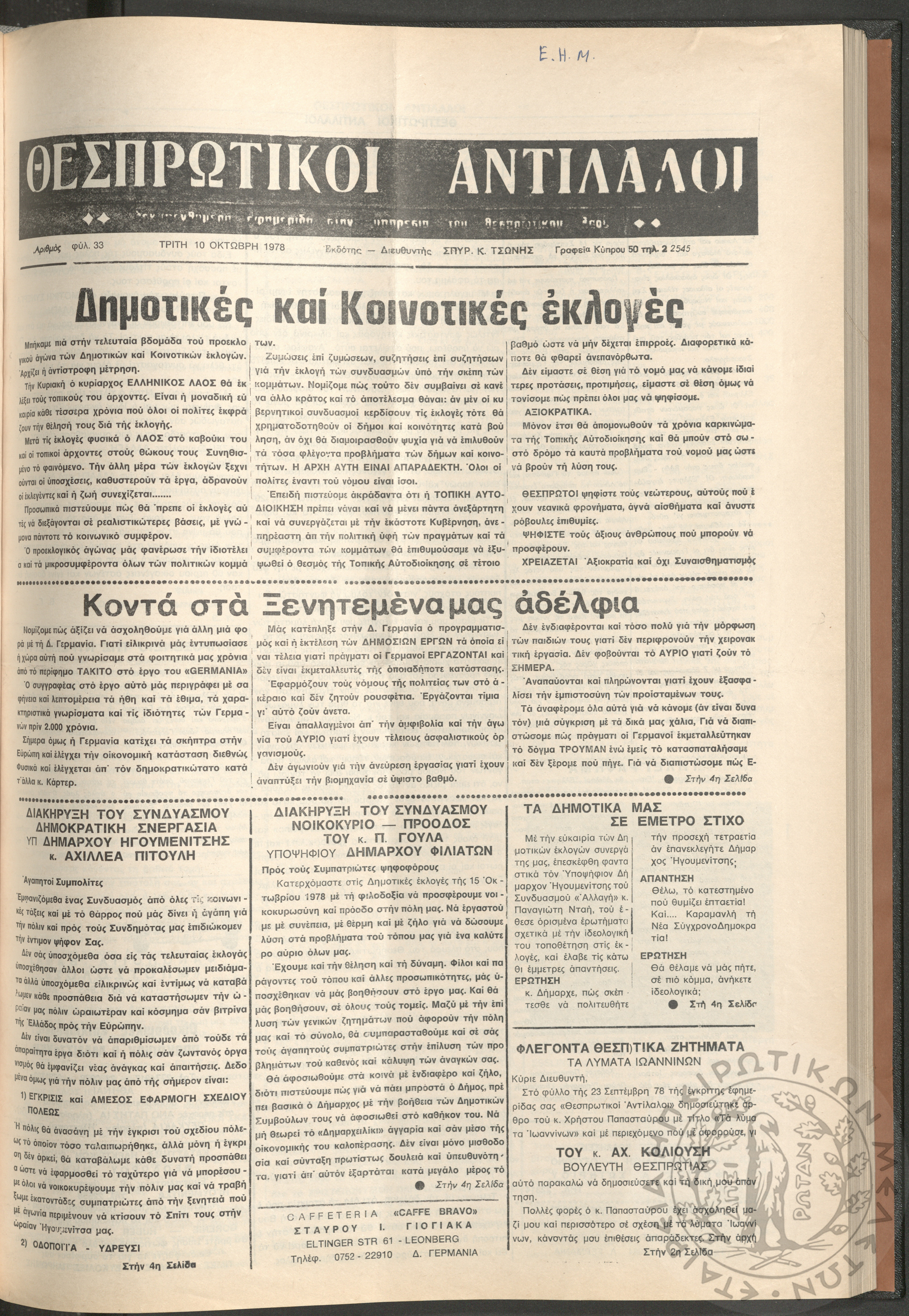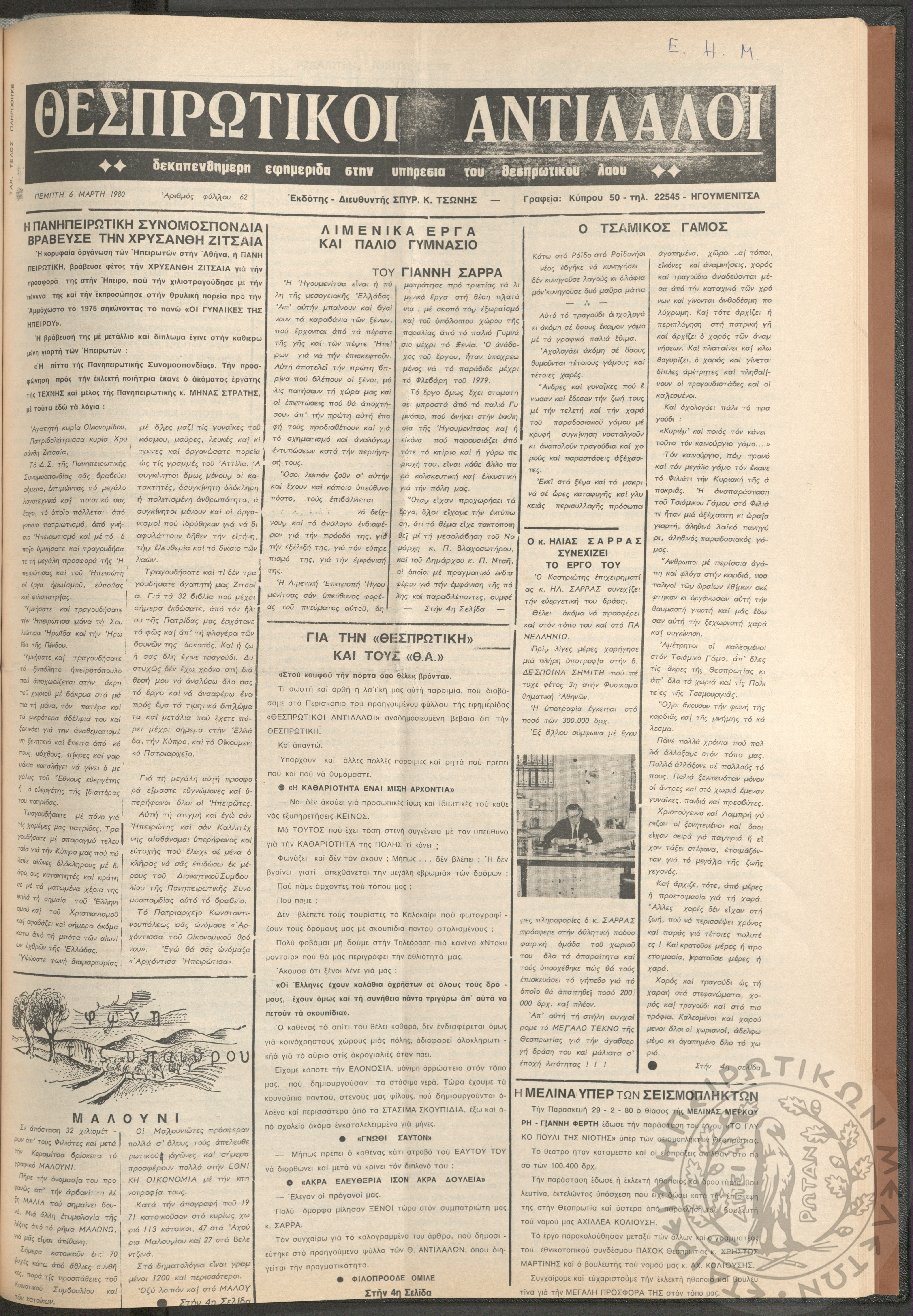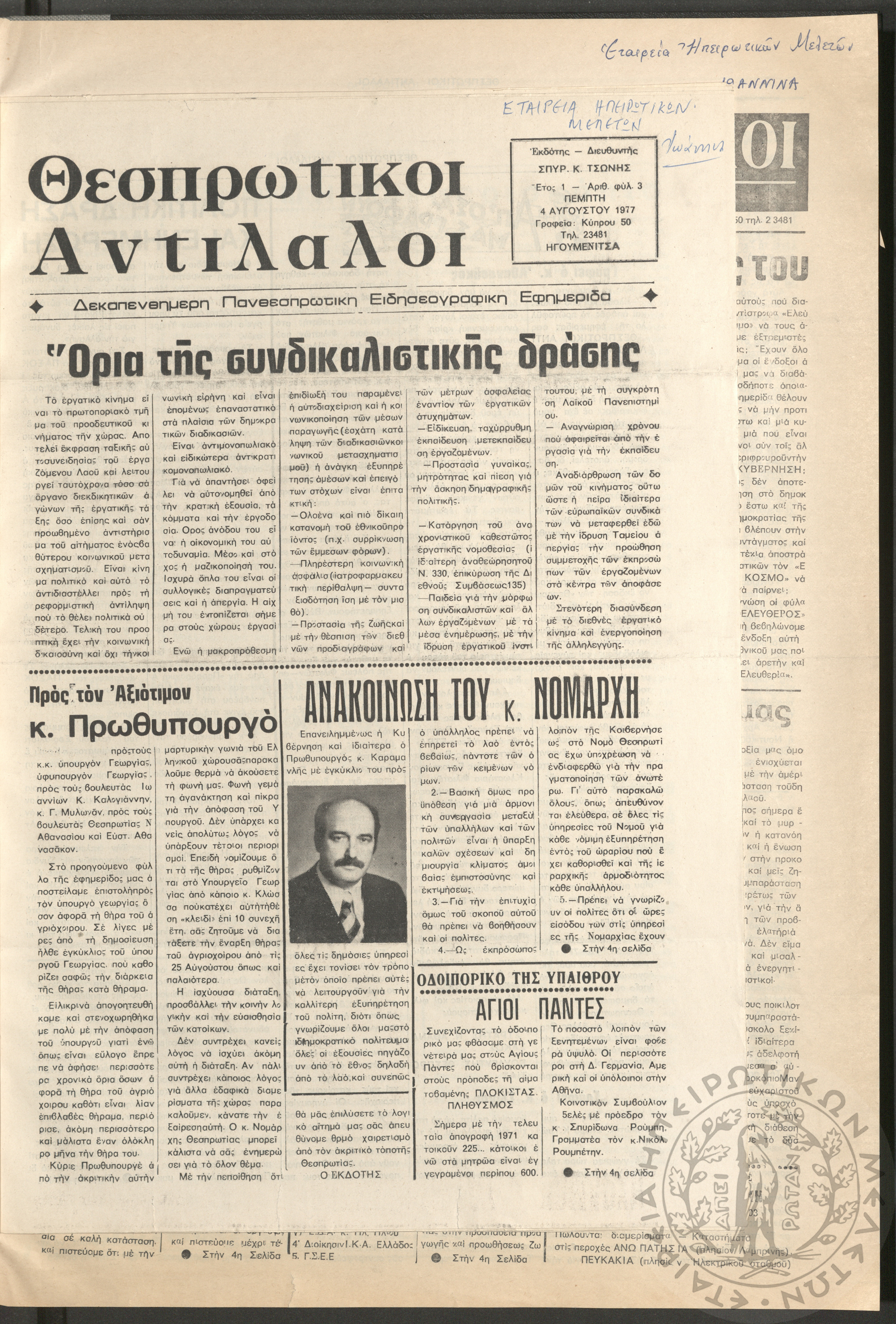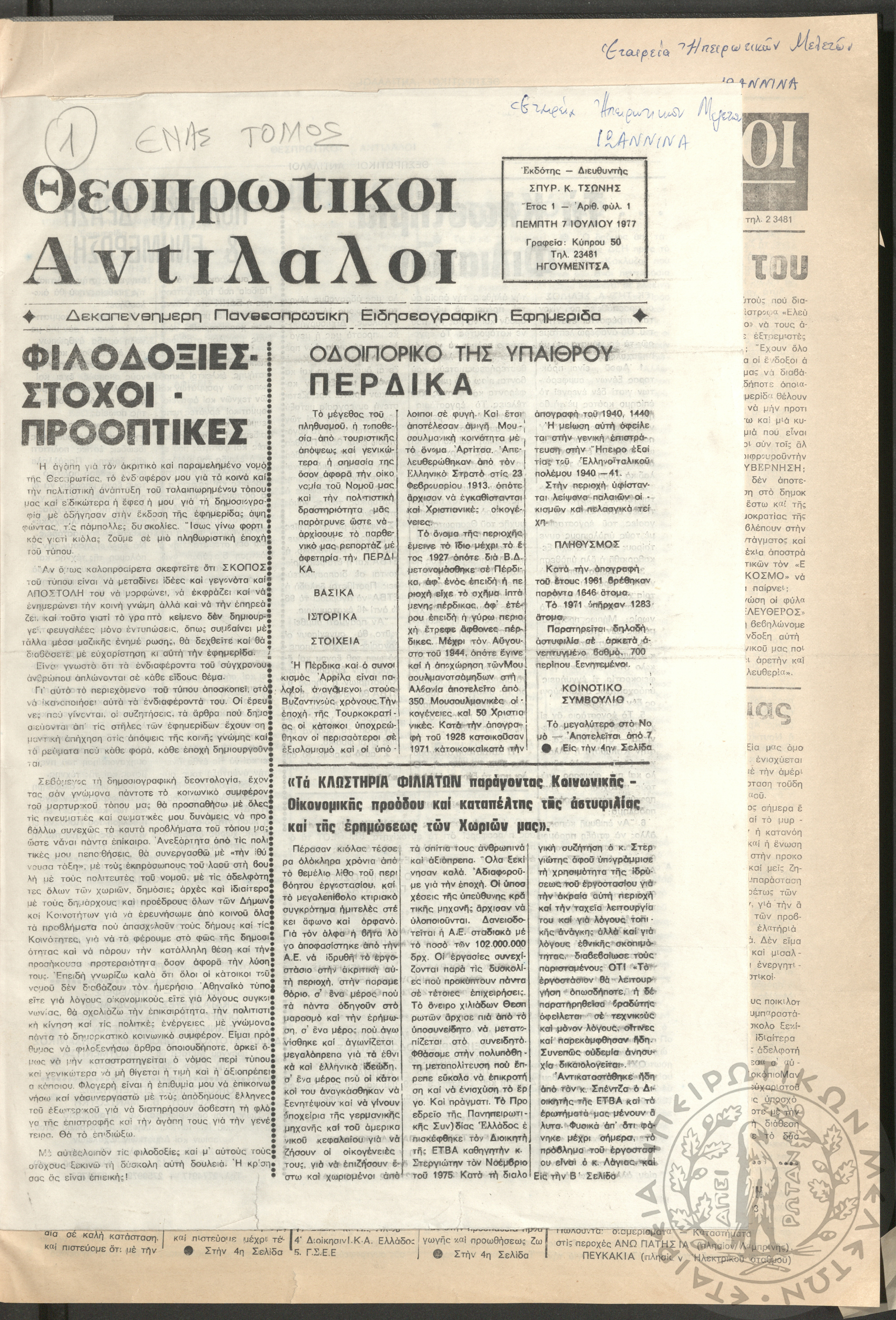 Θεσπρωτικοί Αντίλαλοι: Δεκαπενθήμερη Πανθεσπρωτική Ειδησεογραφική Εφημερίδα, 1977, φ. 1Έτος 1, φ. 1...