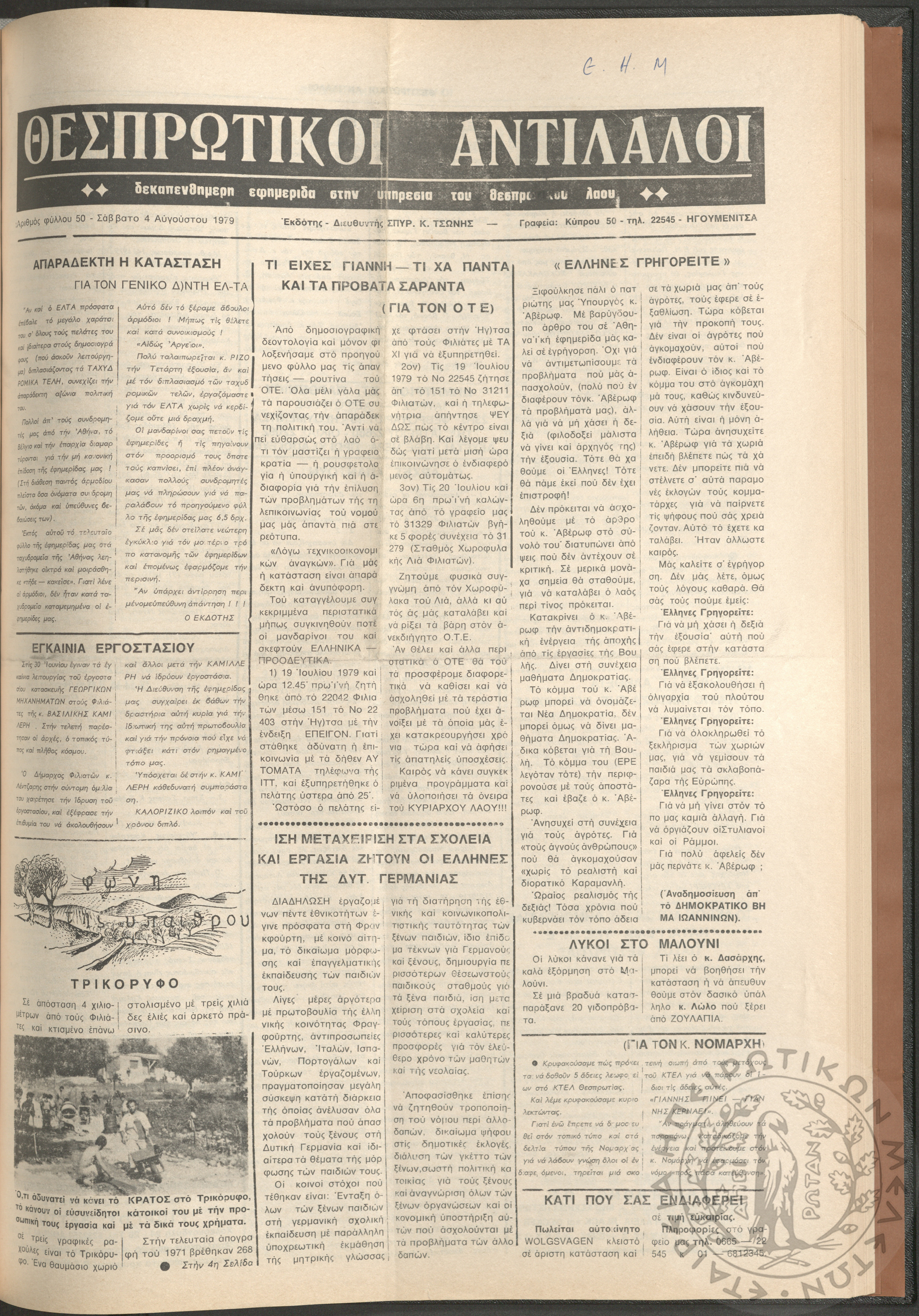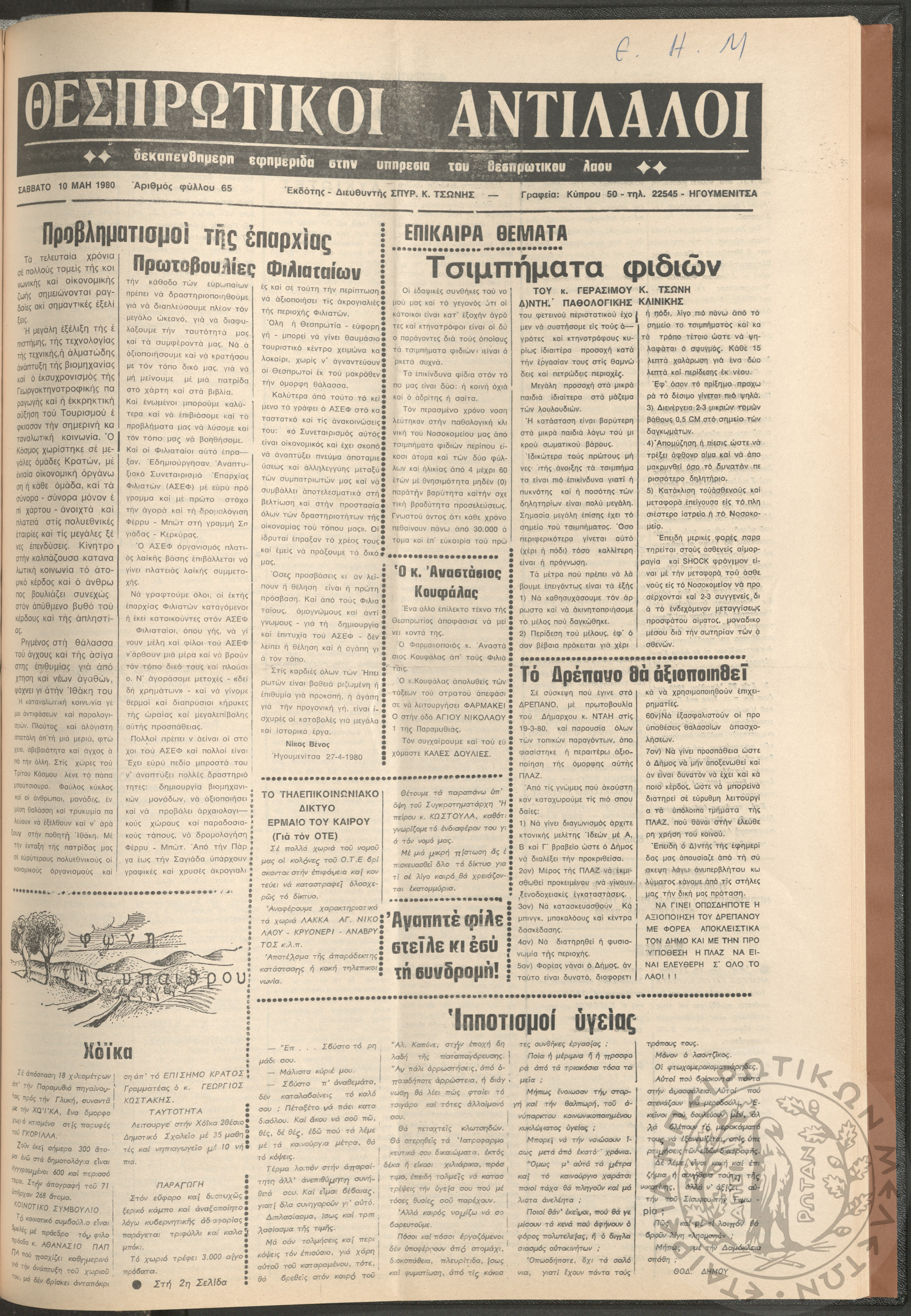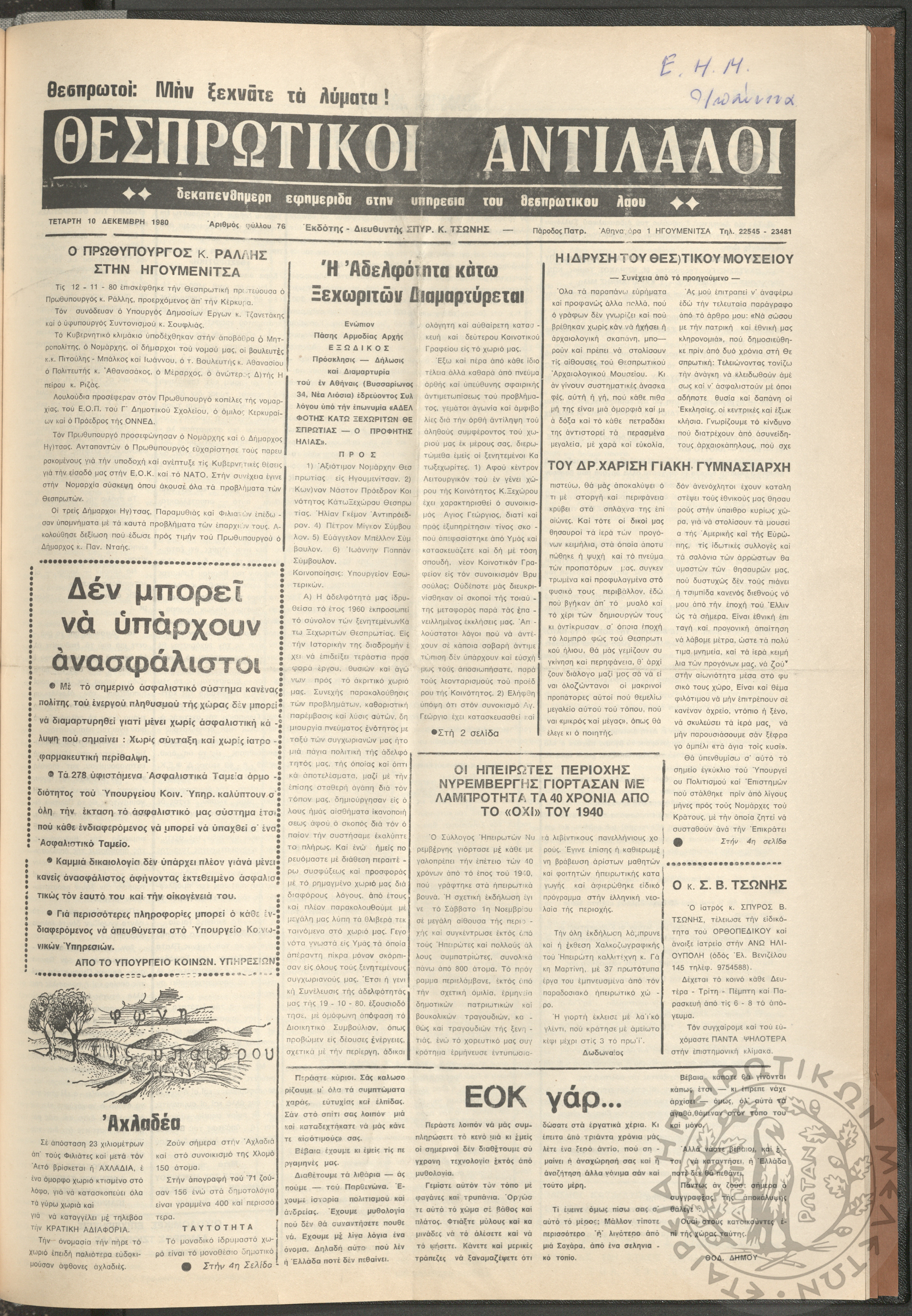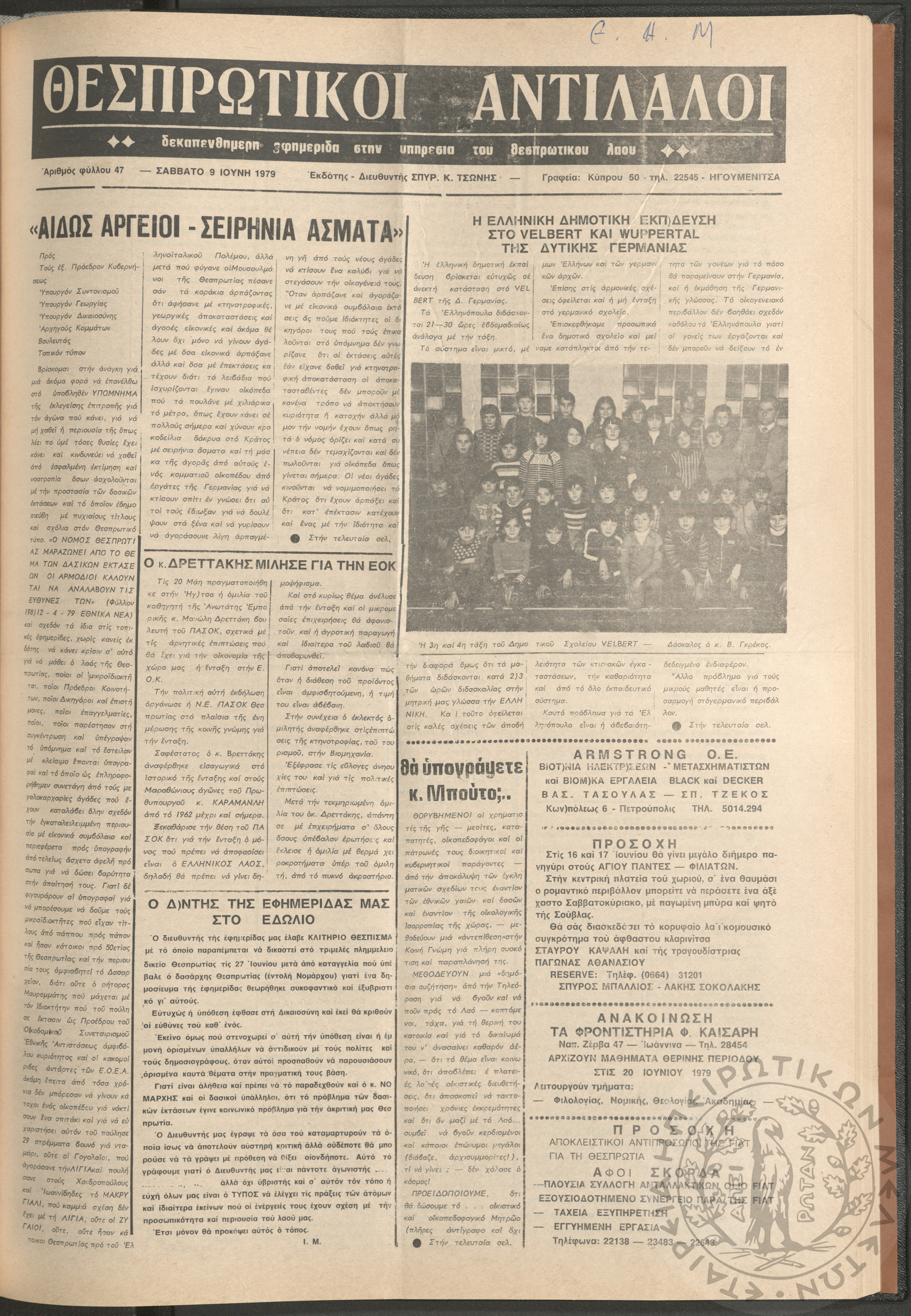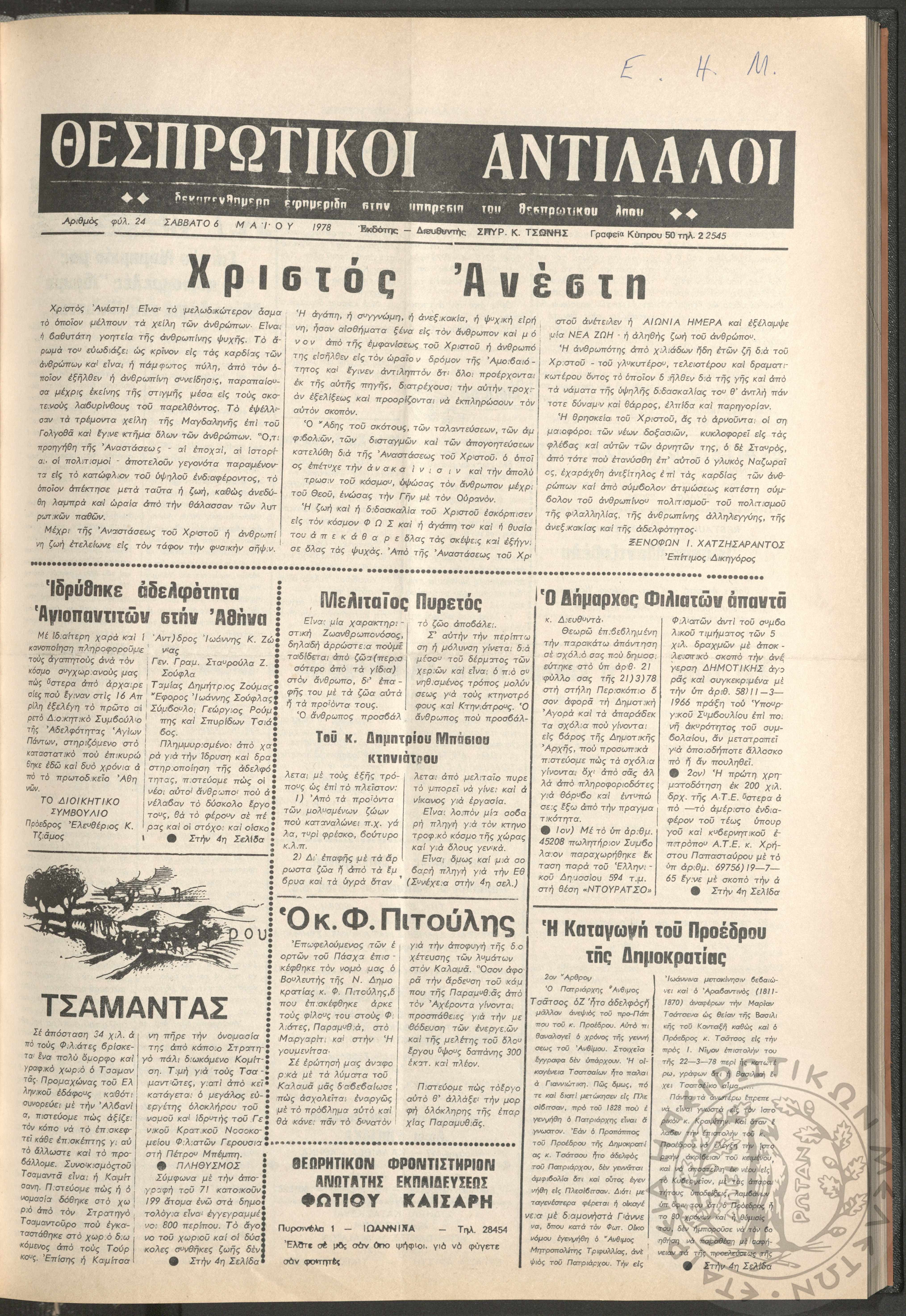 Θεσπρωτικοί Αντίλαλοι: Δεκαπενθήμερη Πανθεσπρωτική Ειδησεογραφική Εφημερίδα, 1977, φ. 1Έτος 1, φ. 1...
