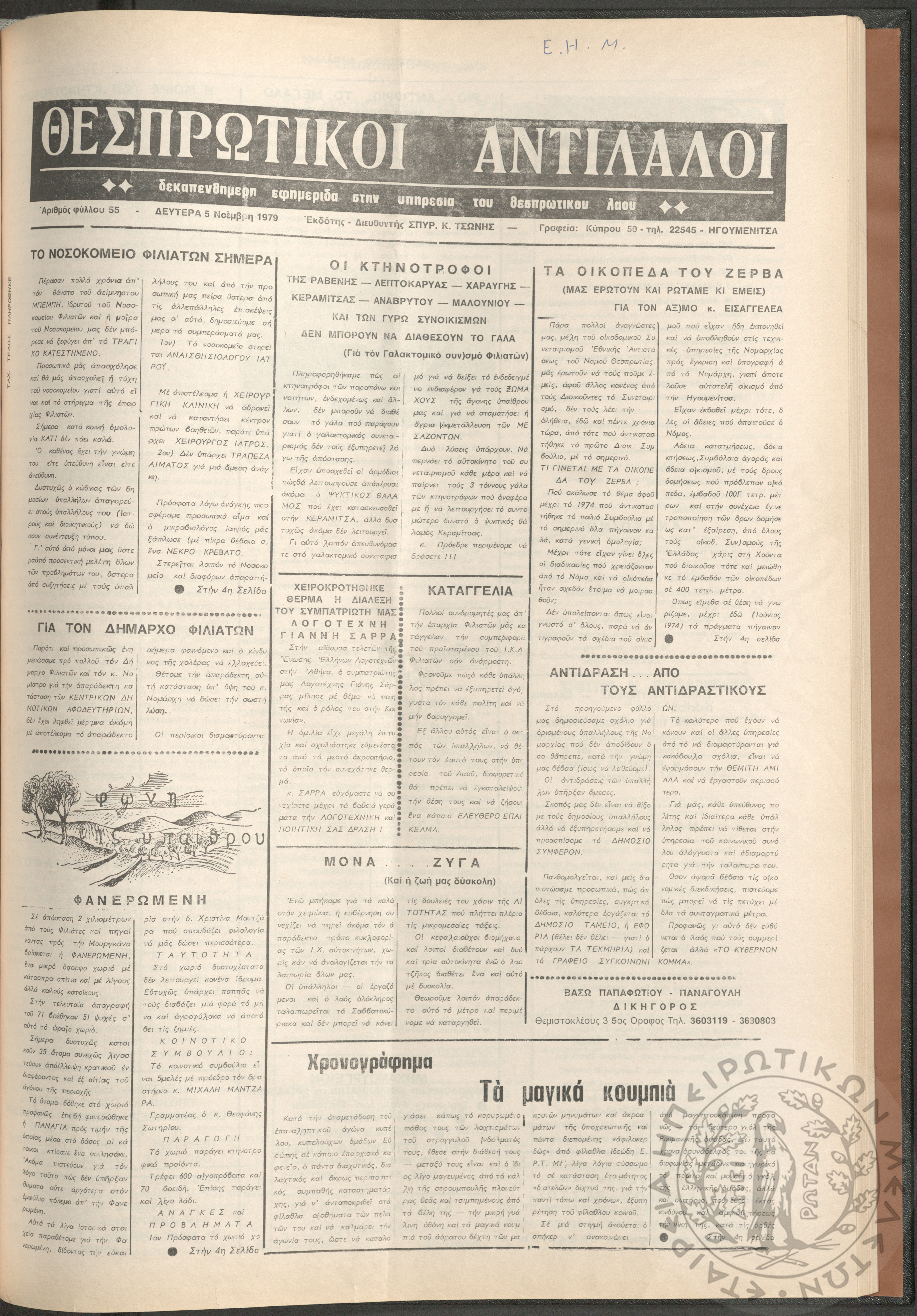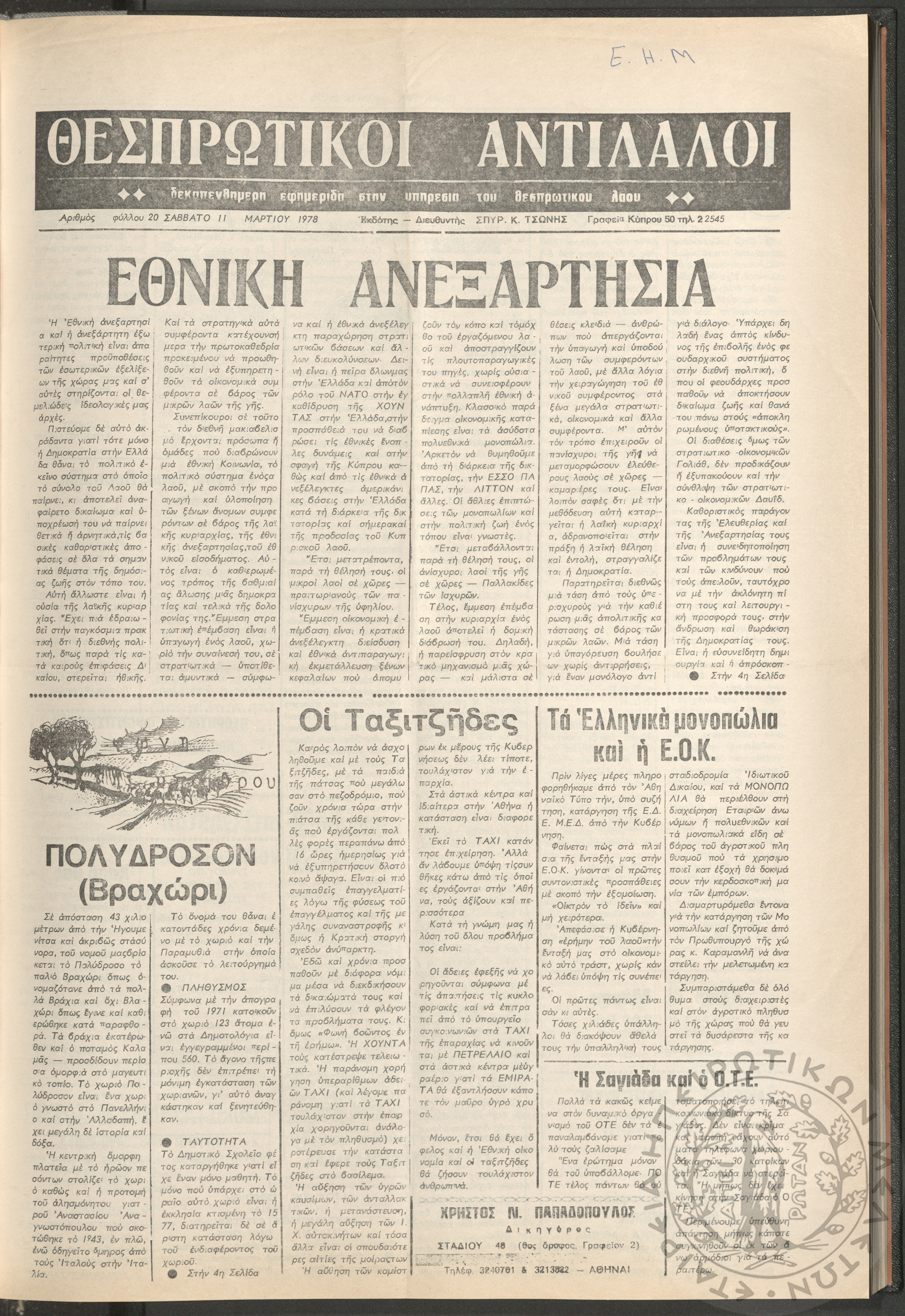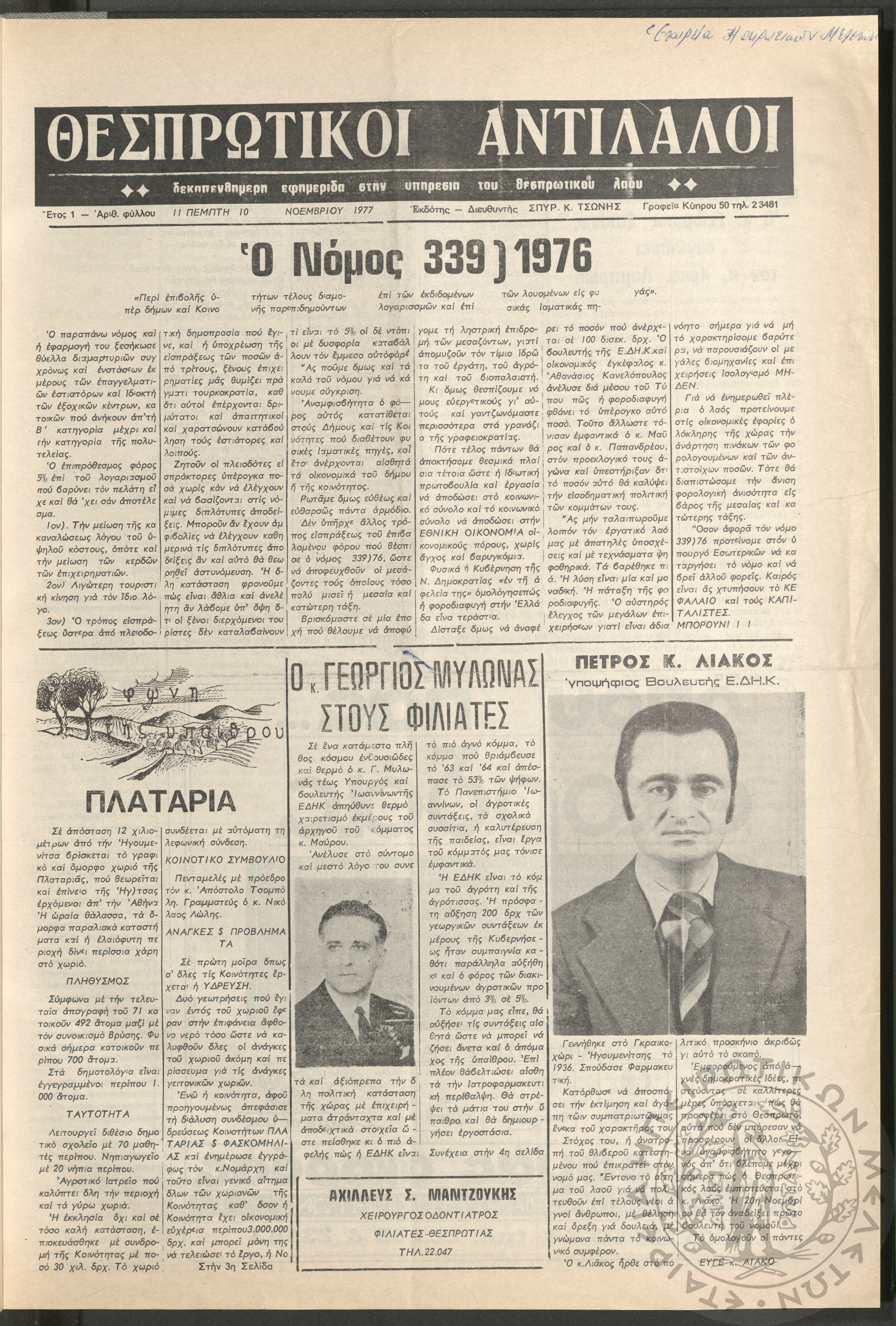 Θεσπρωτικοί Αντίλαλοι: Δεκαπενθήμερη εφημερίδα στην υπηρεσία του Θεσπρωτικού λαού, 1977, φ. 11Έτος 1, φ. 11...