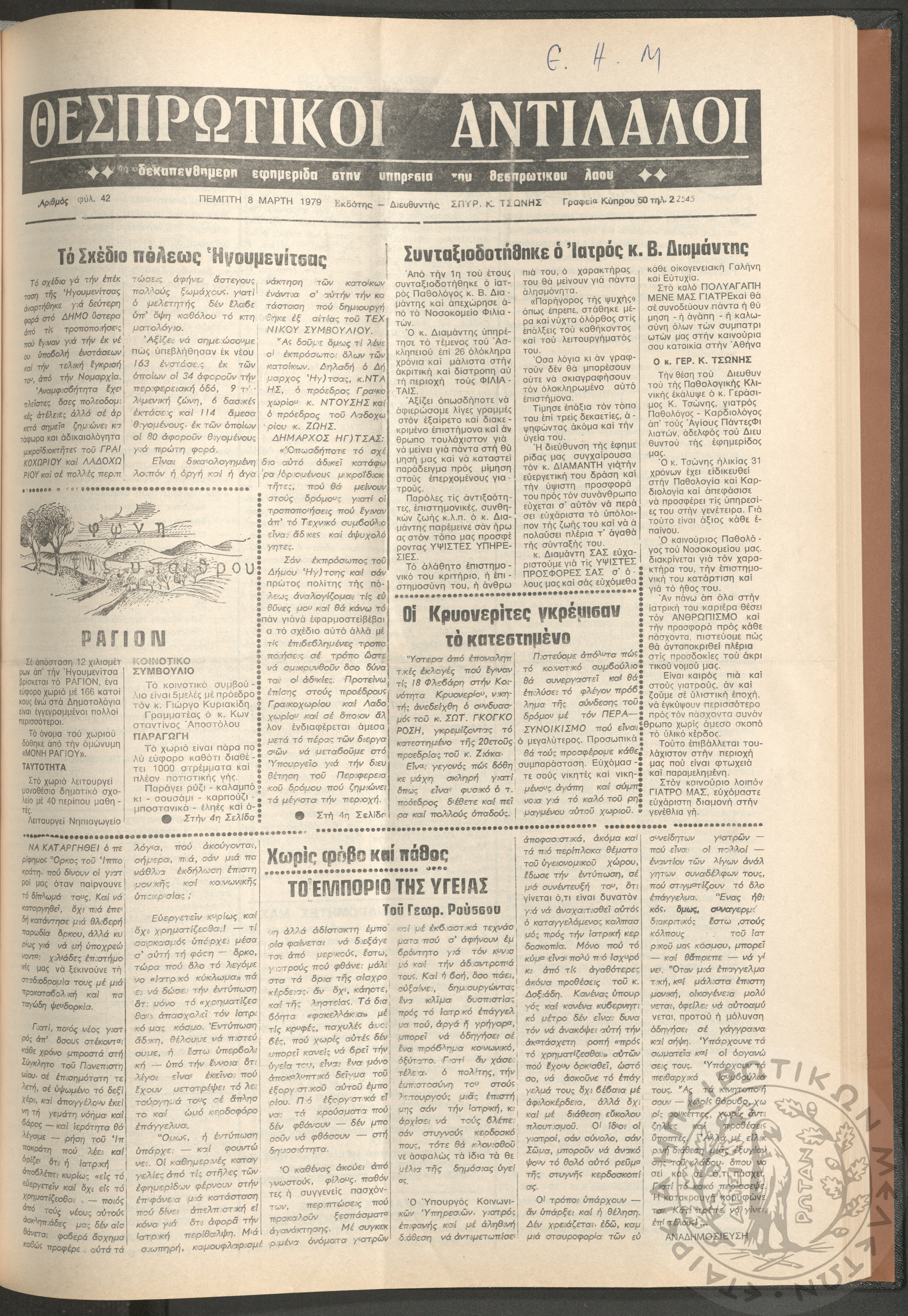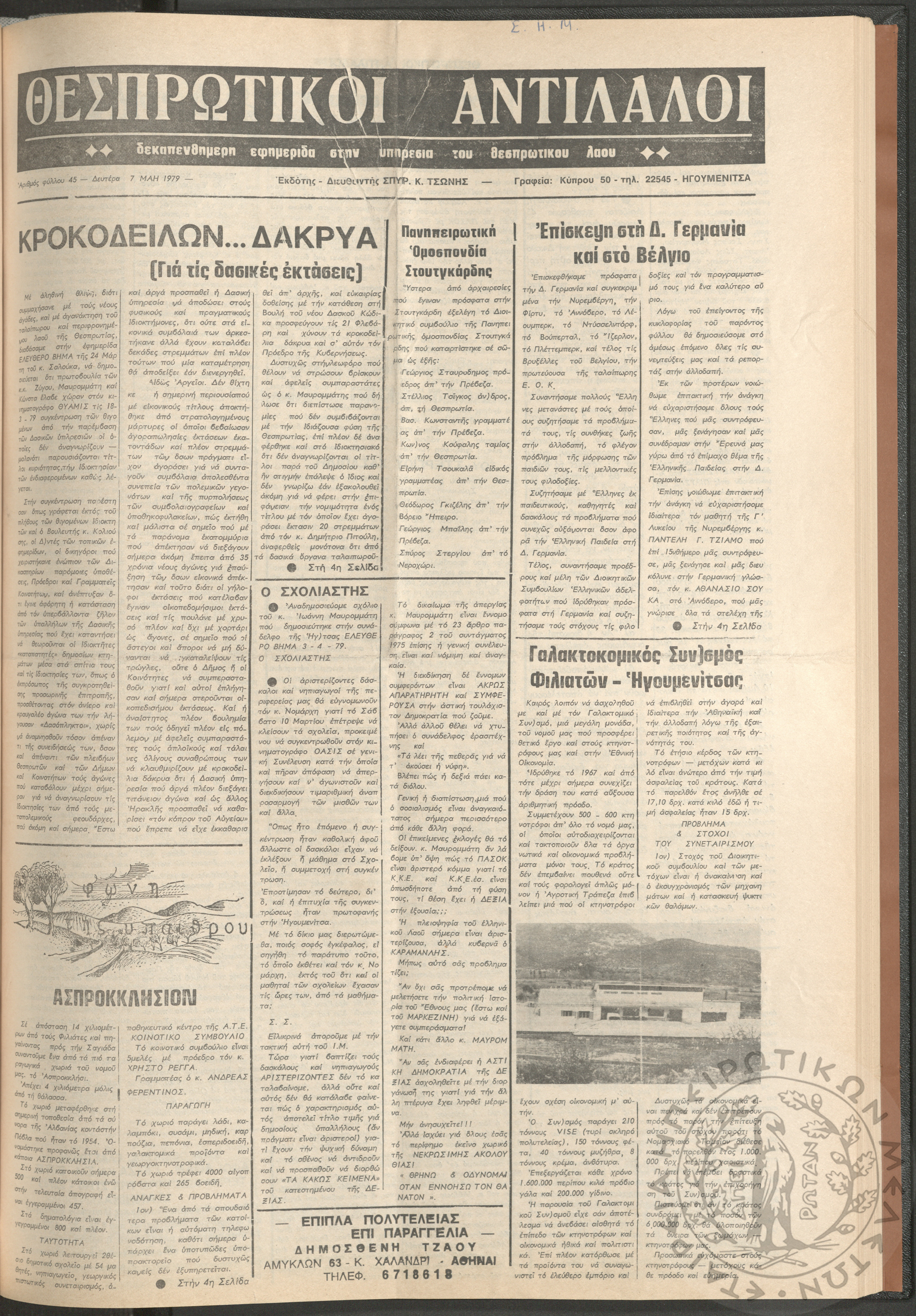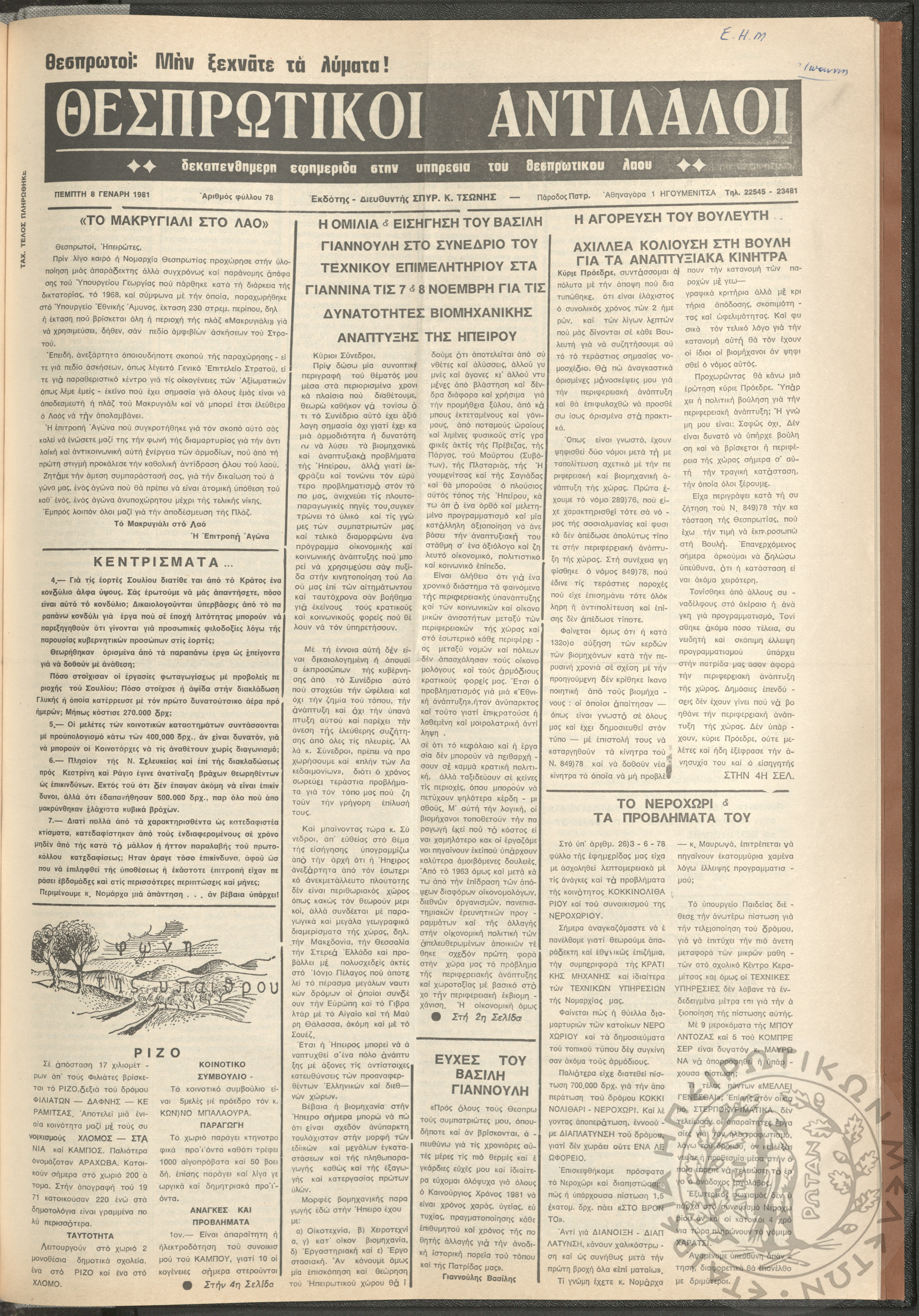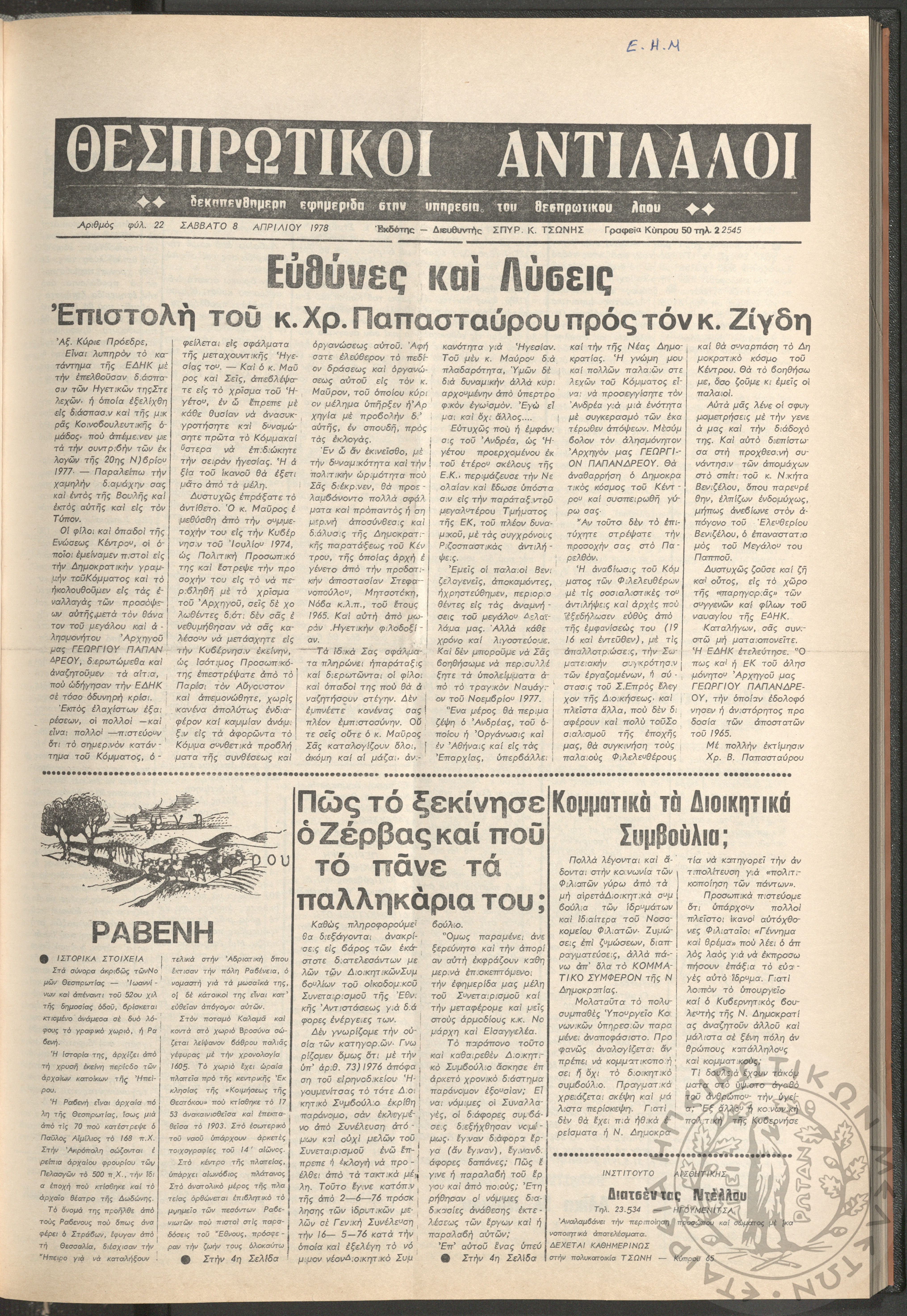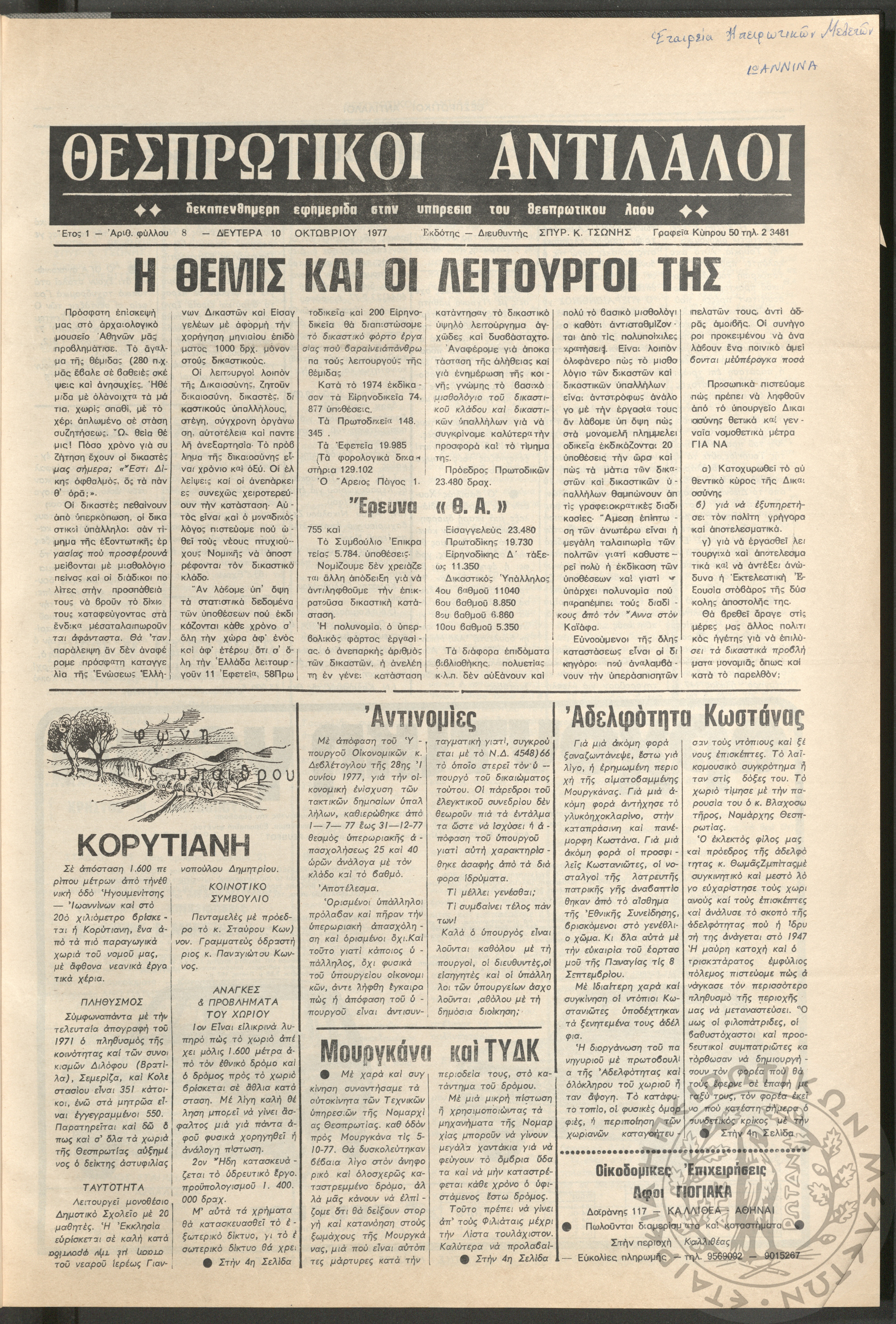 Θεσπρωτικοί Αντίλαλοι: Δεκαπενθήμερη εφημερίδα στην υπηρεσία του Θεσπρωτικού λαού, 1977, φ. 8Έτος 1, φ. 8...