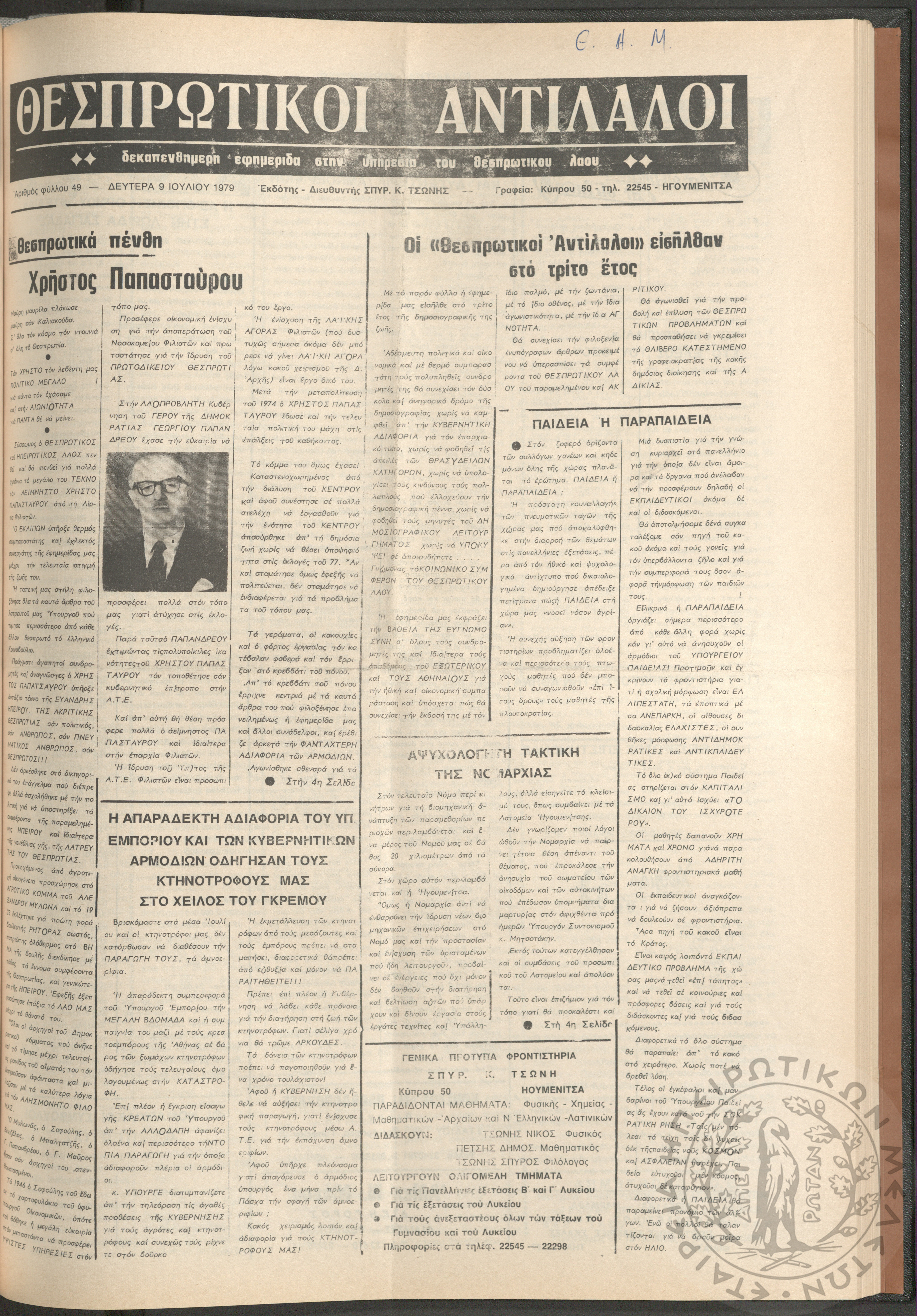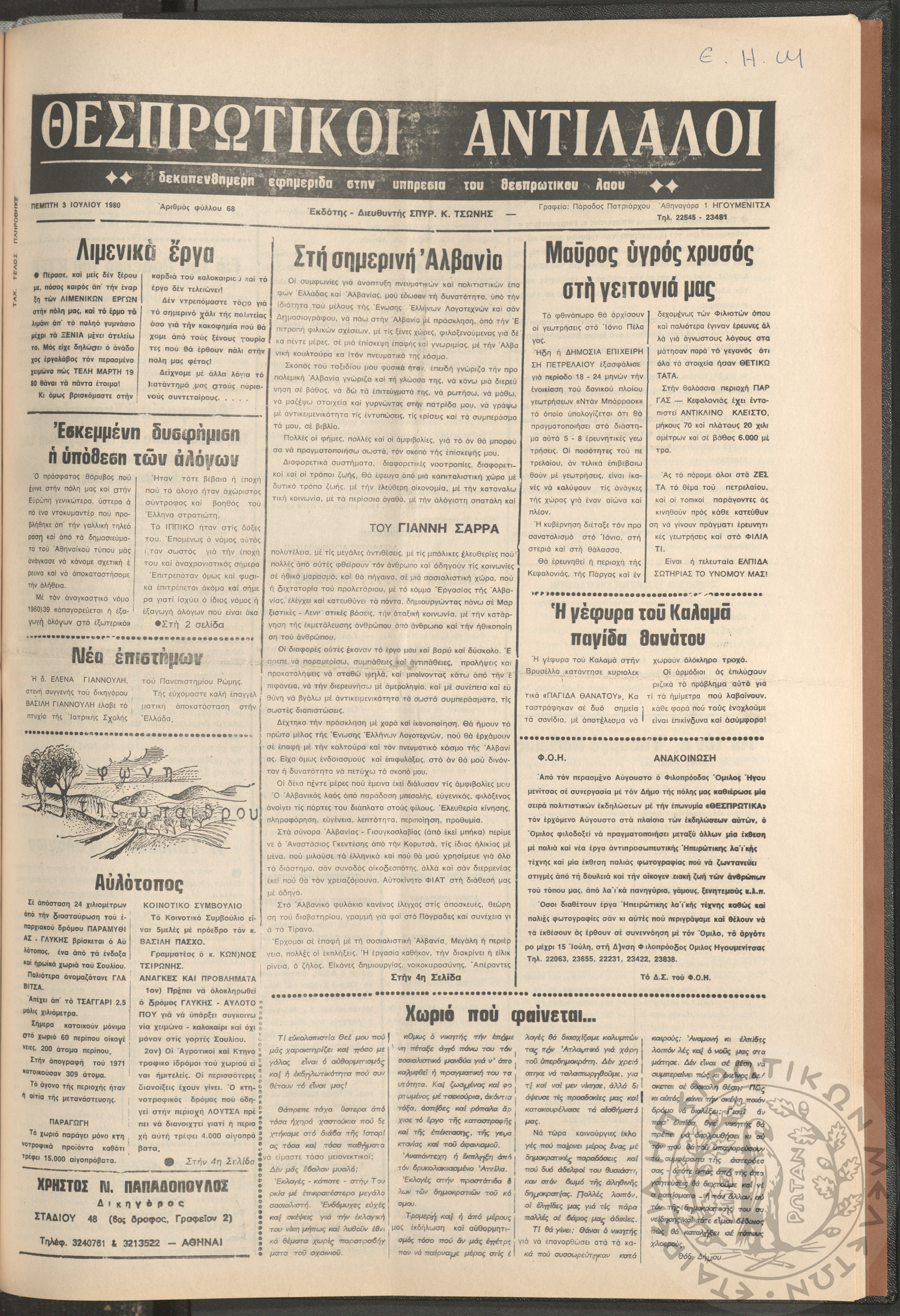 Θεσπρωτικοί Αντίλαλοι: Δεκαπενθήμερη Πανθεσπρωτική Ειδησεογραφική Εφημερίδα, 1977, φ. 3Έτος 1, φ. 3...
