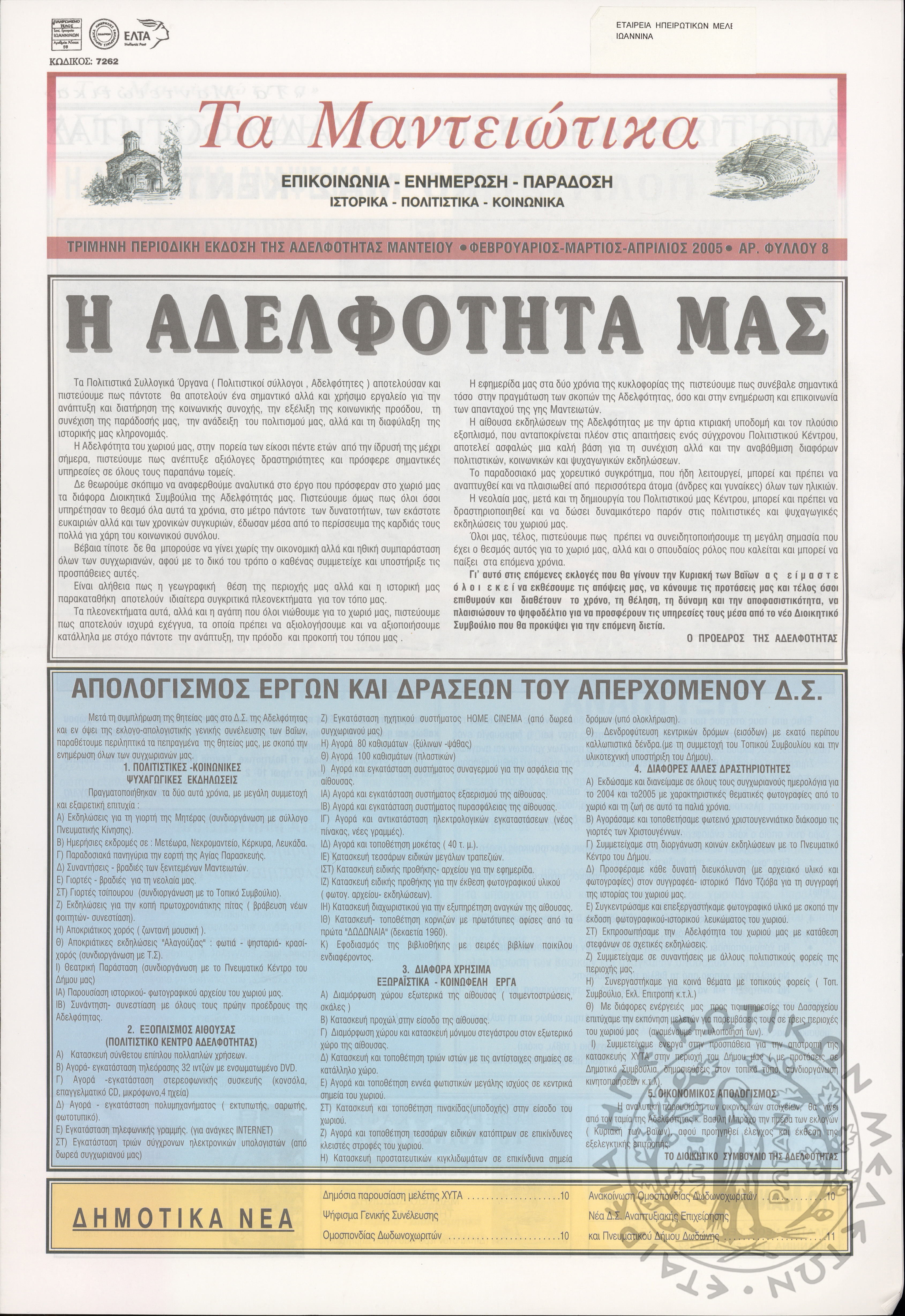Τα Μαντειώτικα: επικοινωνία-ενημέρωση-παράδοση-ιστορικά-πολιτιστικά-κοινωνικά: τρίμηνη περιοδική έκδοση της Αδελφότητας Μαντείου, 2005, φ. 8...