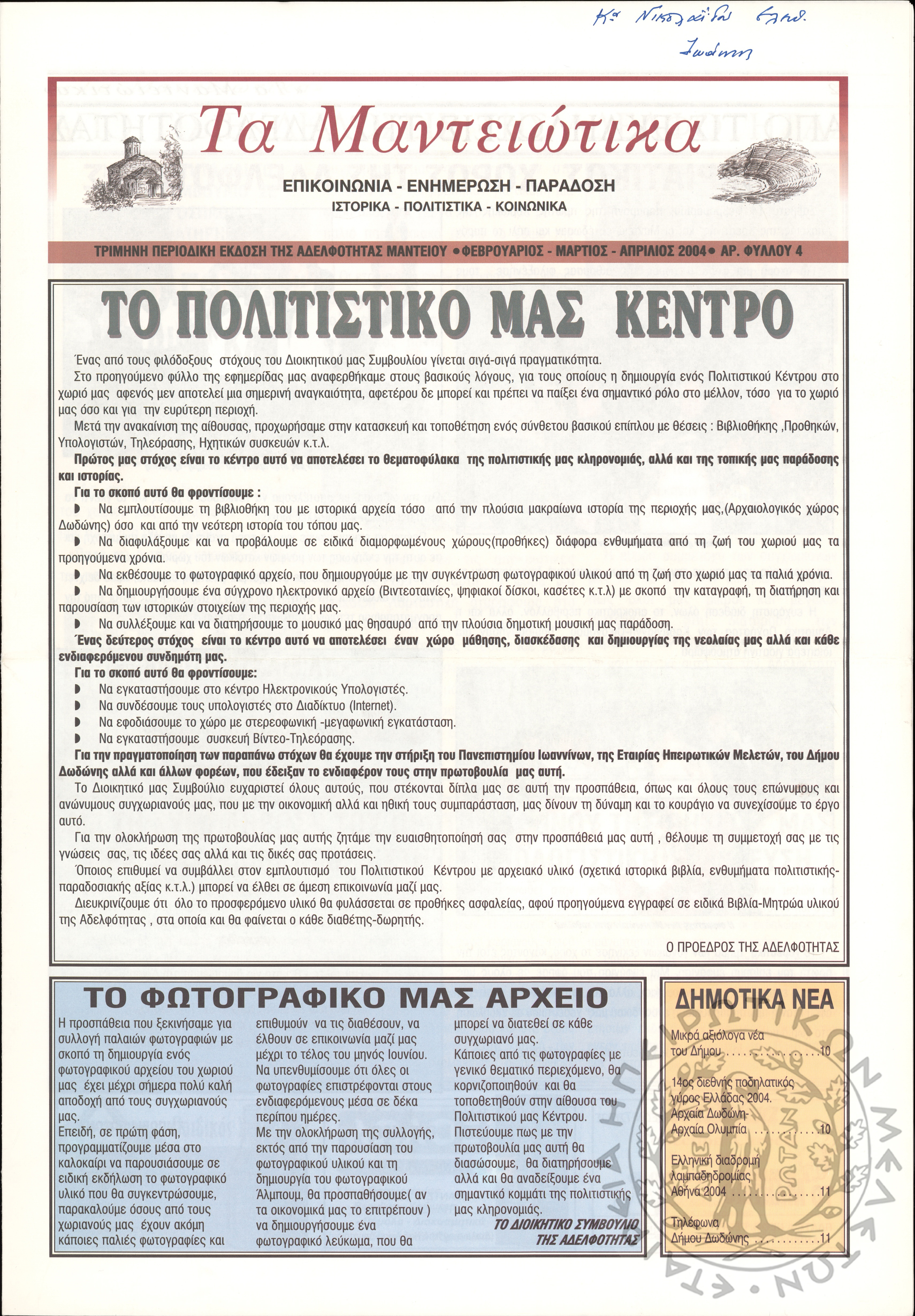 Τα Μαντειώτικα: επικοινωνία-ενημέρωση-παράδοση-ιστορικά-πολιτιστικά-κοινωνικά: τρίμηνη περιοδική έκδοση της Αδελφότητας Μαντείου, 2004, φ. 4...