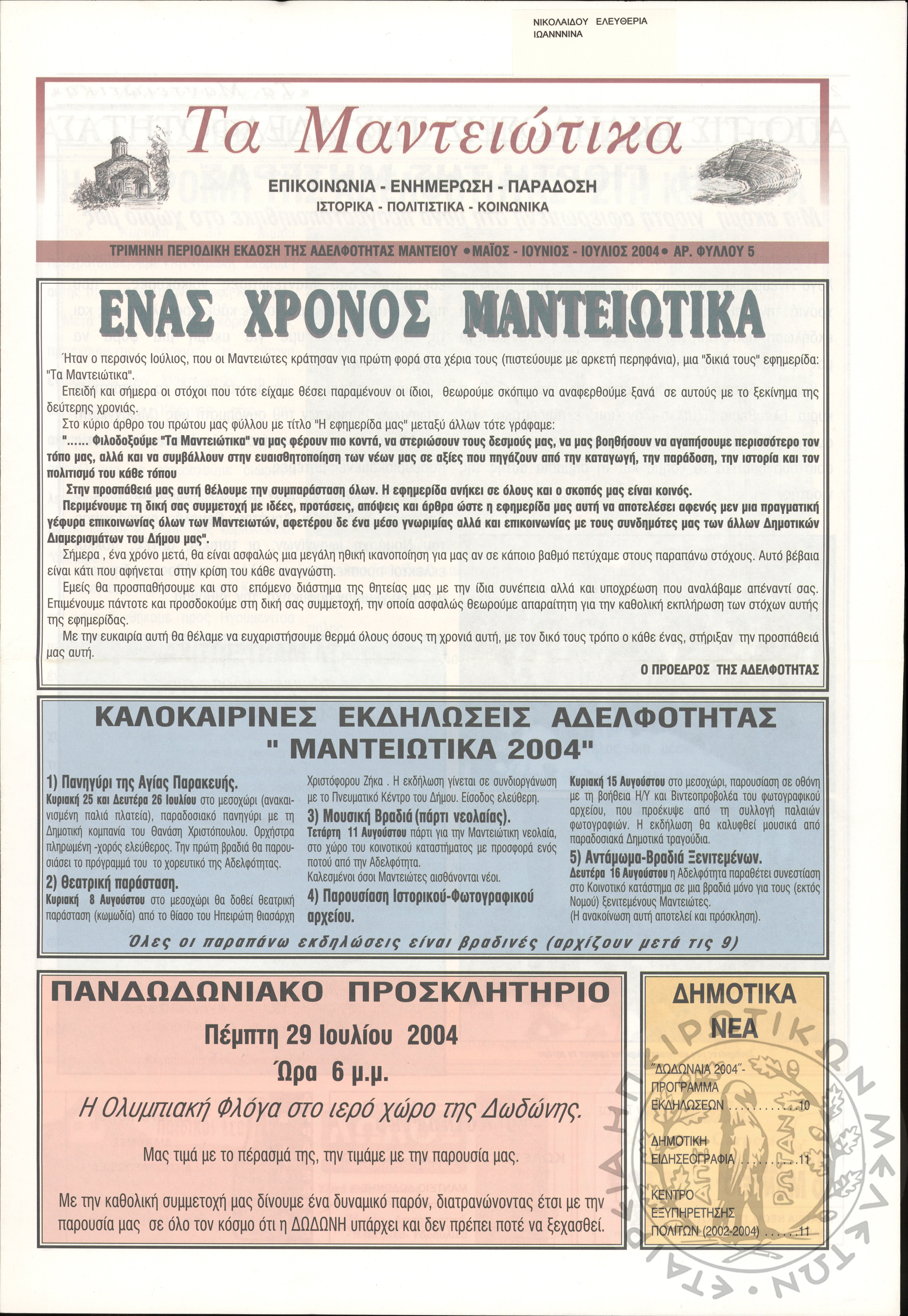 Τα Μαντειώτικα: επικοινωνία-ενημέρωση-παράδοση-ιστορικά-πολιτιστικά-κοινωνικά: τρίμηνη περιοδική έκδοση της Αδελφότητας Μαντείου, 2004, φ. 5...