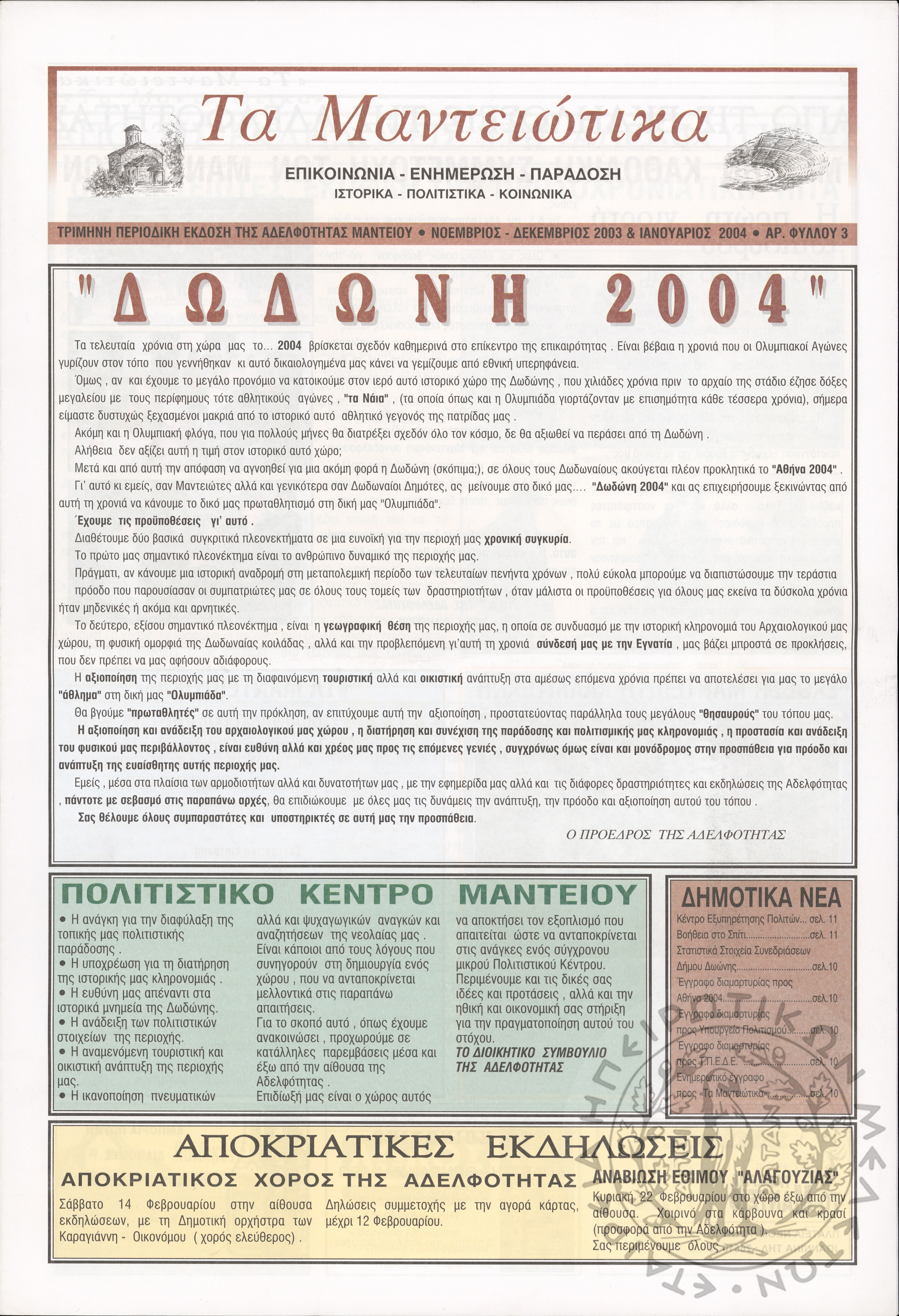 Τα Μαντειώτικα: επικοινωνία-ενημέρωση-παράδοση-ιστορικά-πολιτιστικά-κοινωνικά: τρίμηνη περιοδική έκδοση της Αδελφότητας Μαντείου, 2003-2004, φ. 3...