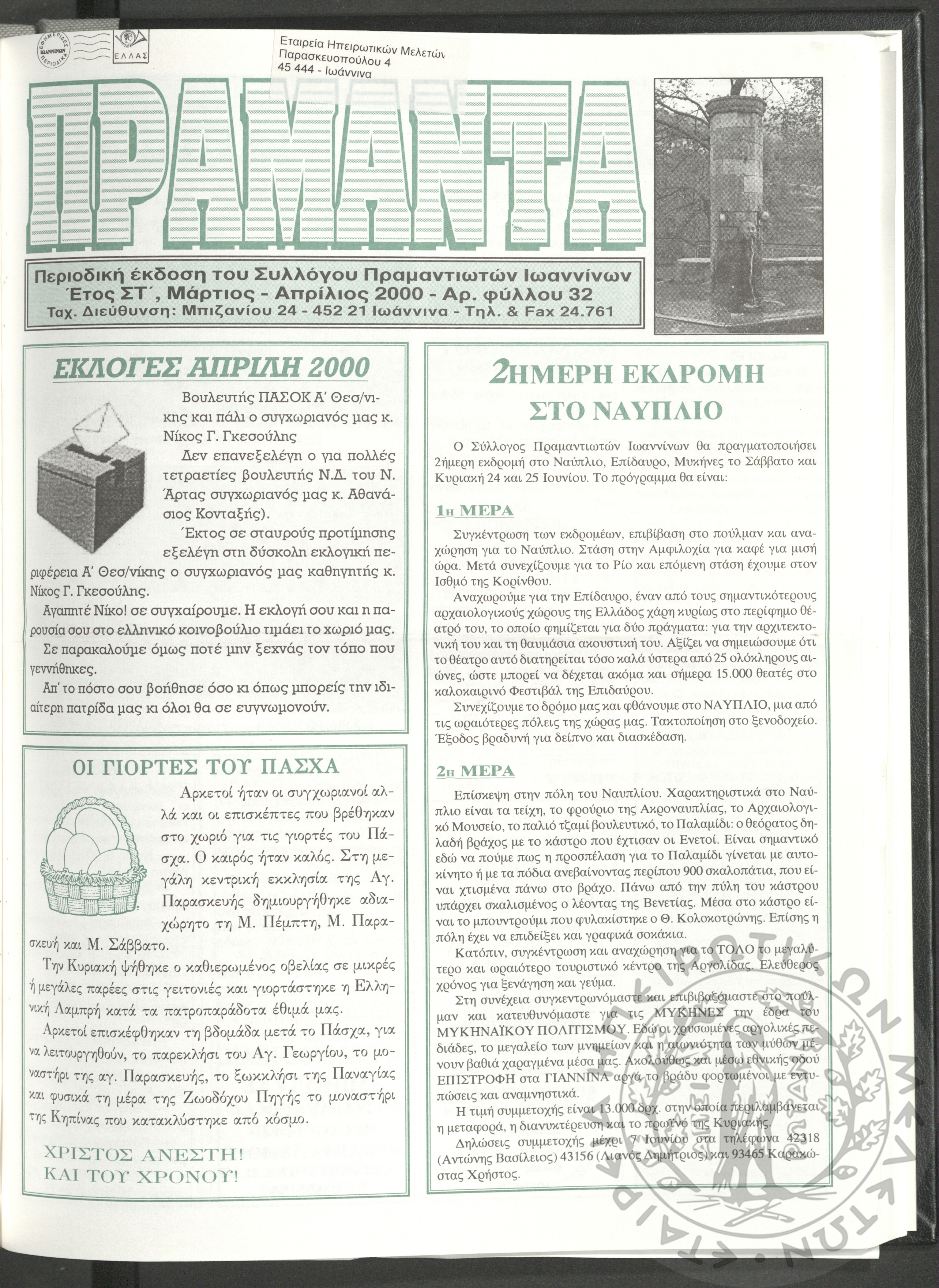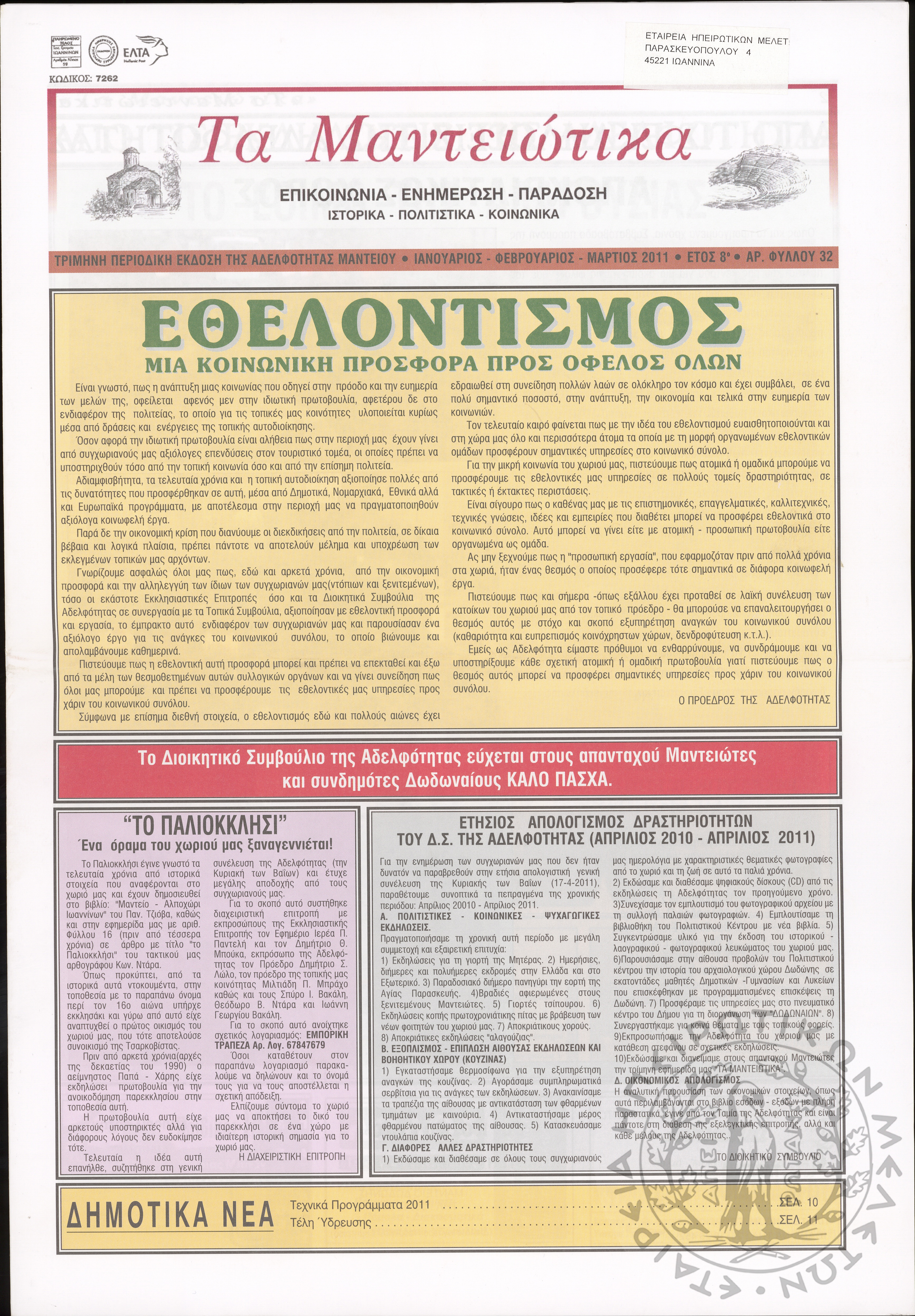Τα Μαντειώτικα: επικοινωνία-ενημέρωση-παράδοση-ιστορικά-πολιτιστικά-κοινωνικά: τρίμηνη περιοδική έκδοση της Αδελφότητας Μαντείου, 2011, φ. 32Έτος 8ο, αρ. φ. 32...