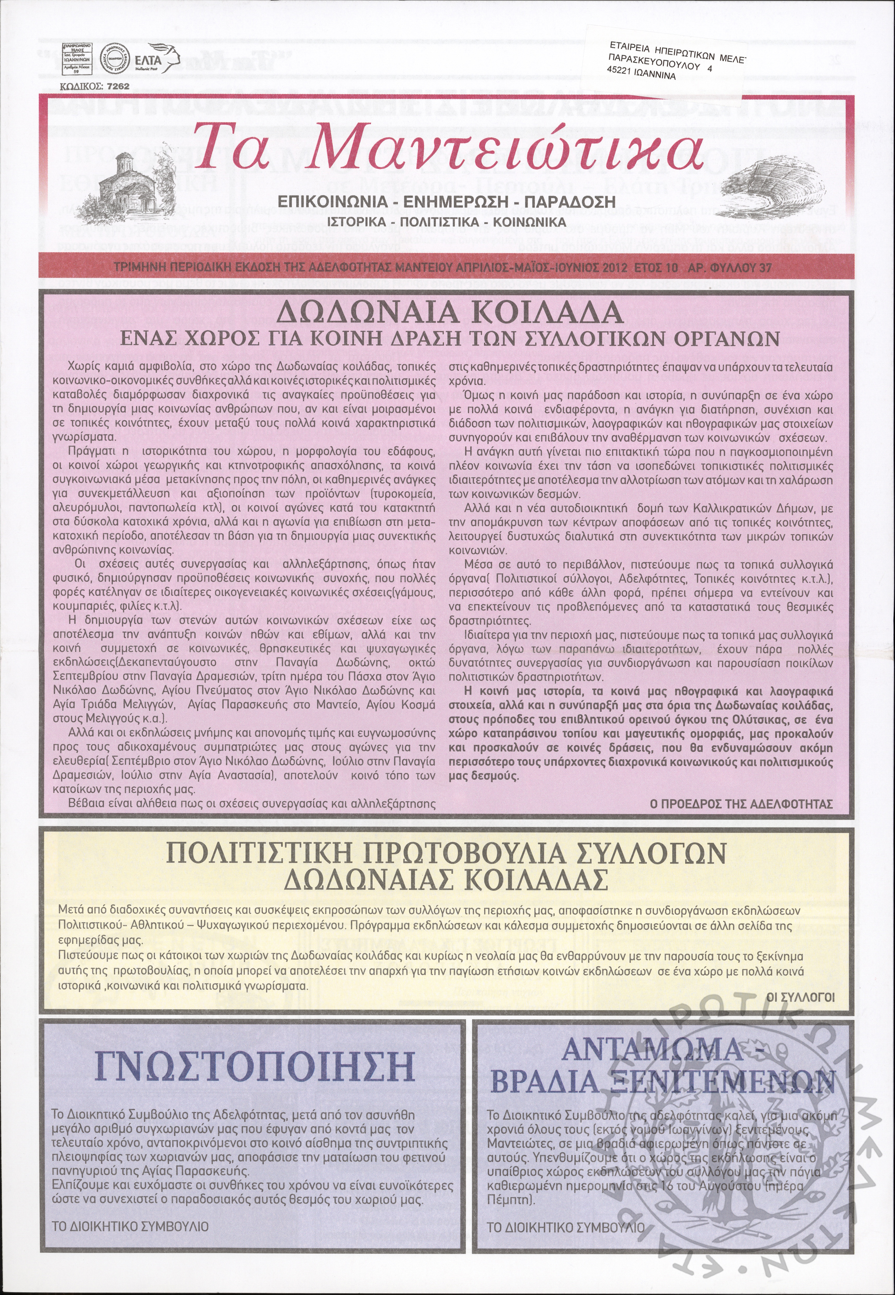 Τα Μαντειώτικα: επικοινωνία-ενημέρωση-παράδοση-ιστορικά-πολιτιστικά-κοινωνικά: τρίμηνη περιοδική έκδοση της Αδελφότητας Μαντείου, 2012, φ. 37Έτος 10ο, αρ. φ. 37...