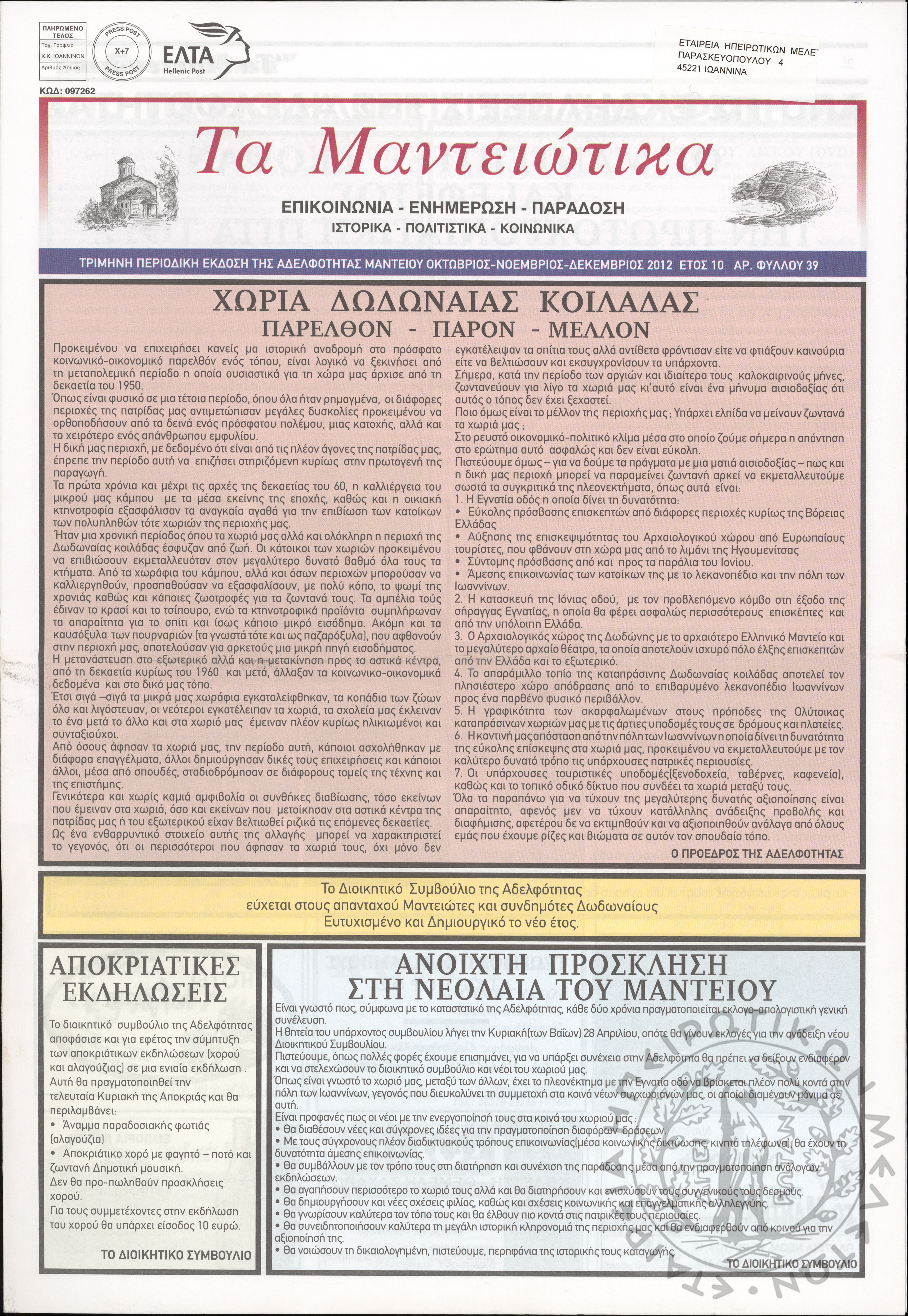Τα Μαντειώτικα: επικοινωνία-ενημέρωση-παράδοση-ιστορικά-πολιτιστικά-κοινωνικά: τρίμηνη περιοδική έκδοση της Αδελφότητας Μαντείου, 2012, φ. 39Έτος 10ο, αρ. φ. 39...
