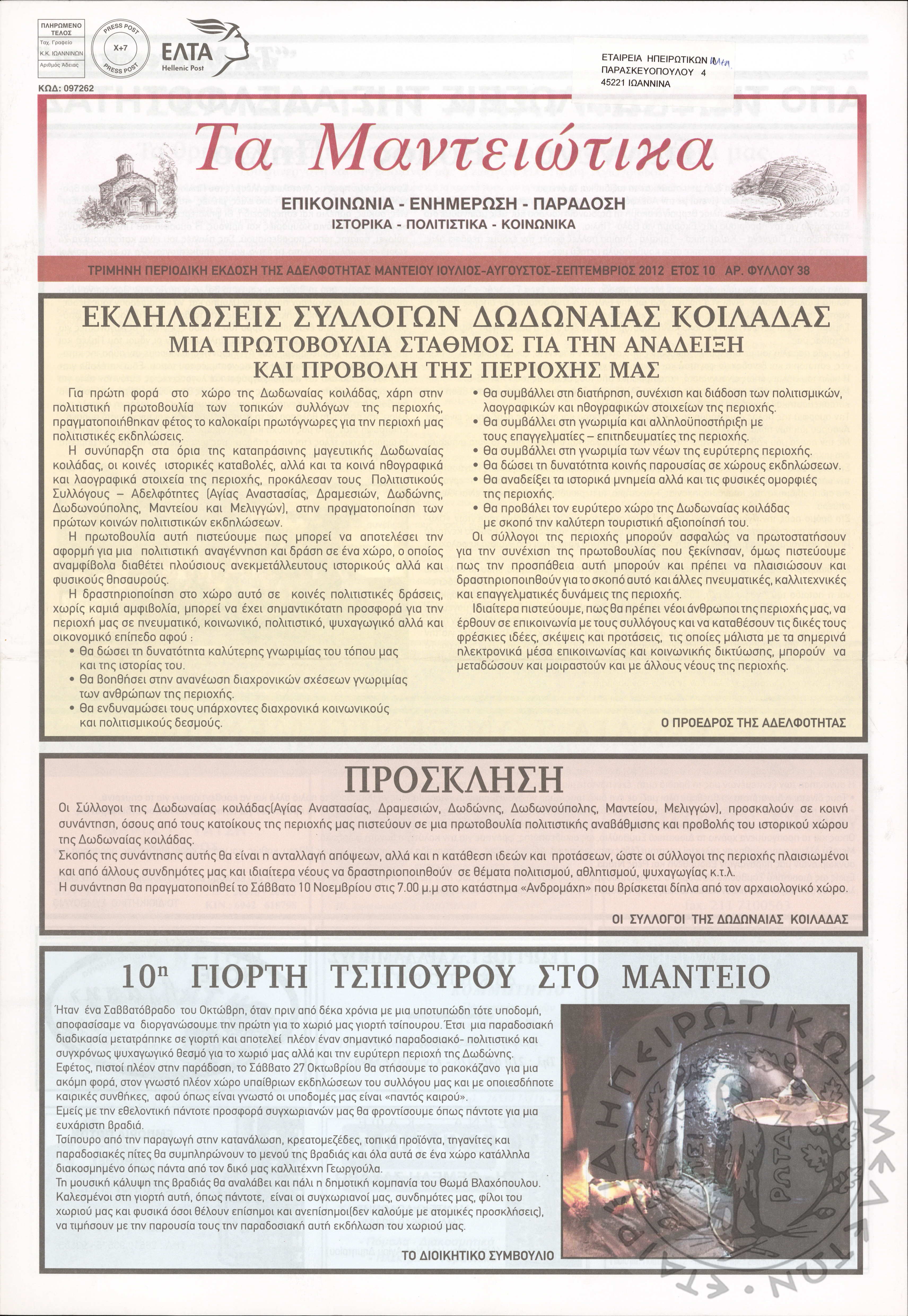 Τα Μαντειώτικα: επικοινωνία-ενημέρωση-παράδοση-ιστορικά-πολιτιστικά-κοινωνικά: τρίμηνη περιοδική έκδοση της Αδελφότητας Μαντείου, 2012, φ. 38Έτος 10ο, αρ. φ. 38...