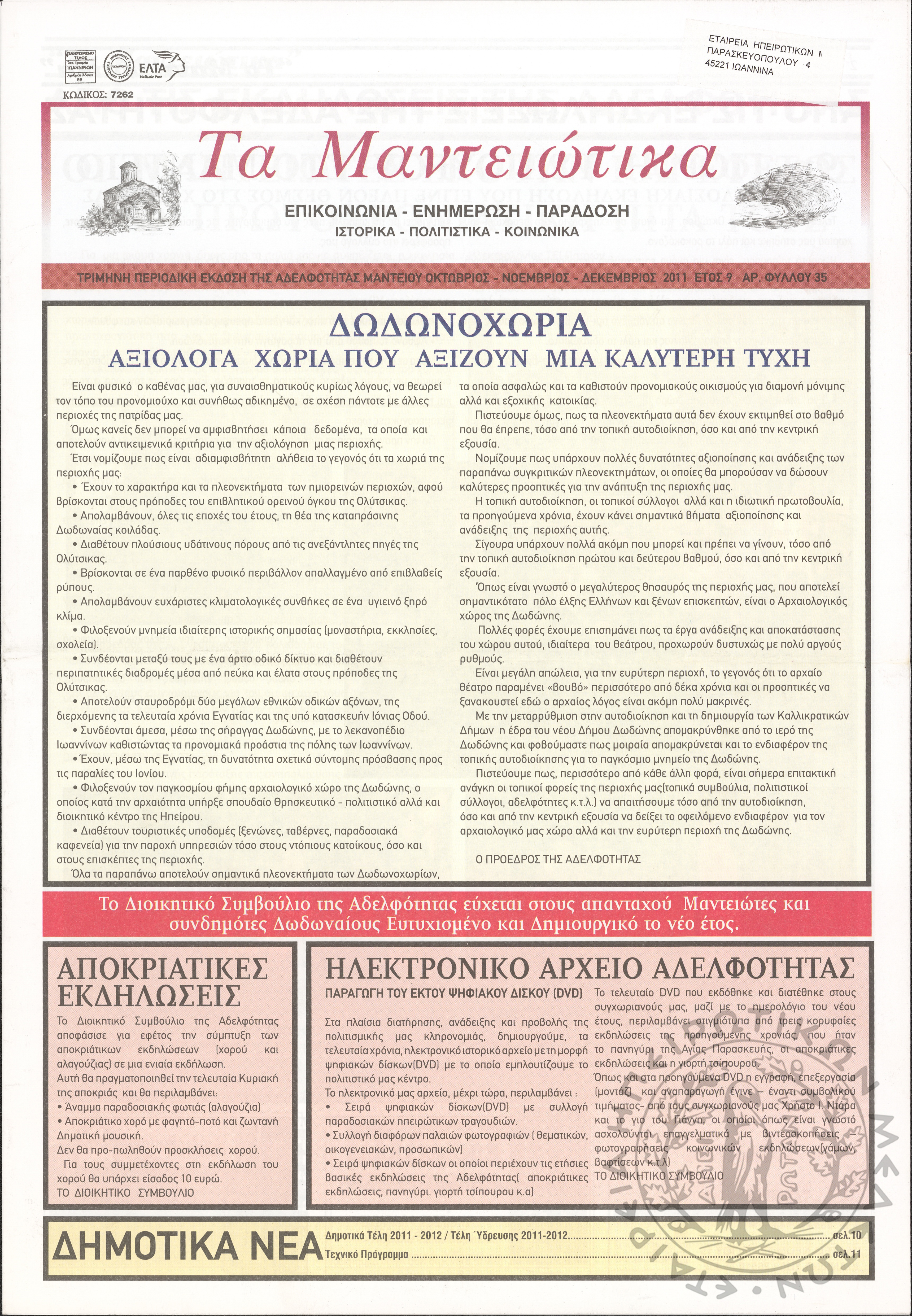 Τα Μαντειώτικα: επικοινωνία-ενημέρωση-παράδοση-ιστορικά-πολιτιστικά-κοινωνικά: τρίμηνη περιοδική έκδοση της Αδελφότητας Μαντείου, 2011, φ. 35Έτος 9ο, αρ. φ. 35...