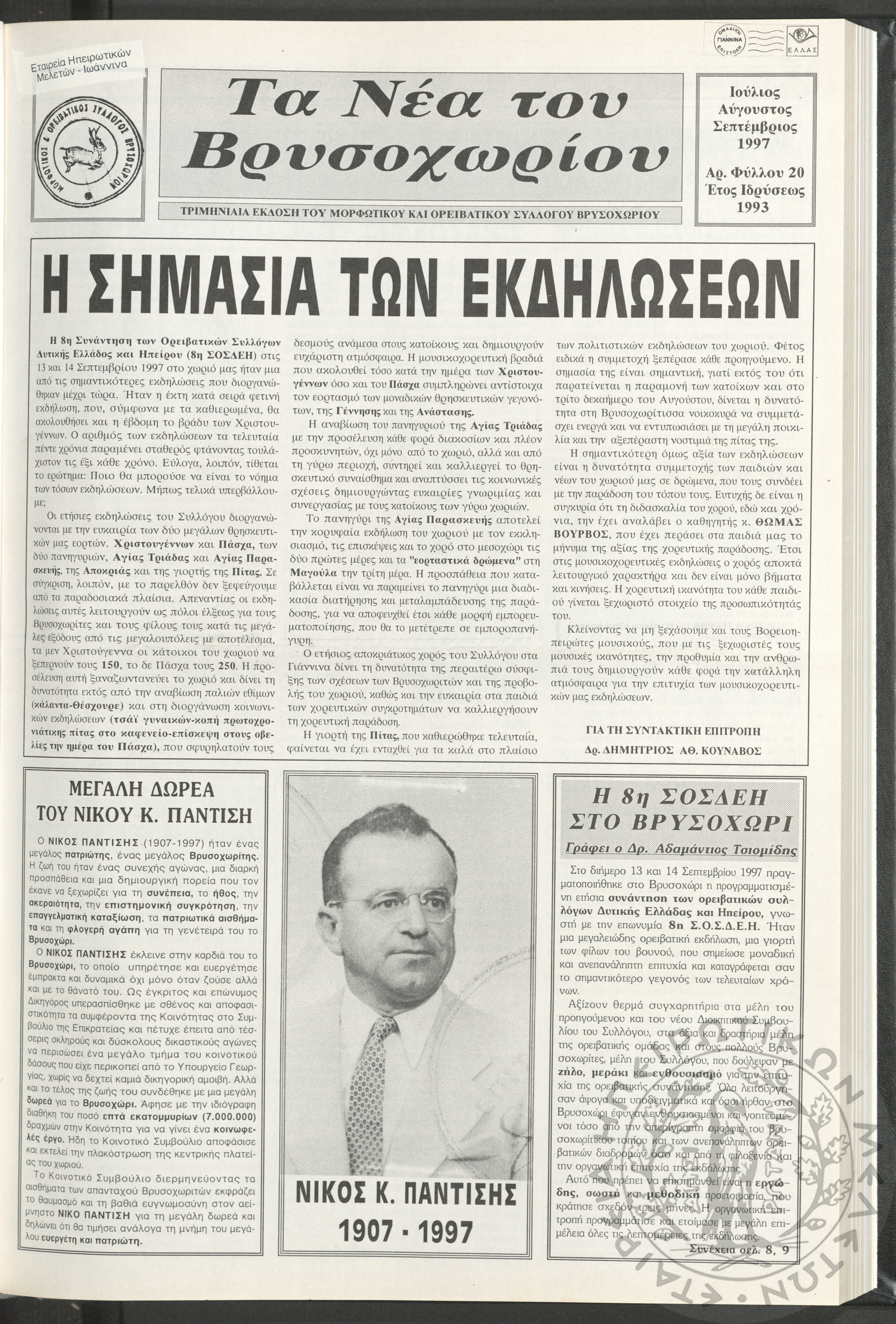 Τα Νέα του Βρυσοχωρίου: τριμηνιαία περιοδική έκδοση του Μορφωτικού και Ορειβατικού Συλλόγου Βρυσοχωρίου, 1997, φ. 20...