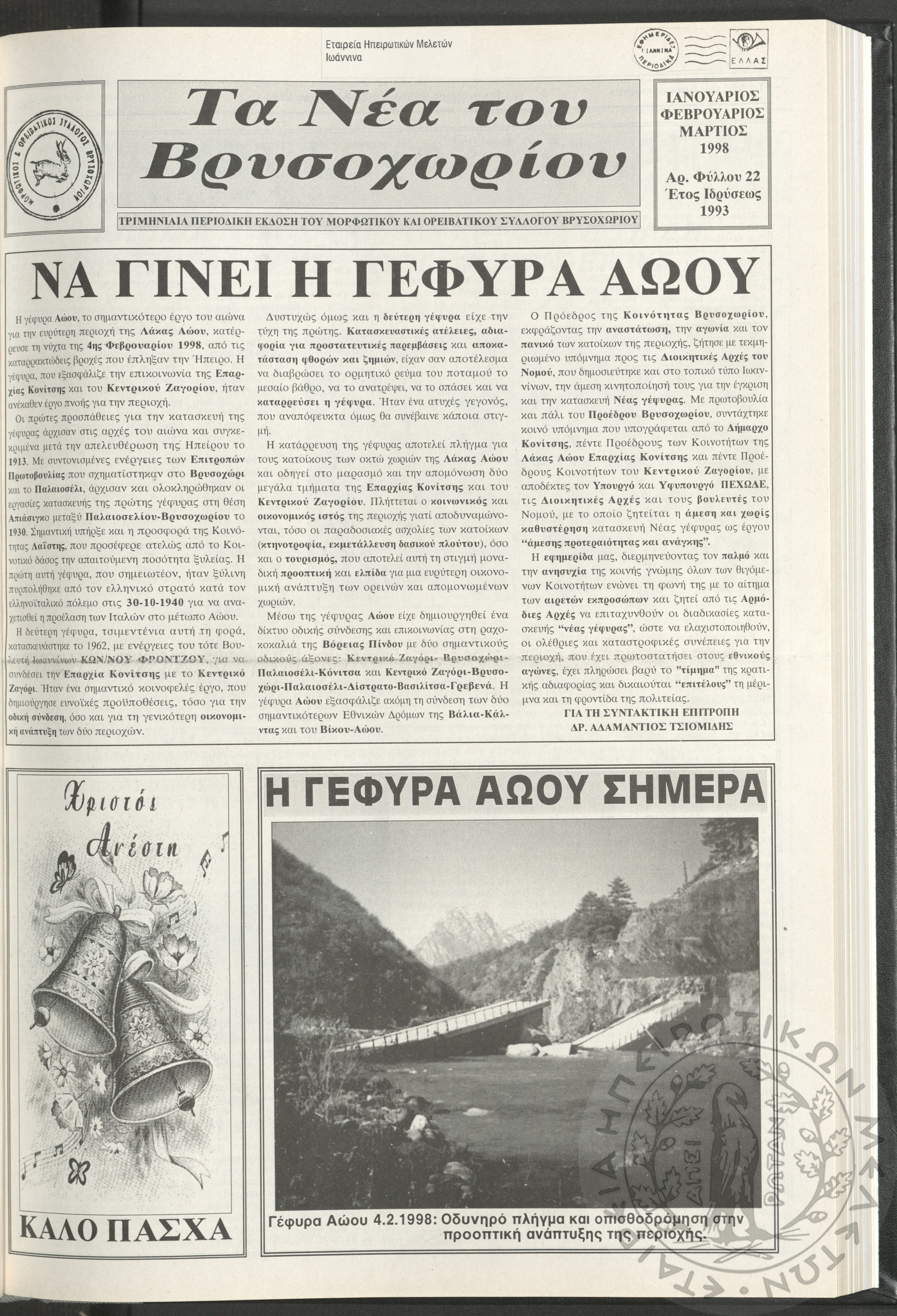 Τα Νέα του Βρυσοχωρίου: τριμηνιαία περιοδική έκδοση του Μορφωτικού και Ορειβατικού Συλλόγου Βρυσοχωρίου, 1998, φ. 22...