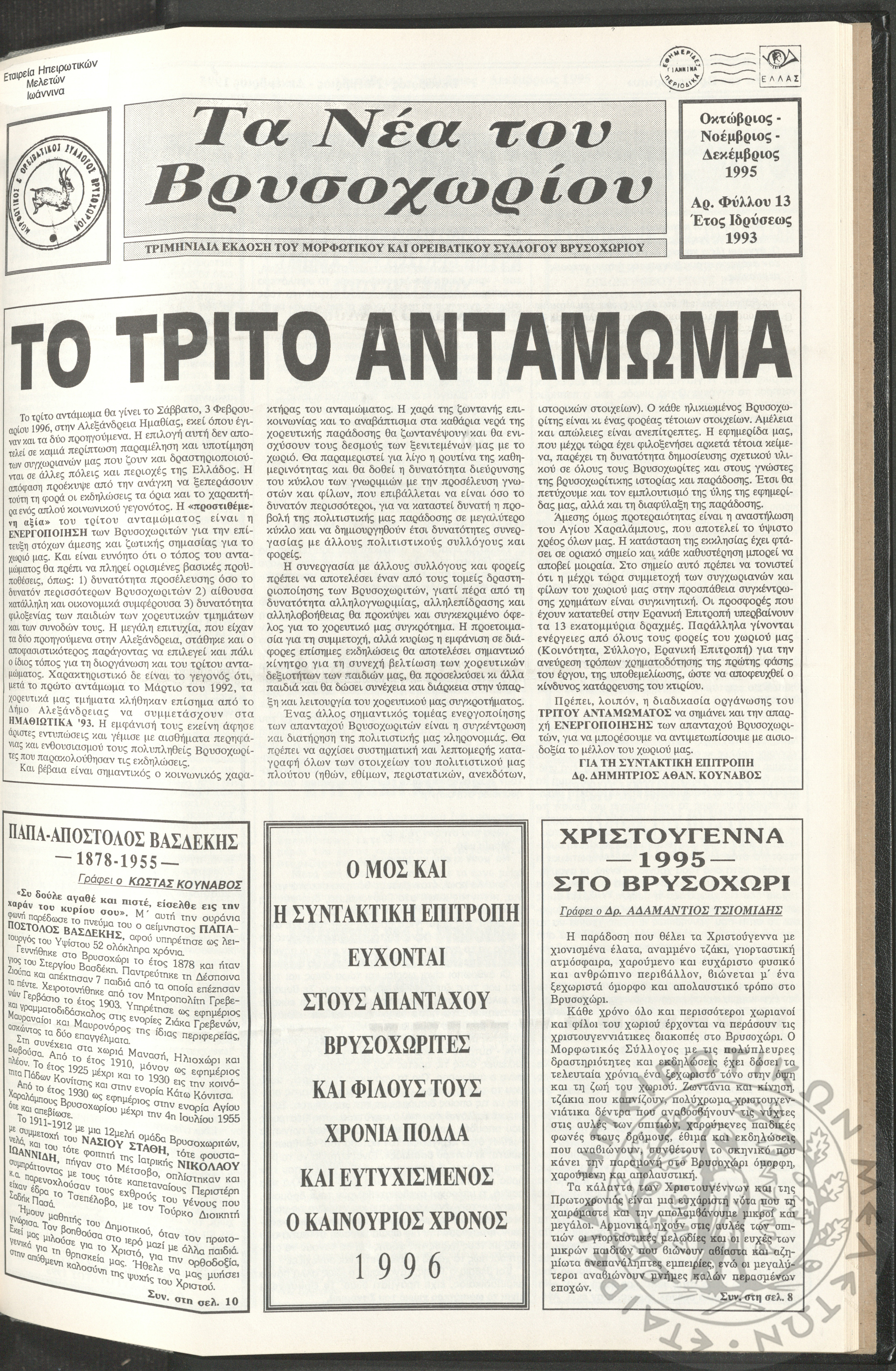 Τα Νέα του Βρυσοχωρίου: τριμηνιαία περιοδική έκδοση του Μορφωτικού και Ορειβατικού Συλλόγου Βρυσοχωρίου, 1995, φ. 13...