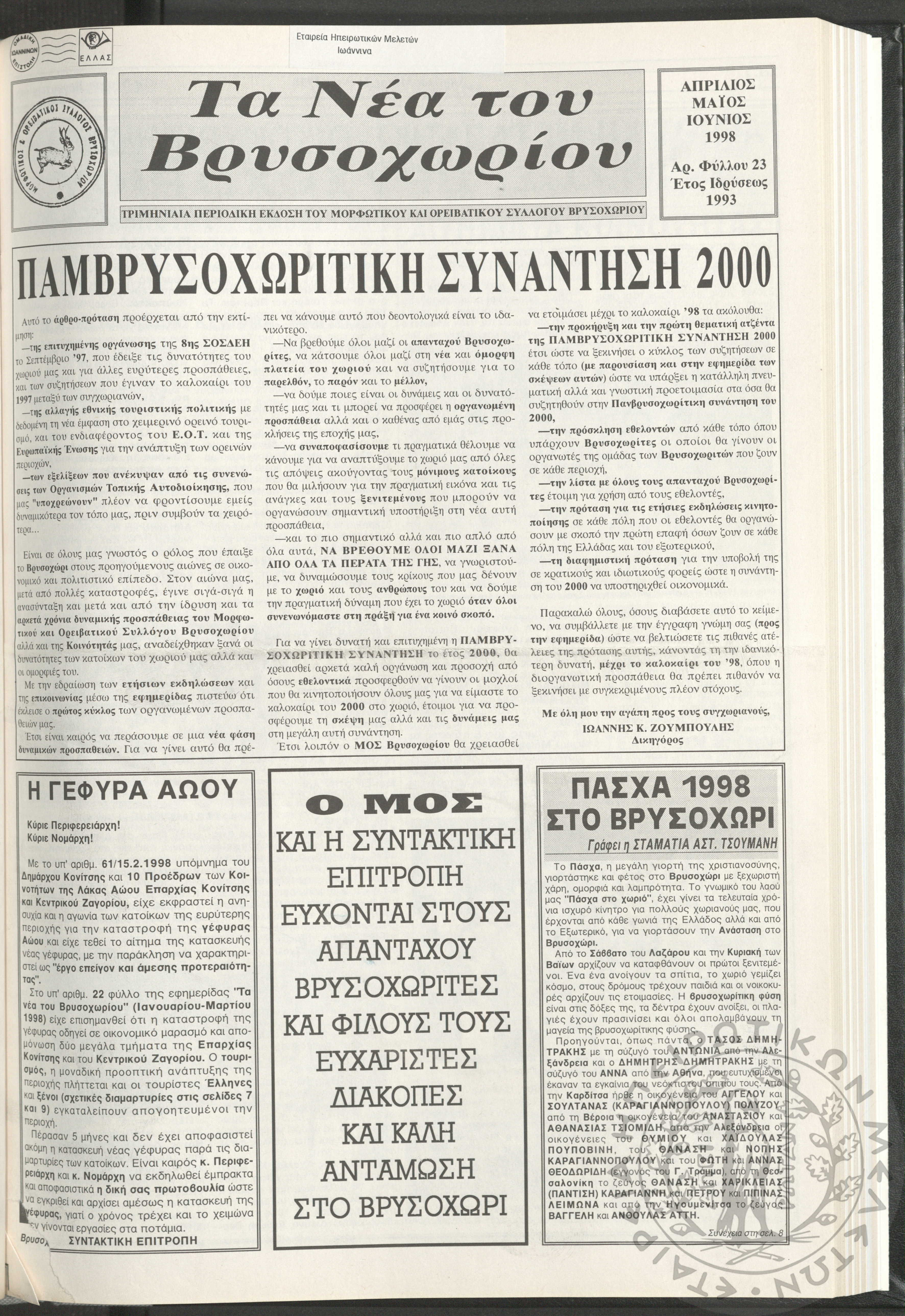 Τα Νέα του Βρυσοχωρίου: τριμηνιαία περιοδική έκδοση του Μορφωτικού και Ορειβατικού Συλλόγου Βρυσοχωρίου, 1998, φ. 23...