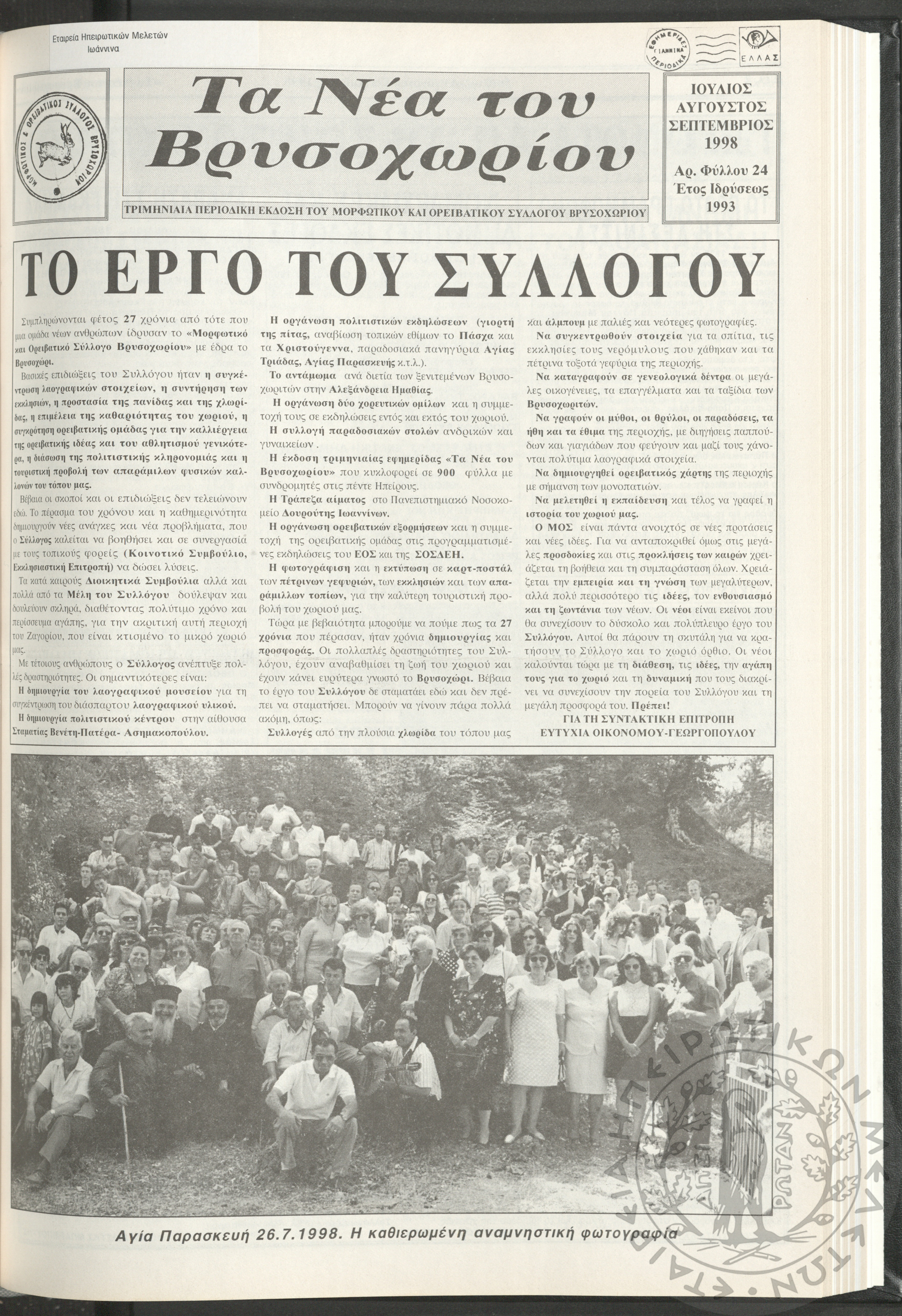 Τα Νέα του Βρυσοχωρίου: τριμηνιαία περιοδική έκδοση του Μορφωτικού και Ορειβατικού Συλλόγου Βρυσοχωρίου, 1998, φ. 24...