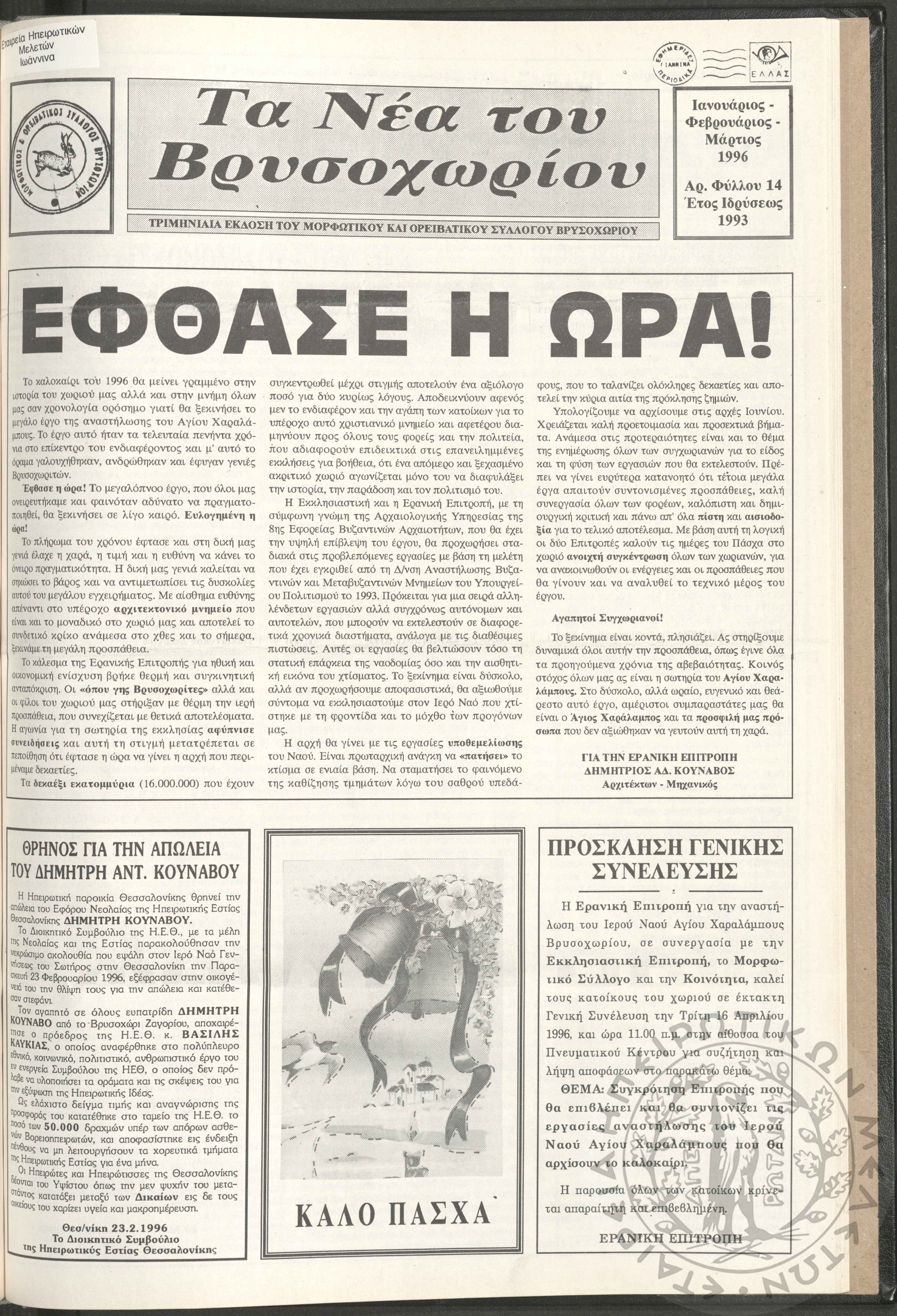Τα Νέα του Βρυσοχωρίου: τριμηνιαία περιοδική έκδοση του Μορφωτικού και Ορειβατικού Συλλόγου Βρυσοχωρίου, 1996, φ. 14...