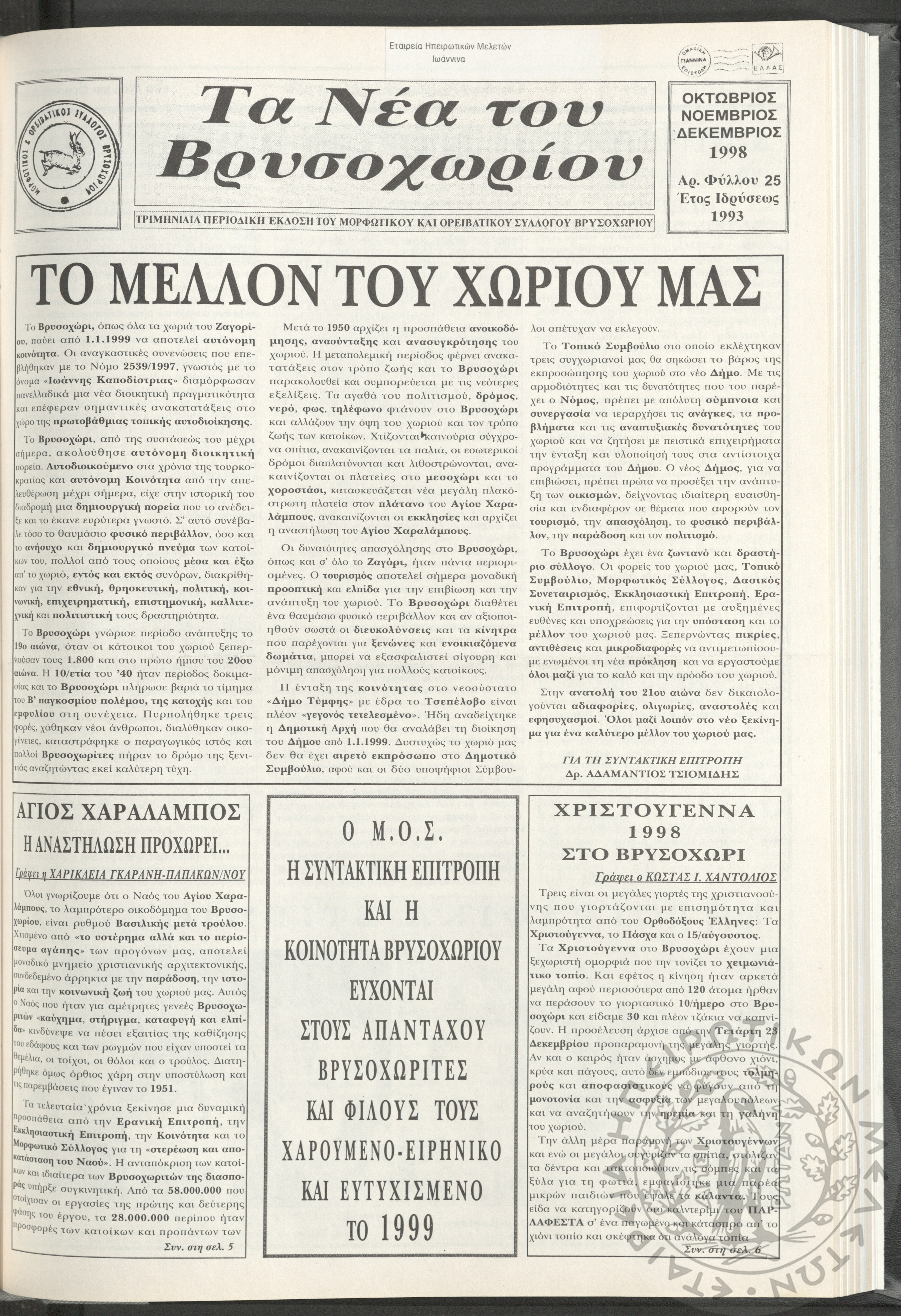 Τα Νέα του Βρυσοχωρίου: τριμηνιαία περιοδική έκδοση του Μορφωτικού και Ορειβατικού Συλλόγου Βρυσοχωρίου, 1998, φ. 25...