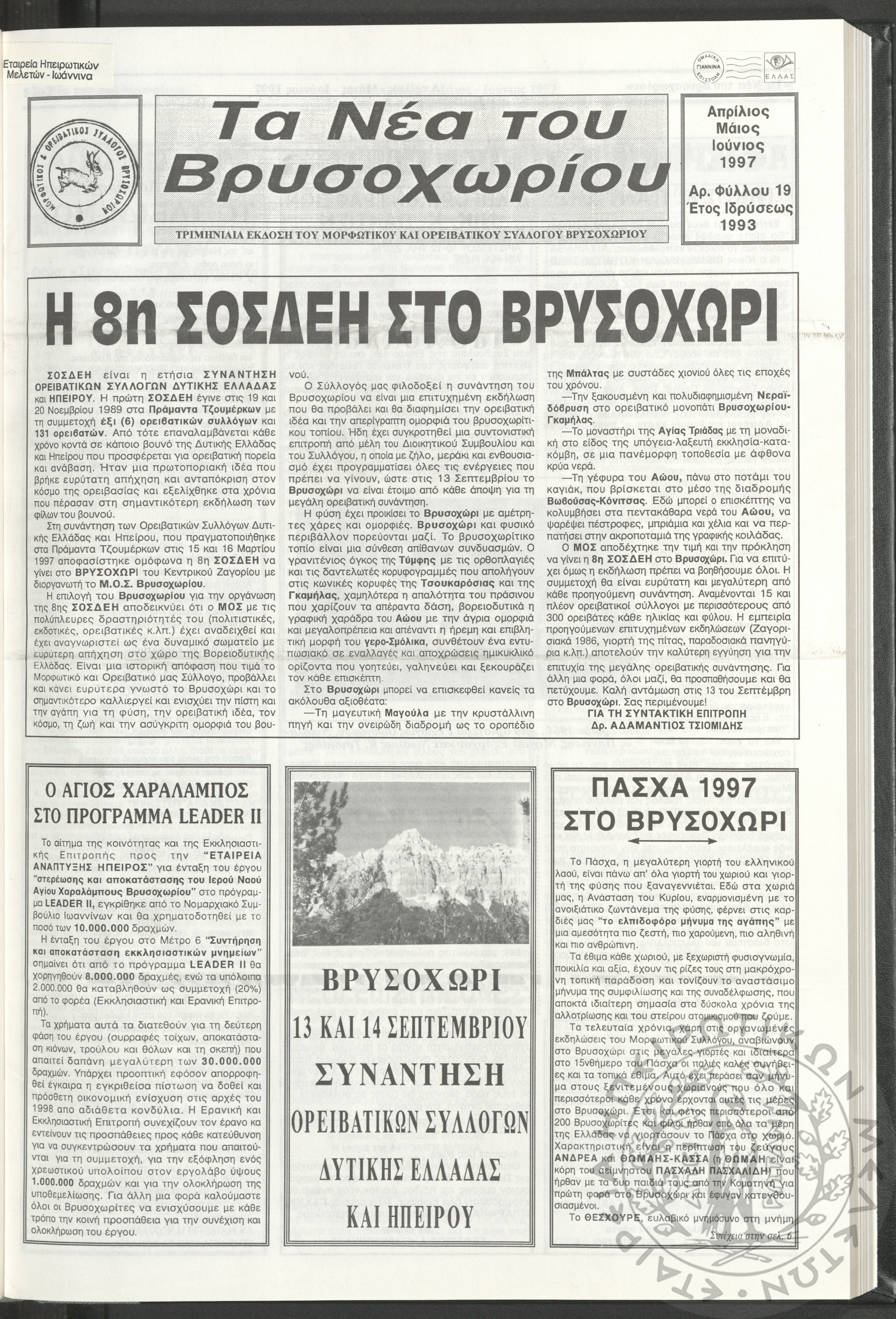 Τα Νέα του Βρυσοχωρίου: τριμηνιαία περιοδική έκδοση του Μορφωτικού και Ορειβατικού Συλλόγου Βρυσοχωρίου (τεύχ. 19)...
