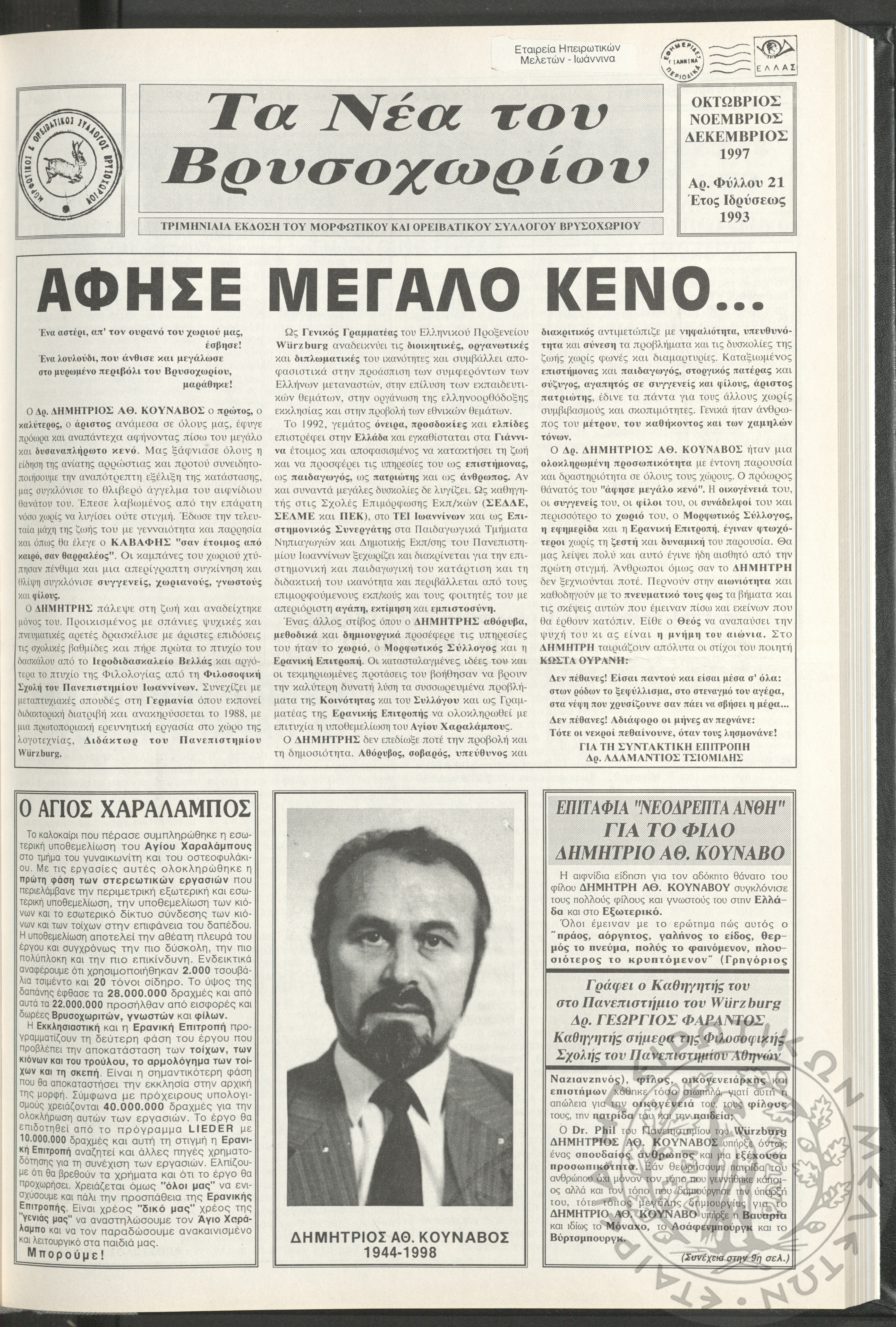 Τα Νέα του Βρυσοχωρίου: τριμηνιαία περιοδική έκδοση του Μορφωτικού και Ορειβατικού Συλλόγου Βρυσοχωρίου, 1997, φ. 21...