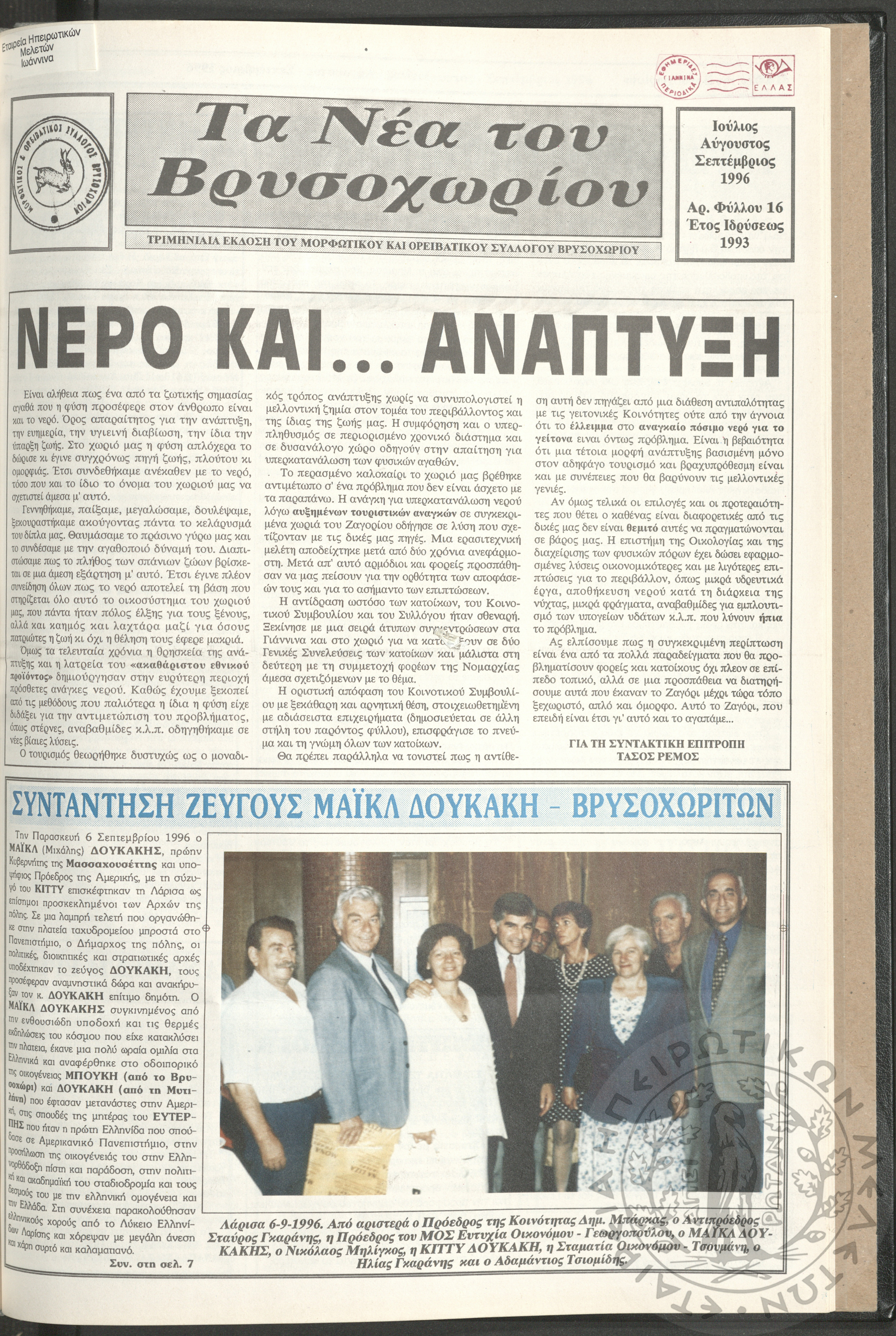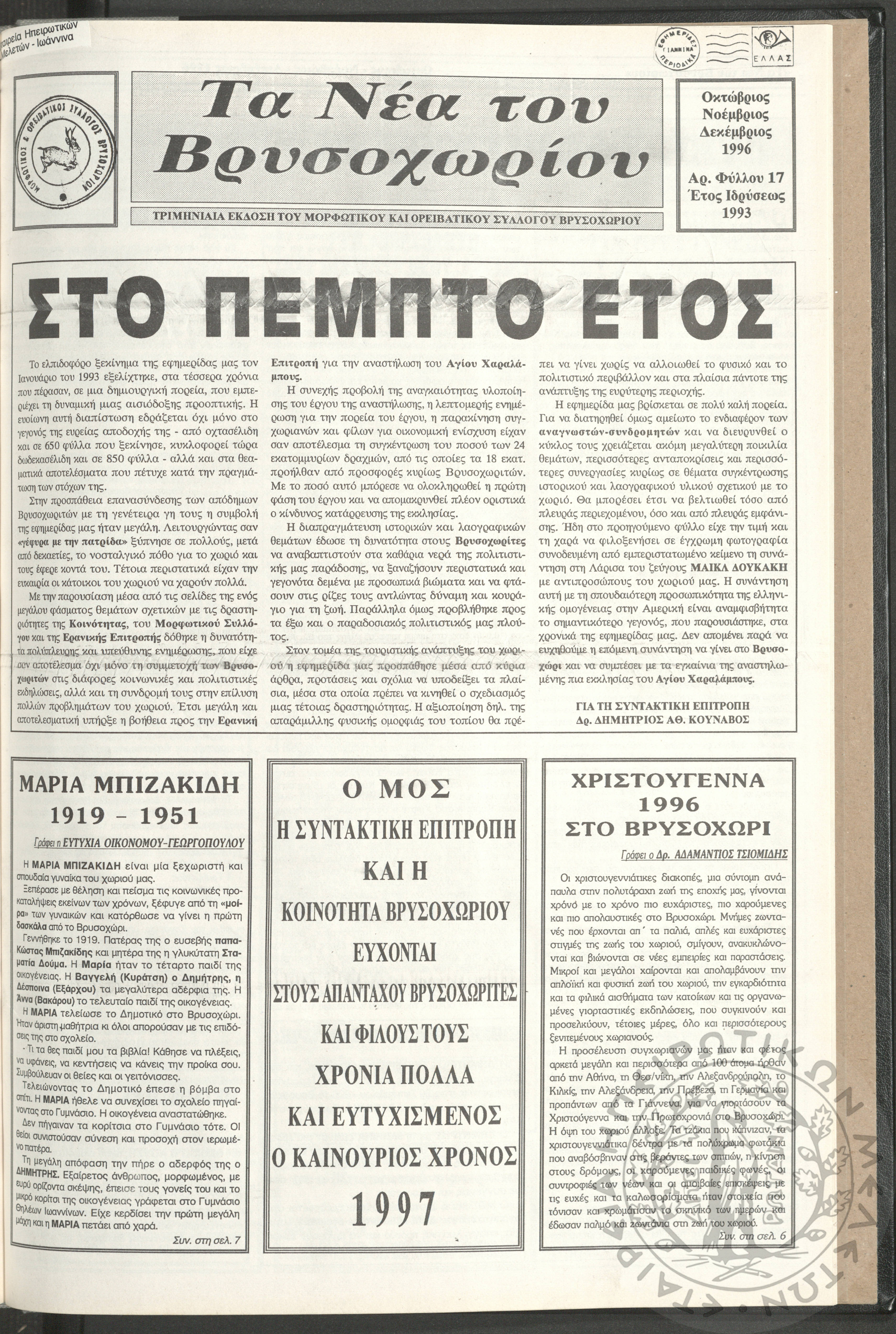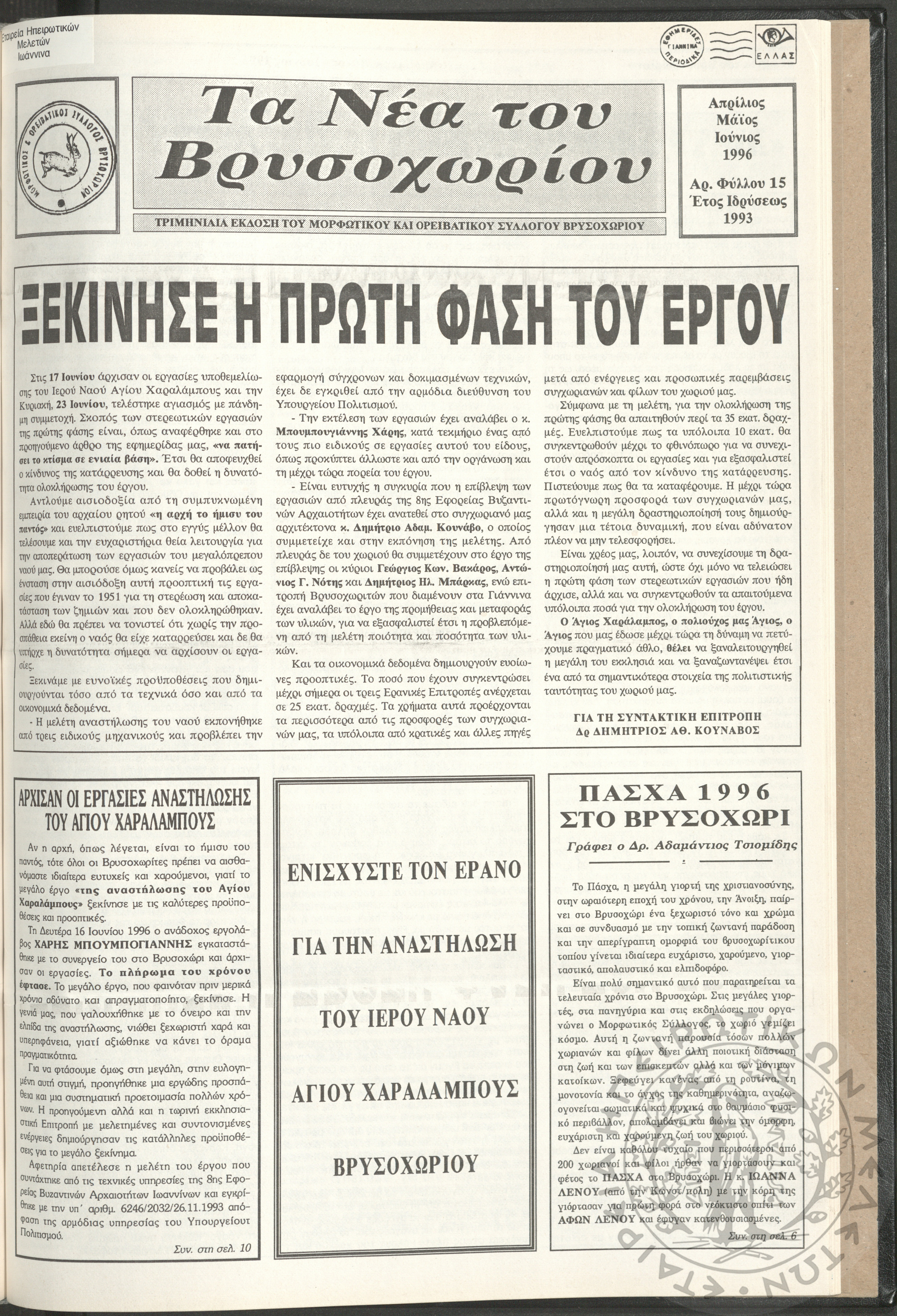 Τα Νέα του Βρυσοχωρίου: τριμηνιαία περιοδική έκδοση του Μορφωτικού και Ορειβατικού Συλλόγου Βρυσοχωρίου, 1996, φ. 15...