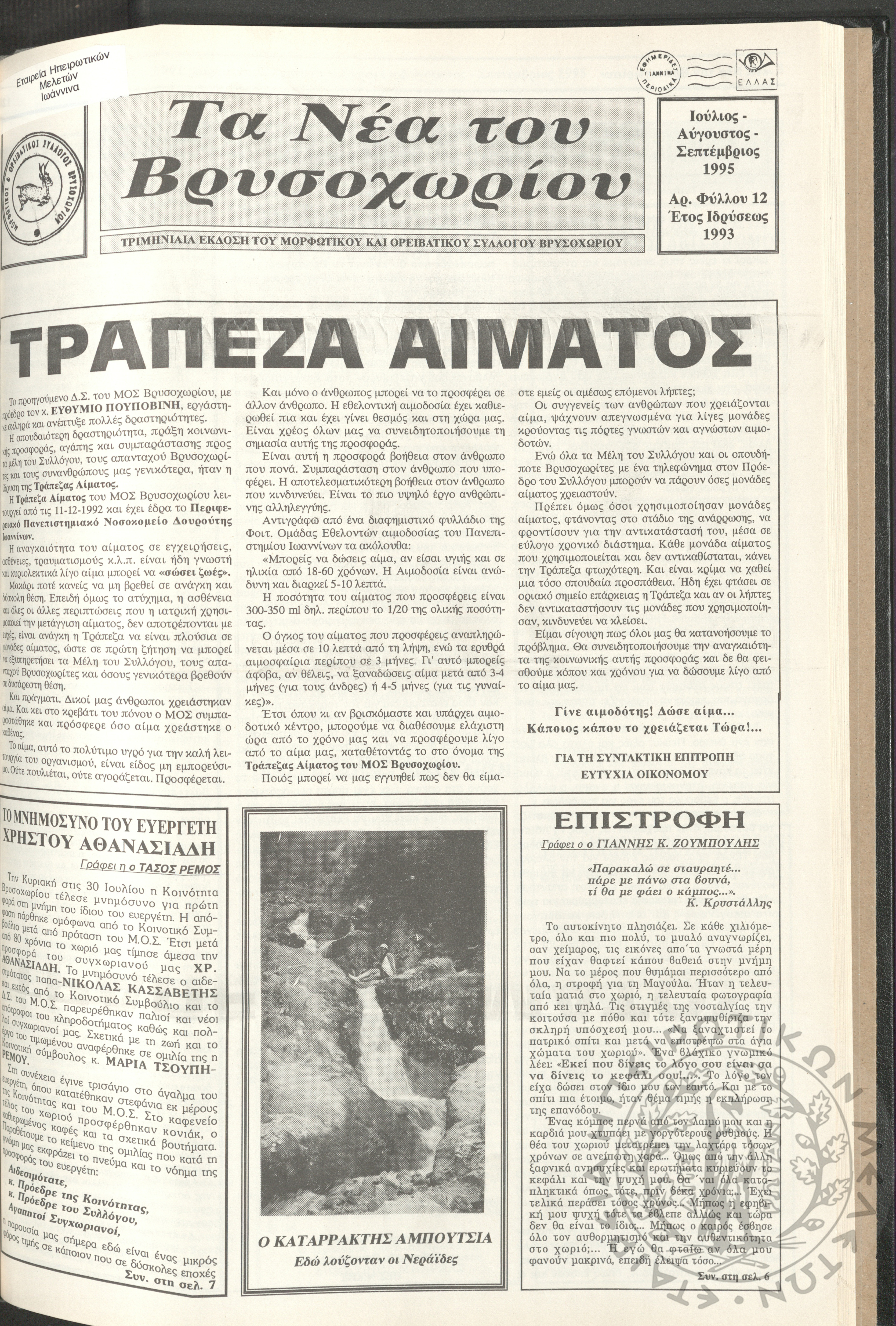 Τα Νέα του Βρυσοχωρίου: τριμηνιαία περιοδική έκδοση του Μορφωτικού και Ορειβατικού Συλλόγου Βρυσοχωρίου, 1995, φ. 12...