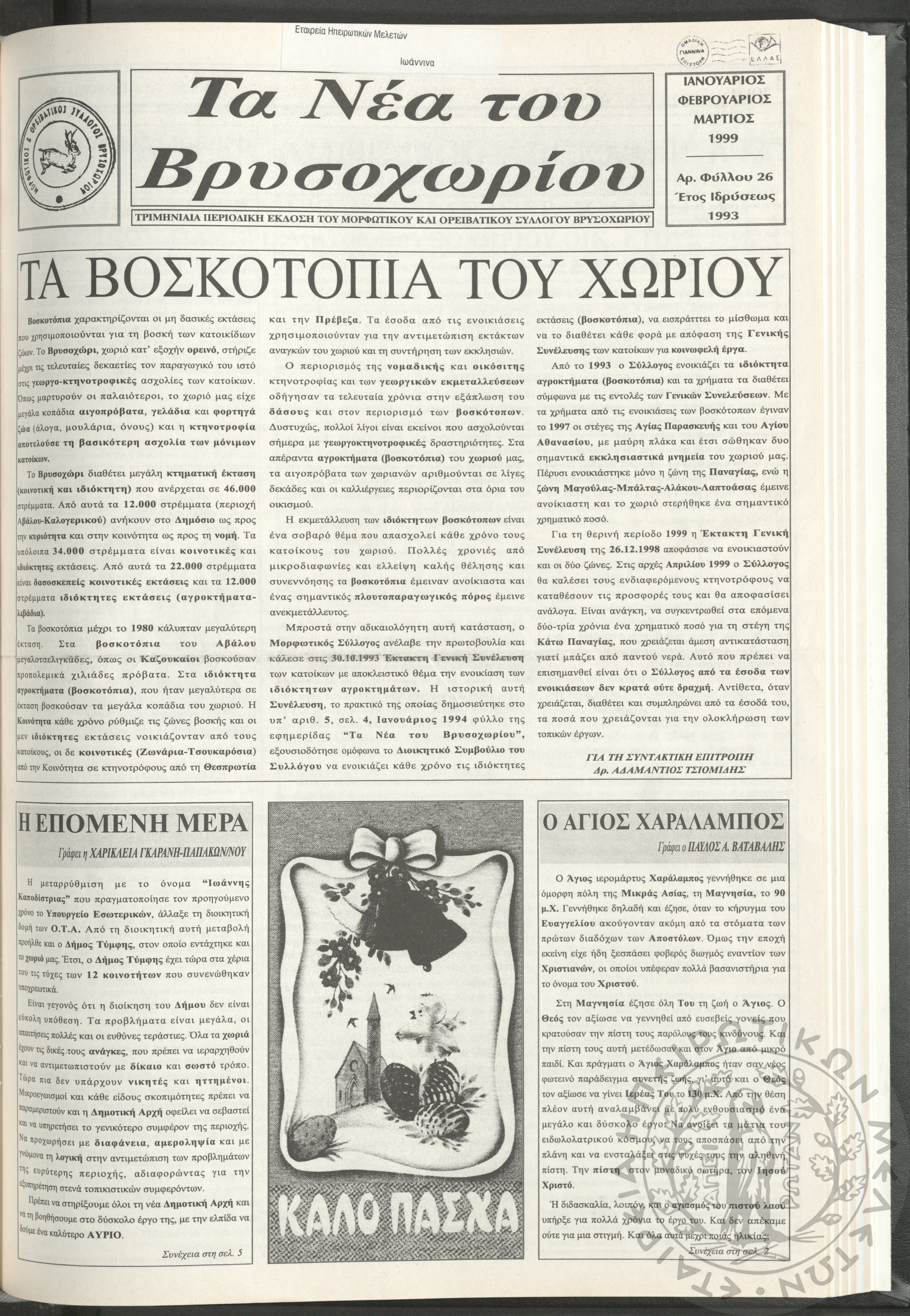 Τα Νέα του Βρυσοχωρίου: τριμηνιαία περιοδική έκδοση του Μορφωτικού και Ορειβατικού Συλλόγου Βρυσοχωρίου, 1999, φ. 26...