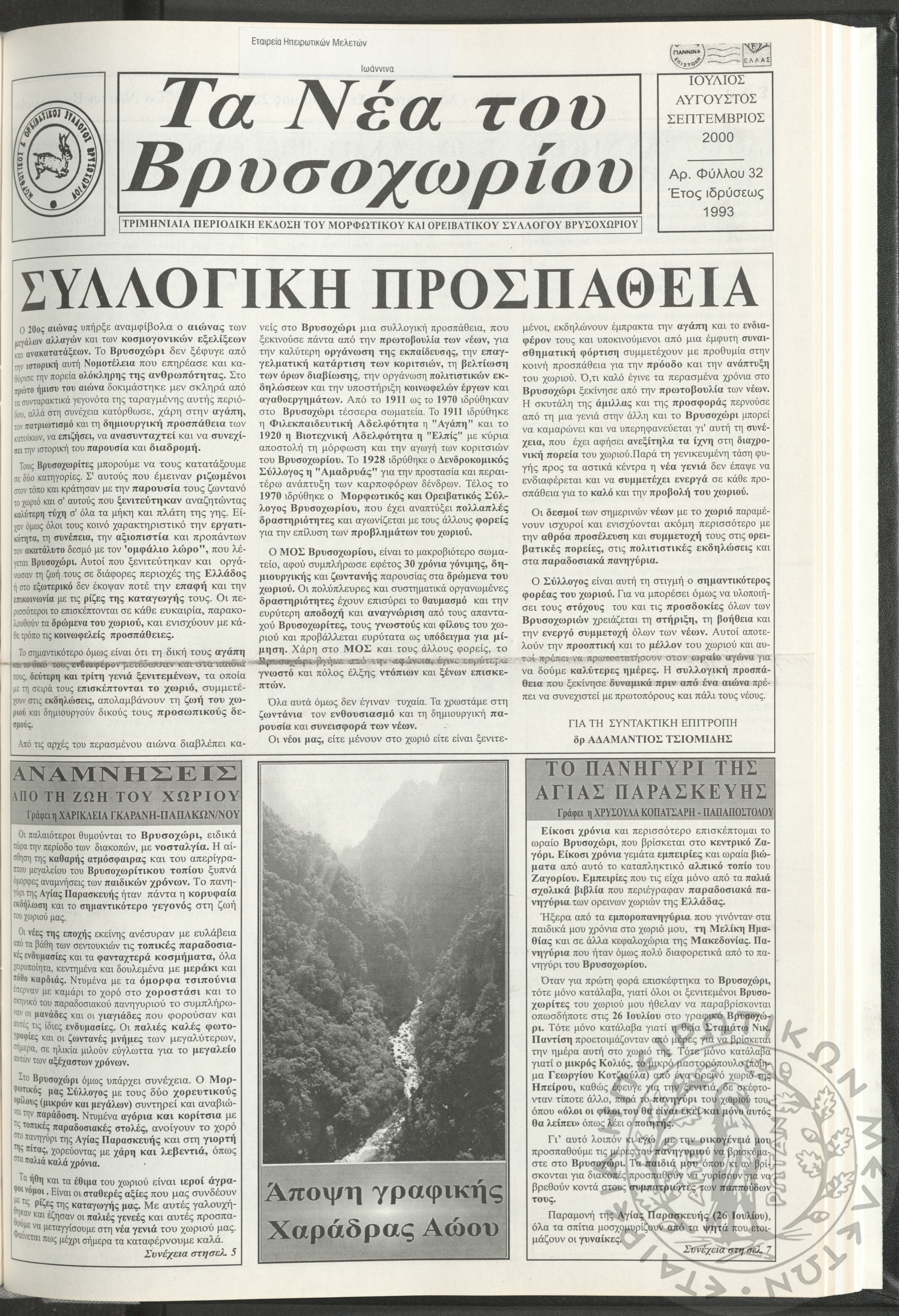 Τα Νέα του Βρυσοχωρίου: τριμηνιαία περιοδική έκδοση του Μορφωτικού και Ορειβατικού Συλλόγου Βρυσοχωρίου, 2000, φ. 32...