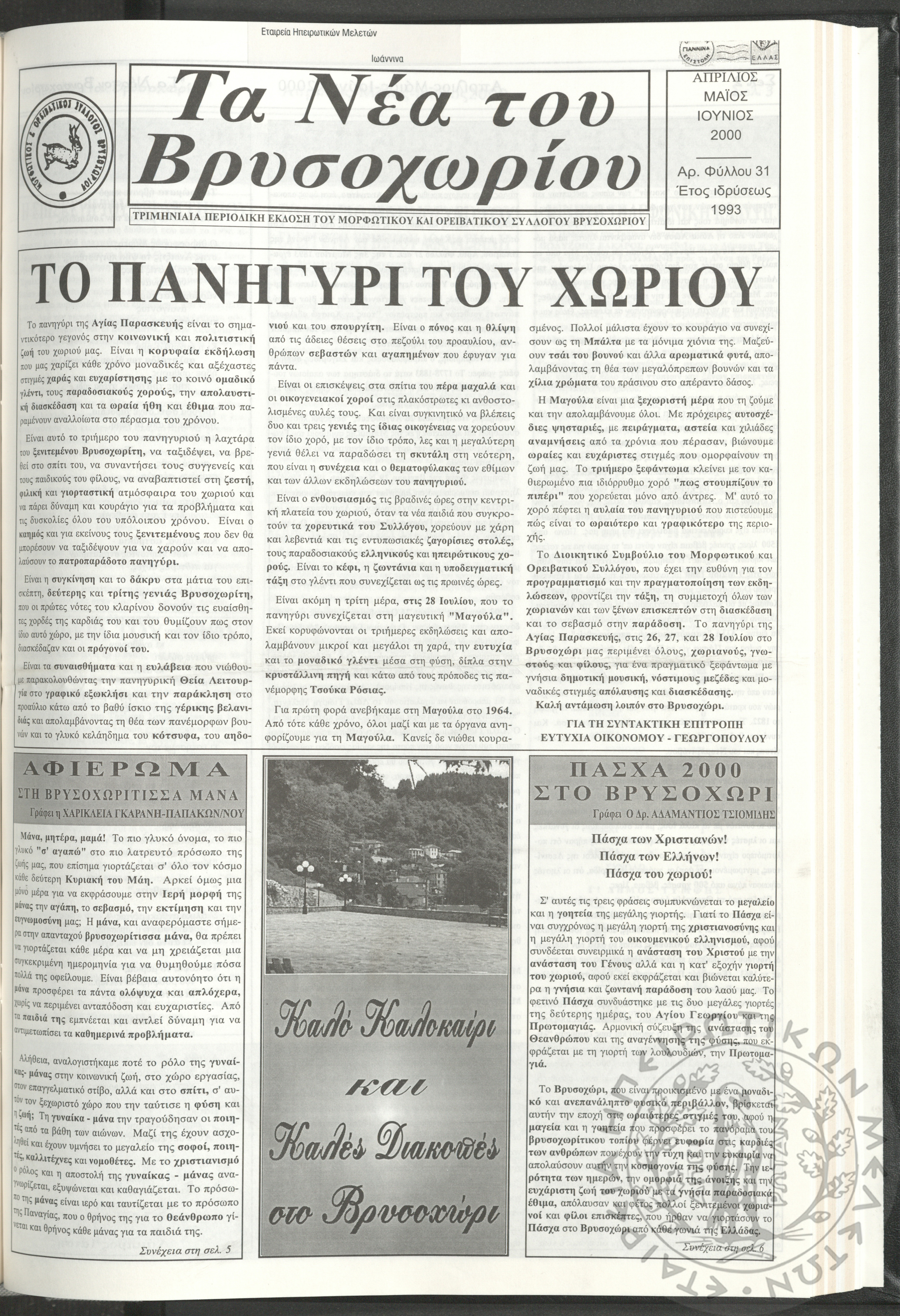 Τα Νέα του Βρυσοχωρίου: τριμηνιαία περιοδική έκδοση του Μορφωτικού και Ορειβατικού Συλλόγου Βρυσοχωρίου, 2000, φ. 31...