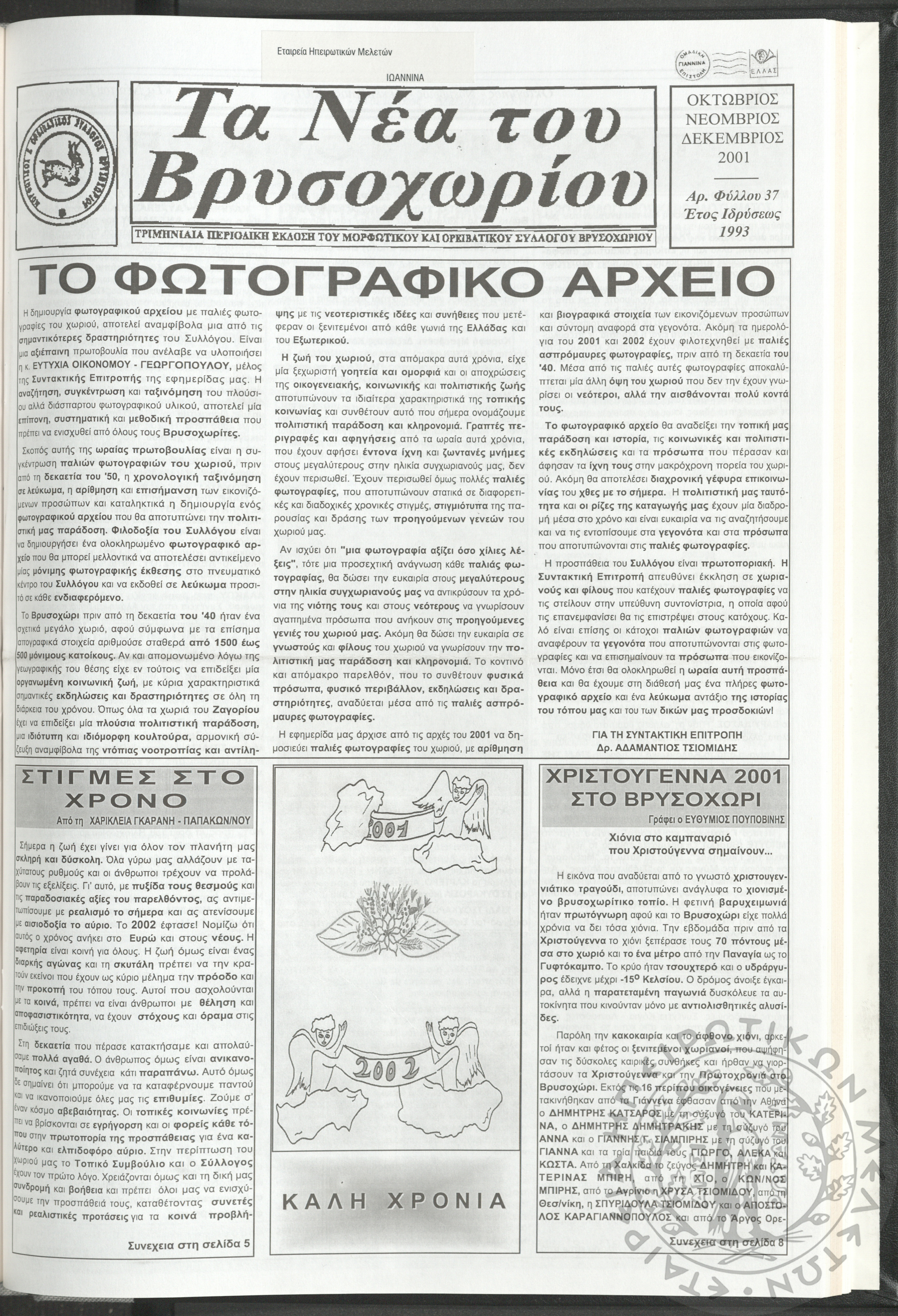 Τα Νέα του Βρυσοχωρίου: τριμηνιαία περιοδική έκδοση του Μορφωτικού και Ορειβατικού Συλλόγου Βρυσοχωρίου, 2001, φ. 37...