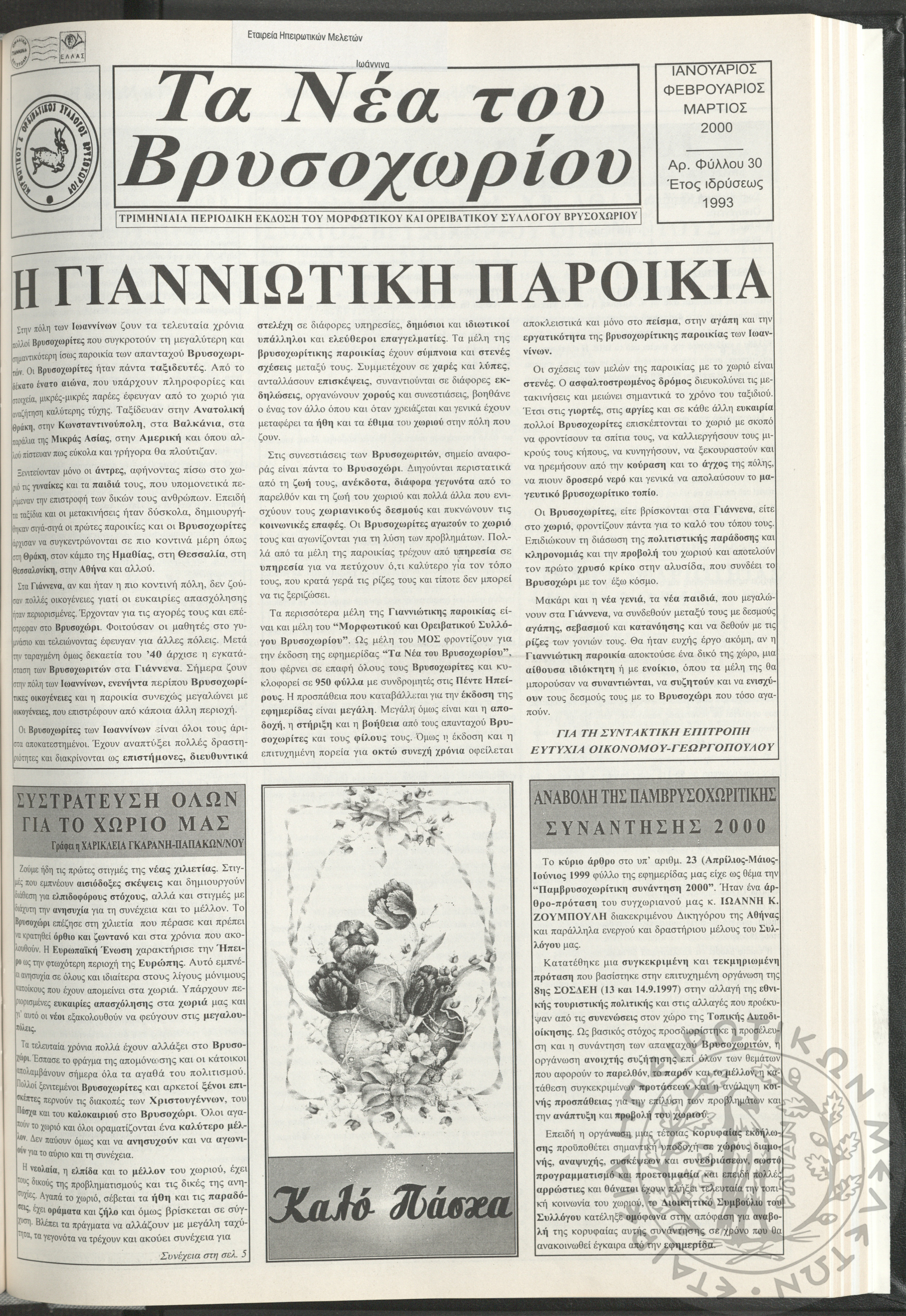 Τα Νέα του Βρυσοχωρίου: τριμηνιαία περιοδική έκδοση του Μορφωτικού και Ορειβατικού Συλλόγου Βρυσοχωρίου, 2000, φ. 30...