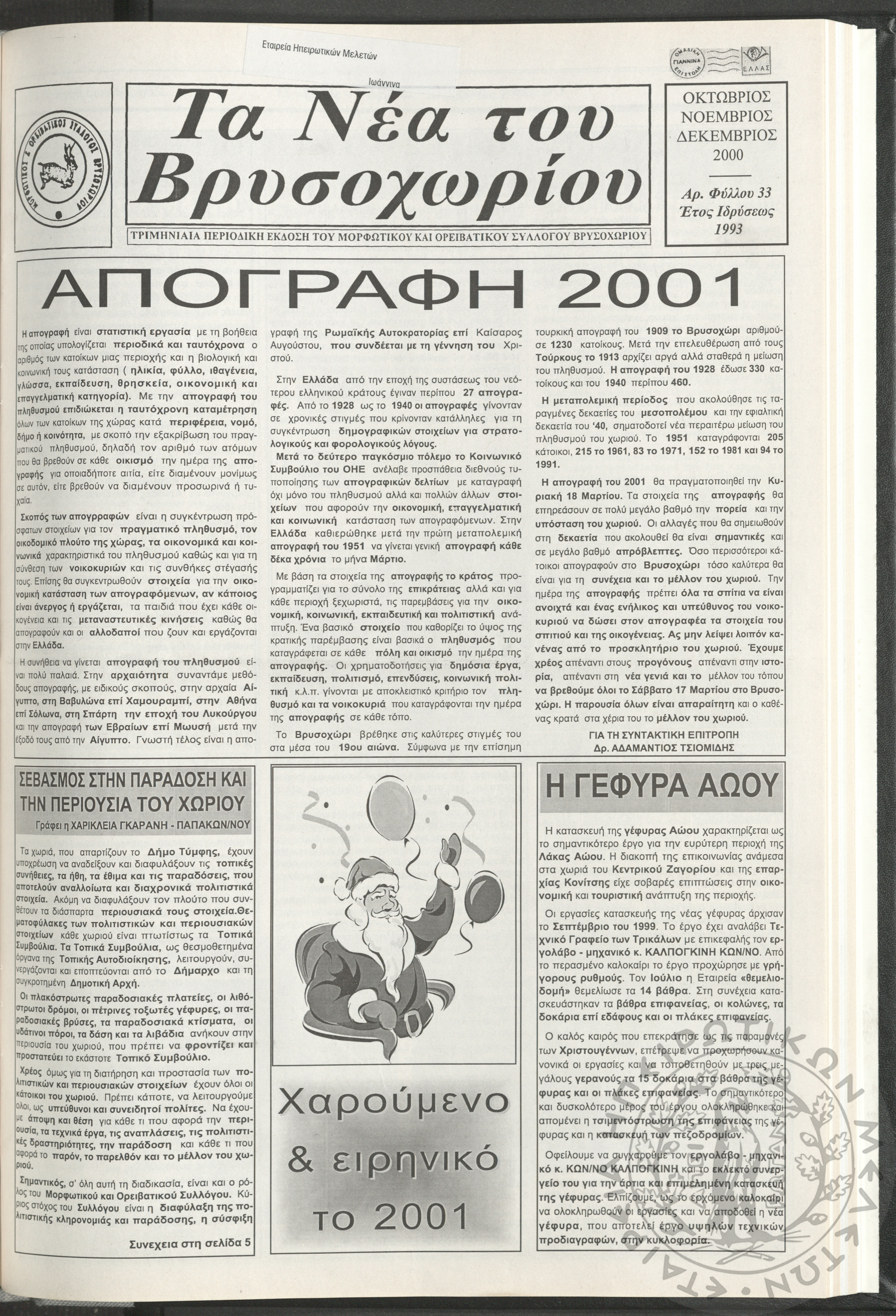 Τα Νέα του Βρυσοχωρίου: τριμηνιαία περιοδική έκδοση του Μορφωτικού και Ορειβατικού Συλλόγου Βρυσοχωρίου, 2000, φ. 33...