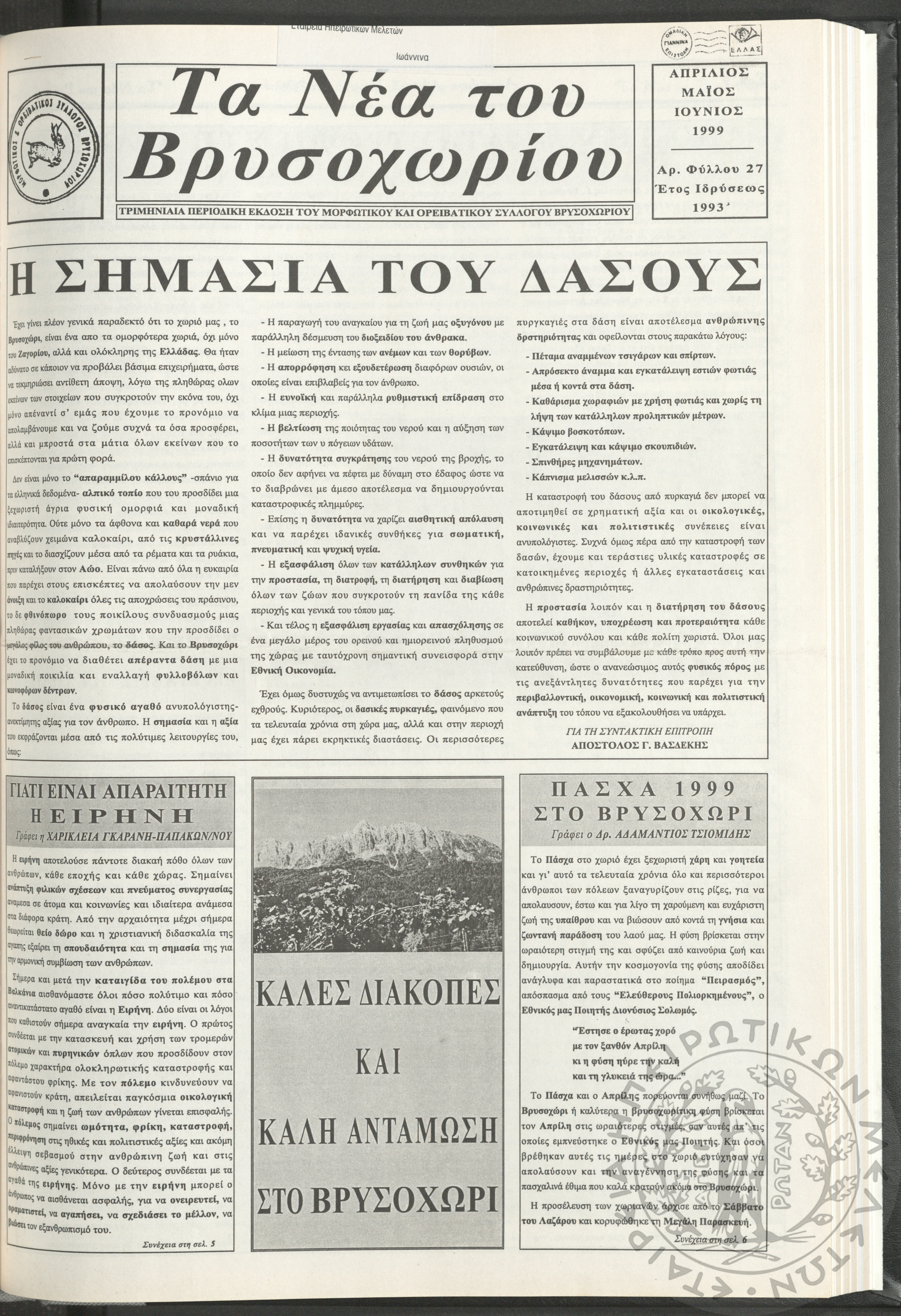 Τα Νέα του Βρυσοχωρίου: τριμηνιαία περιοδική έκδοση του Μορφωτικού και Ορειβατικού Συλλόγου Βρυσοχωρίου, 1999, φ. 27...