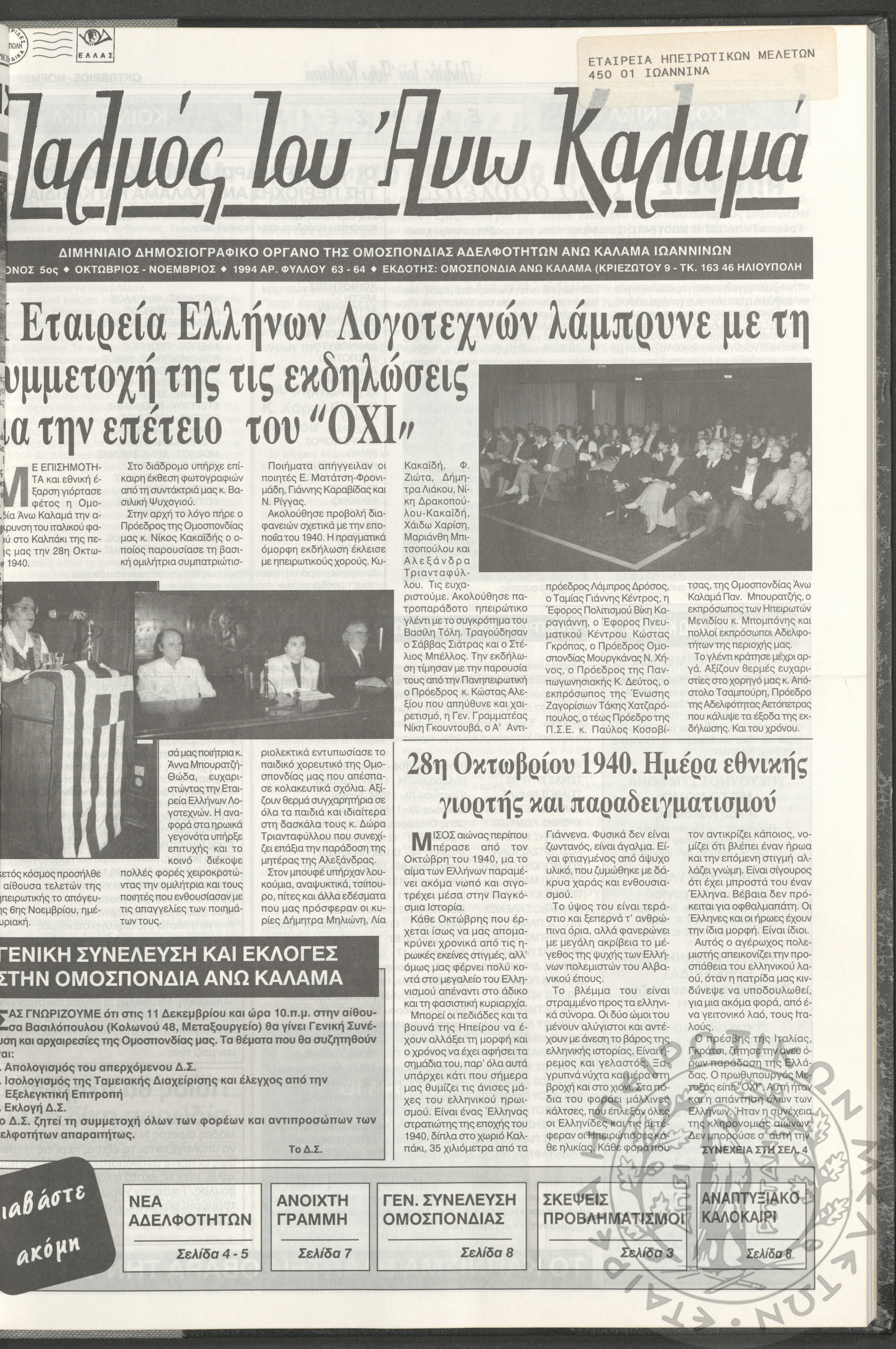 Παλμός του Άνω Καλαμά: διμηνιαίο δημοσιογραφικό όργανο της Ομοσπονδίας Αδελφοτήτων Άνω Καλαμά Ιωαννίνων, 1994, φ. 63-64Έτος 5ο, αρ. φ. 63-64...