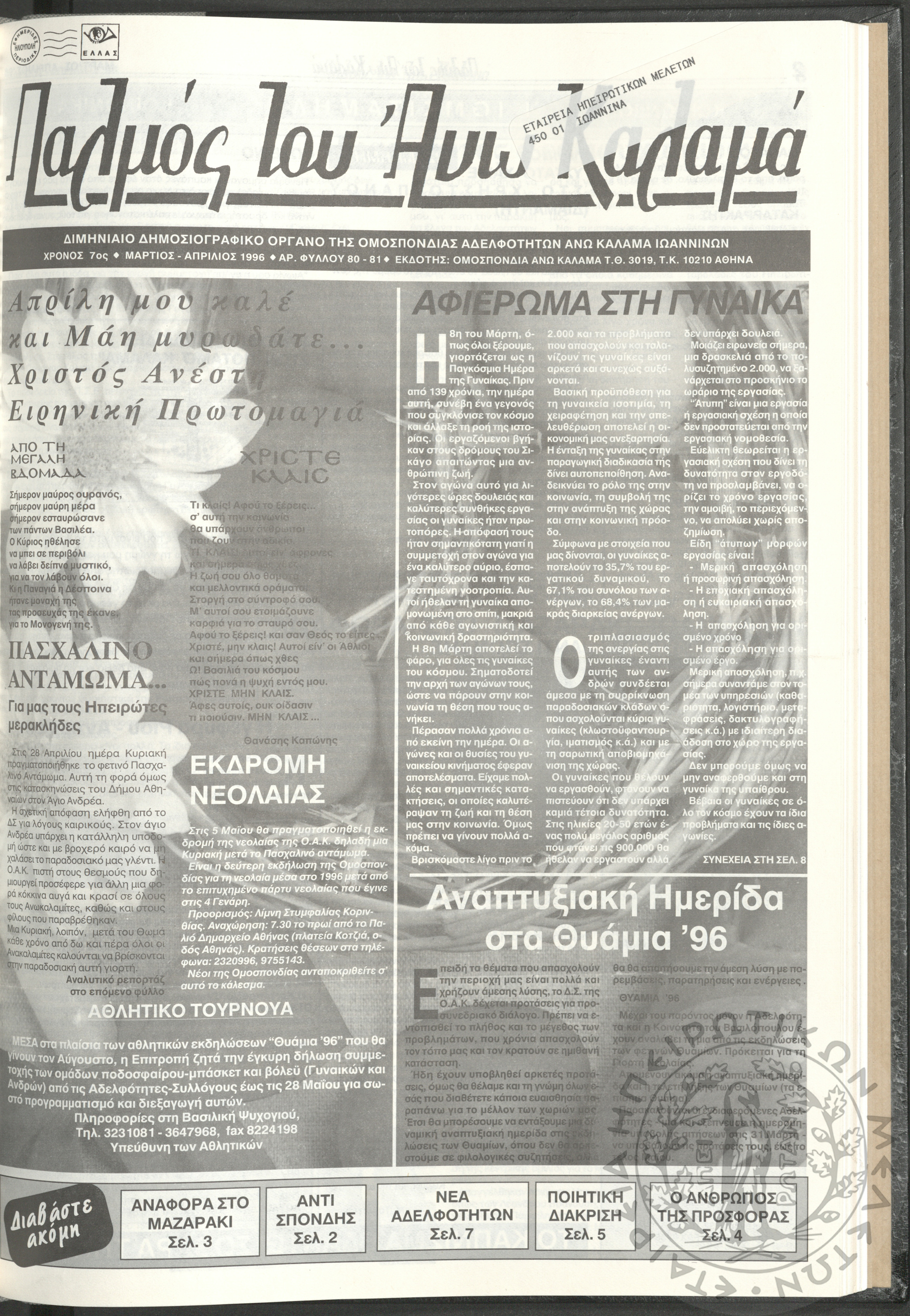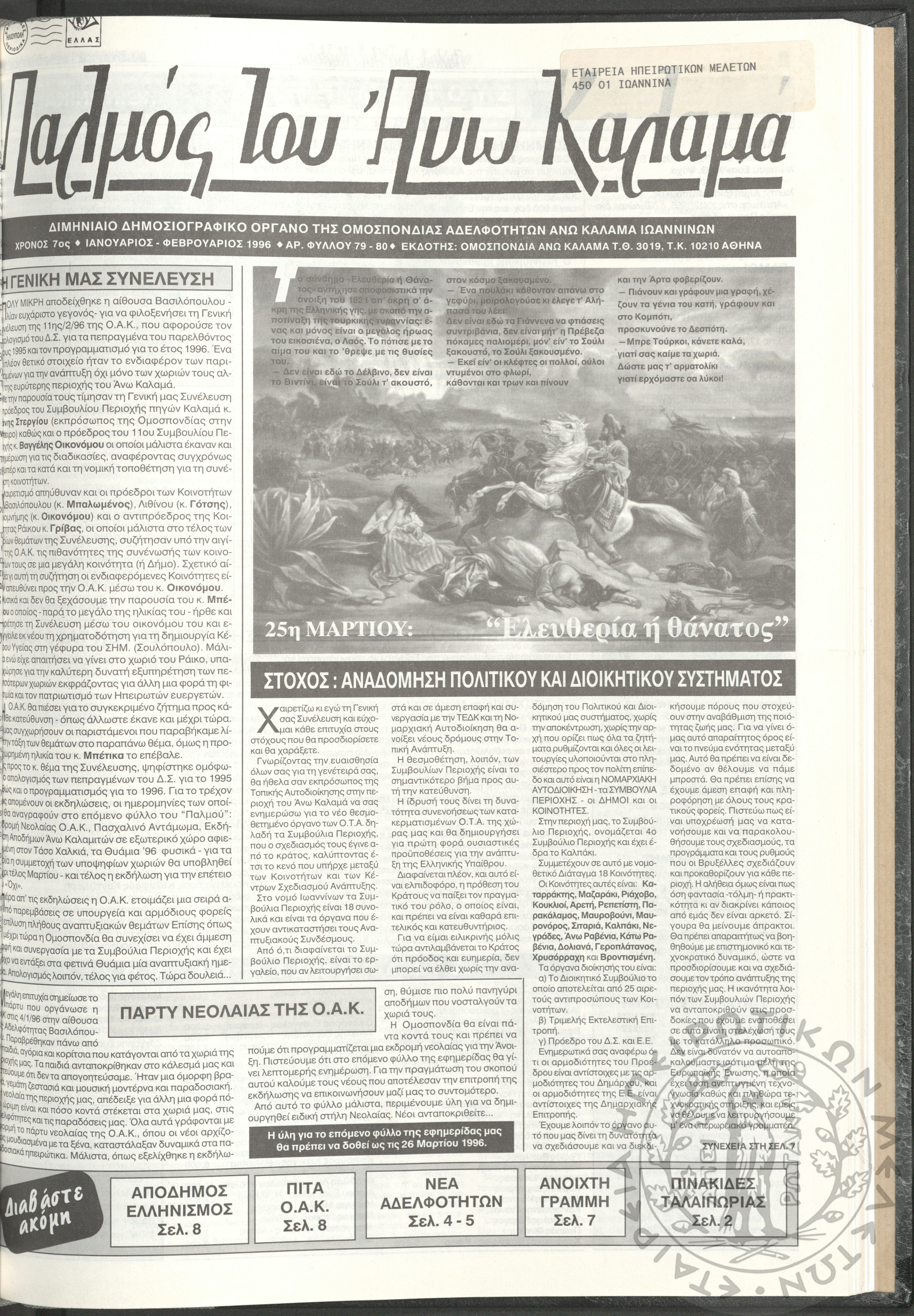 Παλμός του Άνω Καλαμά: διμηνιαίο δημοσιογραφικό όργανο της Ομοσπονδίας Αδελφοτήτων Άνω Καλαμά Ιωαννίνων, 1996, φ. 79-80Έτος 7ο, αρ. φ. 79-80...