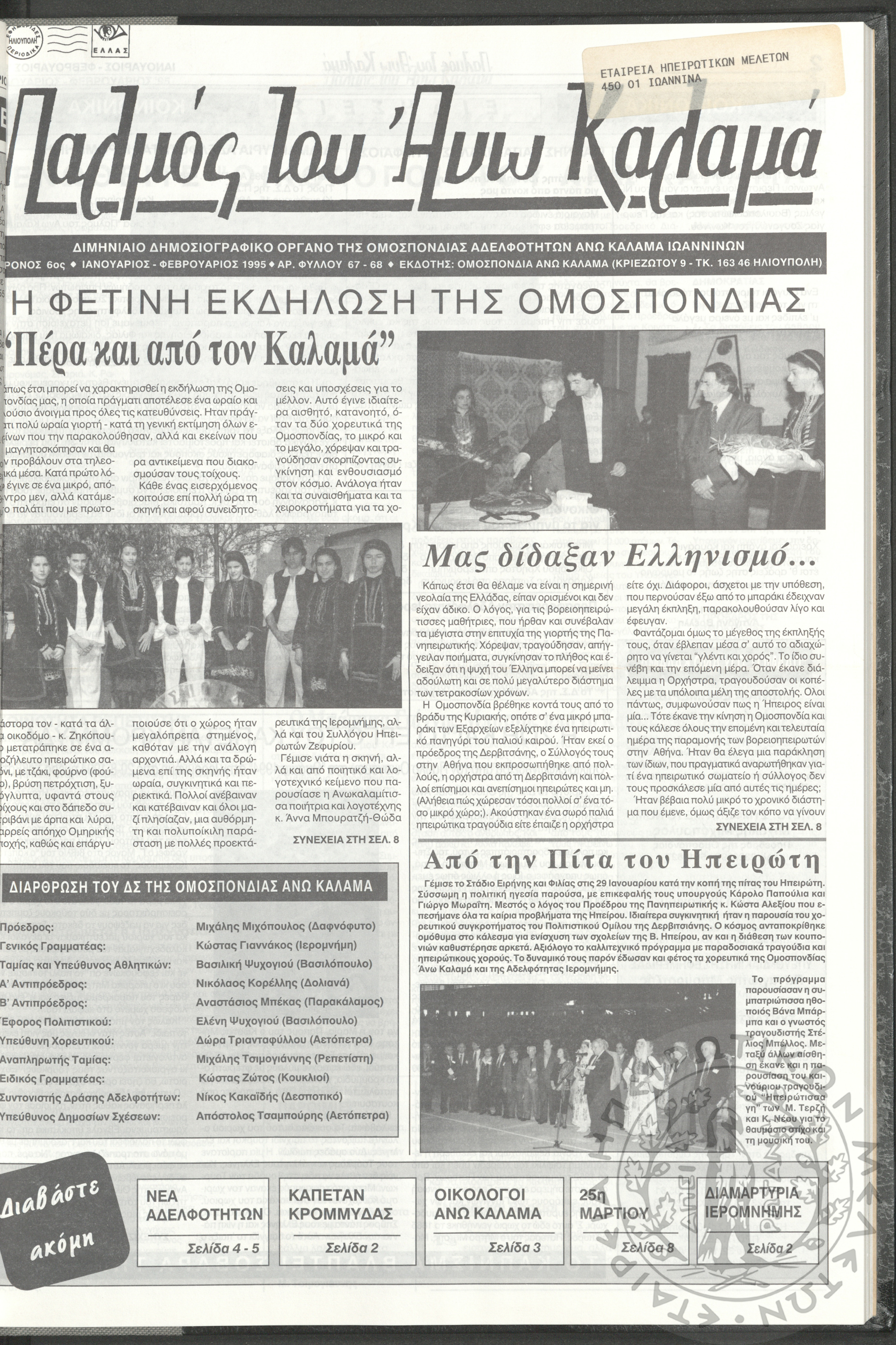 Παλμός του Άνω Καλαμά: διμηνιαίο δημοσιογραφικό όργανο της Ομοσπονδίας Αδελφοτήτων Άνω Καλαμά Ιωαννίνων, 1995, φ. 67-68Έτος 6ο, αρ. φ. 67-68...