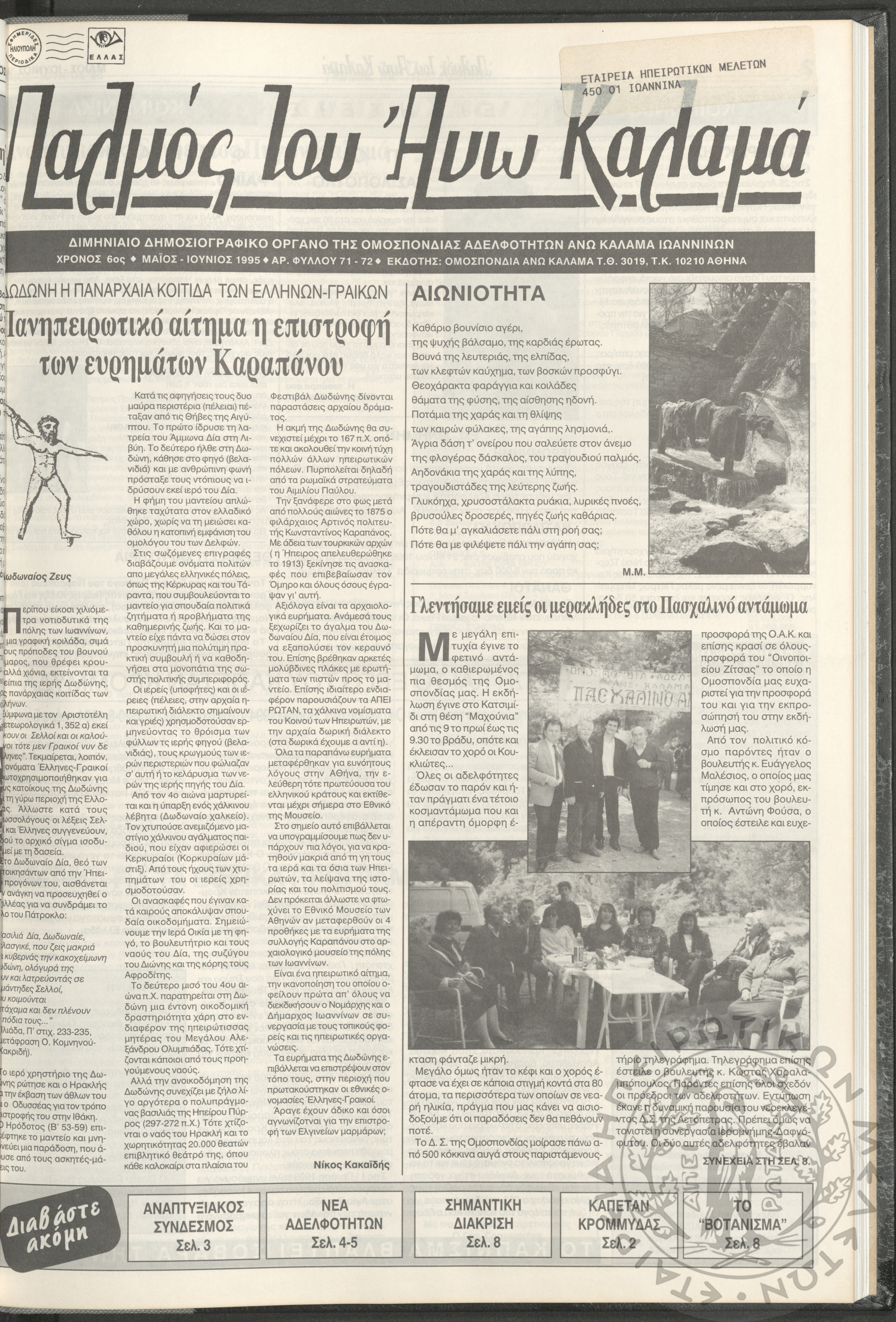 Παλμός του Άνω Καλαμά: διμηνιαίο δημοσιογραφικό όργανο της Ομοσπονδίας Αδελφοτήτων Άνω Καλαμά Ιωαννίνων, 1995, φ. 71-72Έτος 6ο, αρ. φ. 71-72...