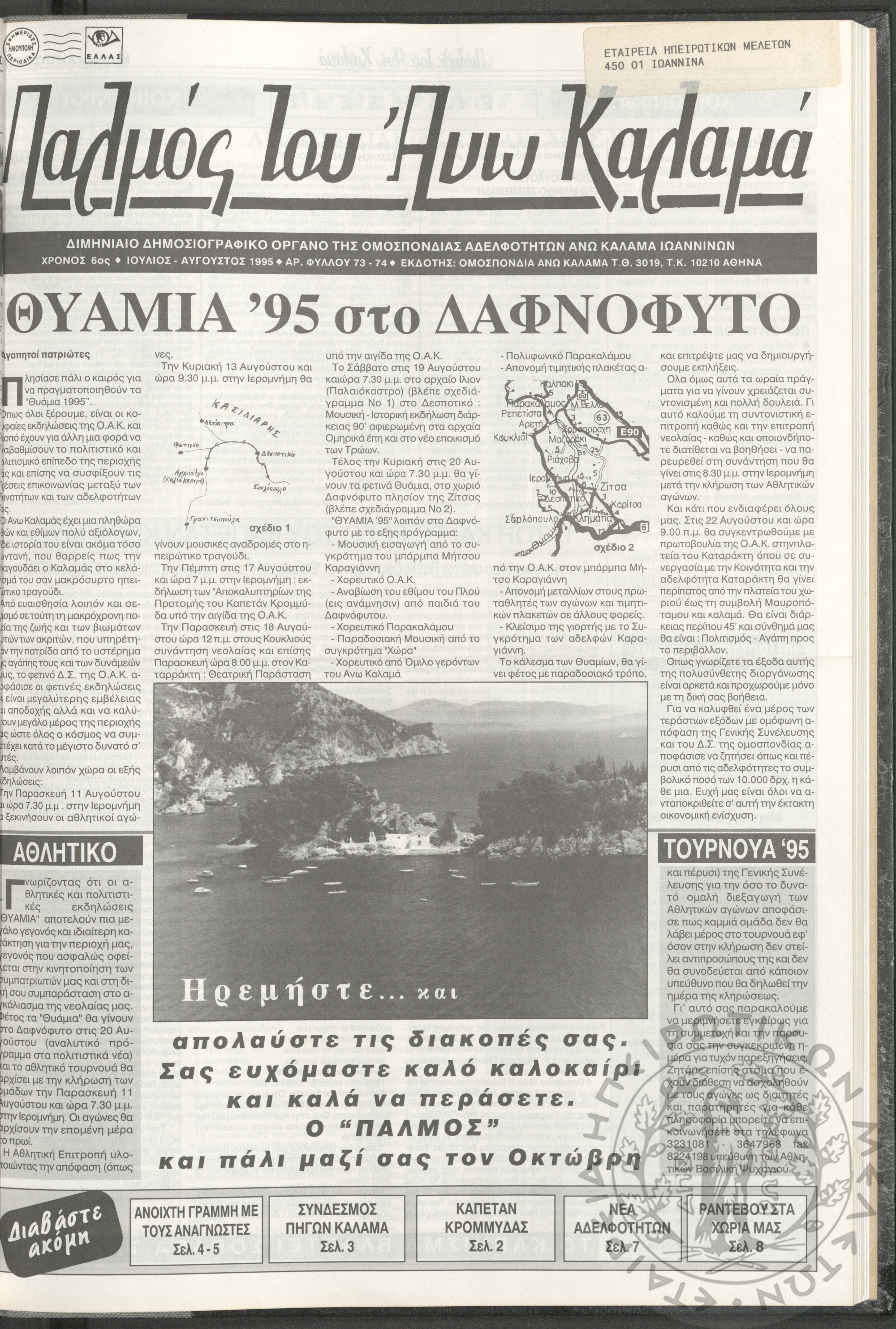 Παλμός του Άνω Καλαμά: διμηνιαίο δημοσιογραφικό όργανο της Ομοσπονδίας Αδελφοτήτων Άνω Καλαμά Ιωαννίνων, 1995, φ. 73-74Έτος 6ο, αρ. φ. 73-74...