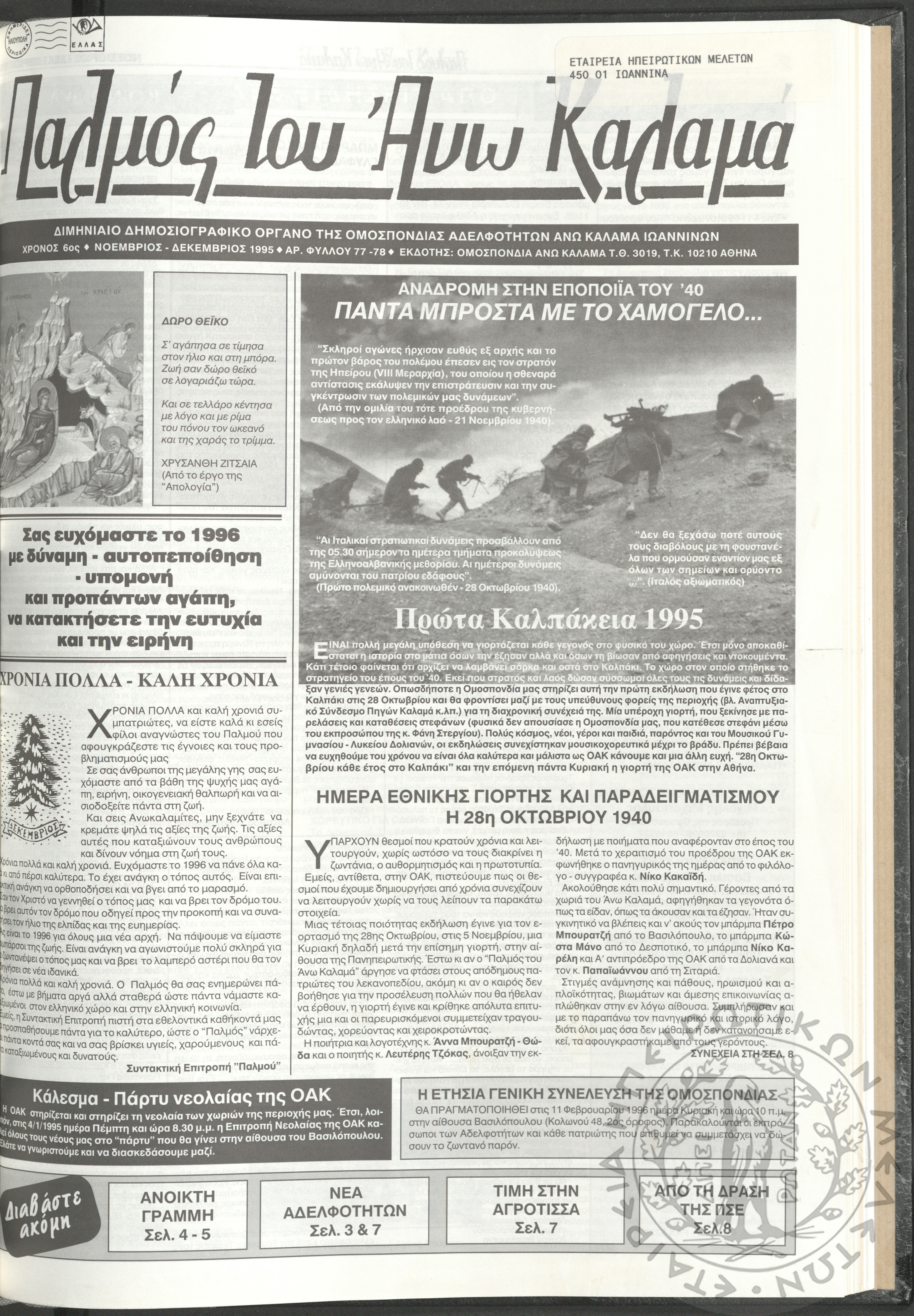 Παλμός του Άνω Καλαμά: διμηνιαίο δημοσιογραφικό όργανο της Ομοσπονδίας Αδελφοτήτων Άνω Καλαμά Ιωαννίνων, 1995, φ. 77-78Έτος 6ο, αρ. φ. 77-78...