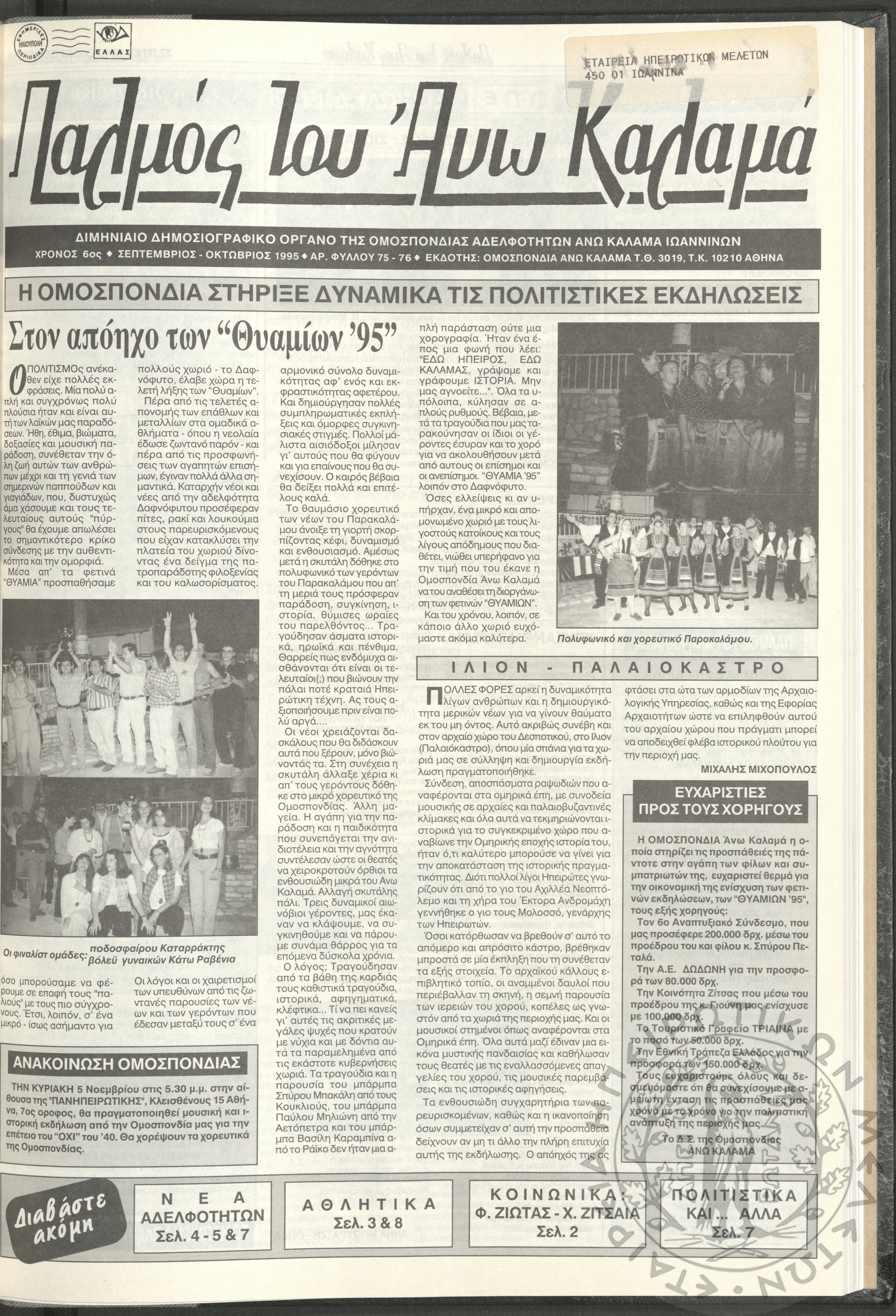Παλμός του Άνω Καλαμά: διμηνιαίο δημοσιογραφικό όργανο της Ομοσπονδίας Αδελφοτήτων Άνω Καλαμά Ιωαννίνων, 1995, φ. 75-76Έτος 6ο, αρ. φ. 75-76...