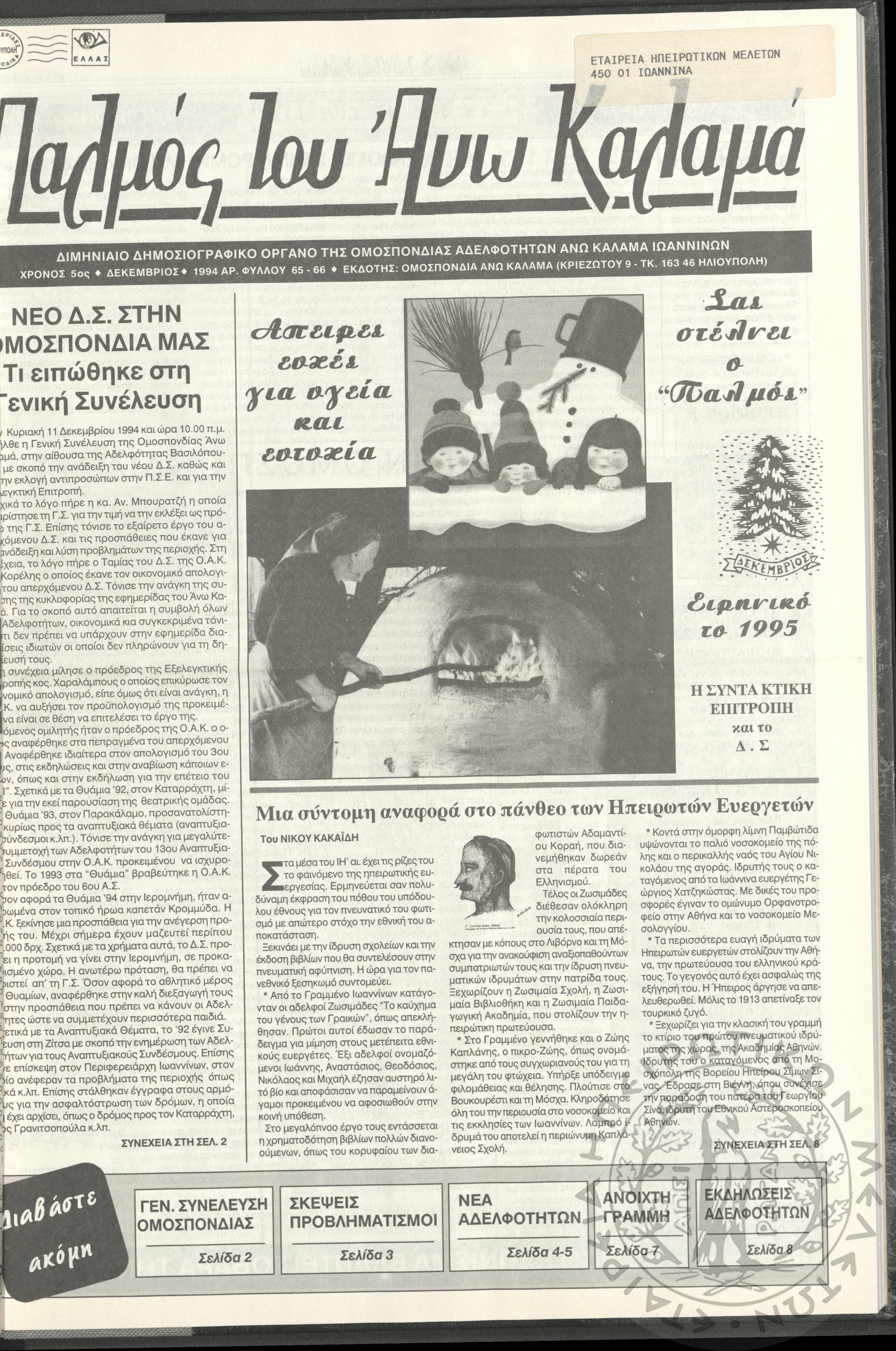 Παλμός του Άνω Καλαμά: διμηνιαίο δημοσιογραφικό όργανο της Ομοσπονδίας Αδελφοτήτων Άνω Καλαμά Ιωαννίνων, 1994, φ. 65-66Έτος 5ο, αρ. φ. 65-66...