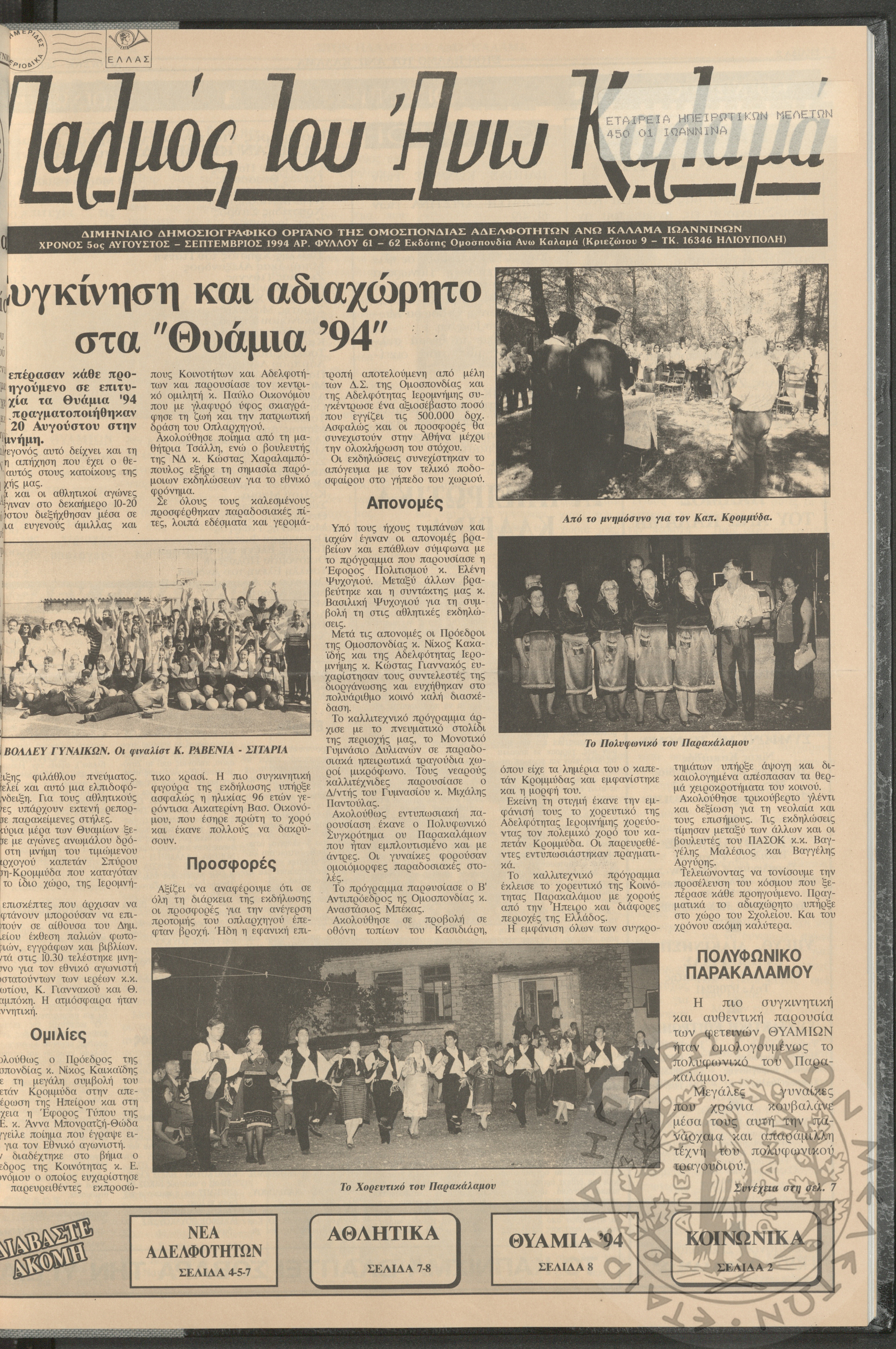Παλμός του Άνω Καλαμά: διμηνιαίο δημοσιογραφικό όργανο της Ομοσπονδίας Αδελφοτήτων Άνω Καλαμά Ιωαννίνων, 1994, φ. 61-62Έτος 5ο, αρ. φ. 61-62...