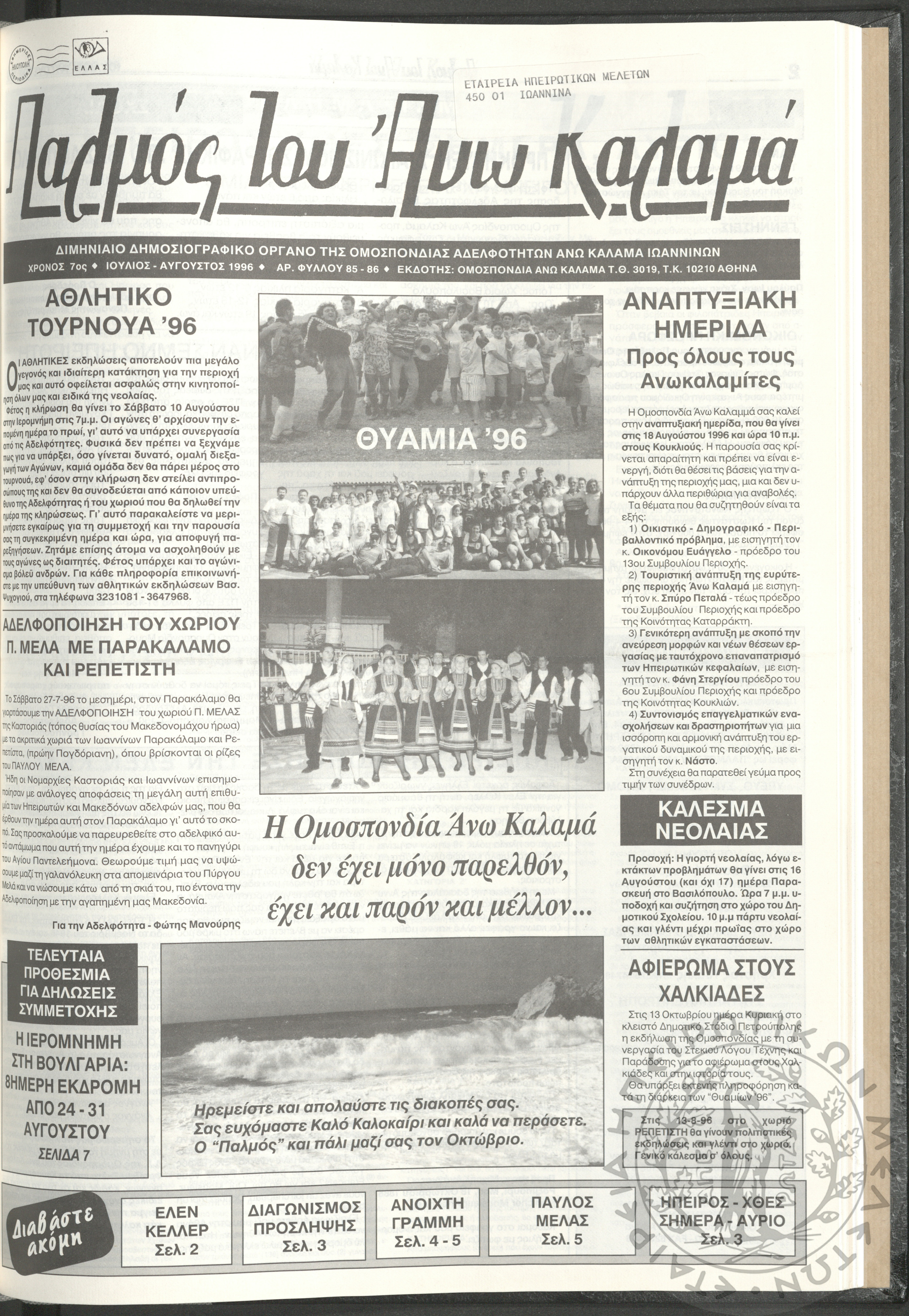 Παλμός του Άνω Καλαμά: διμηνιαίο δημοσιογραφικό όργανο της Ομοσπονδίας Αδελφοτήτων Άνω Καλαμά Ιωαννίνων, 1996, φ. 85-86Έτος 7ο, αρ. φ. 85-86...
