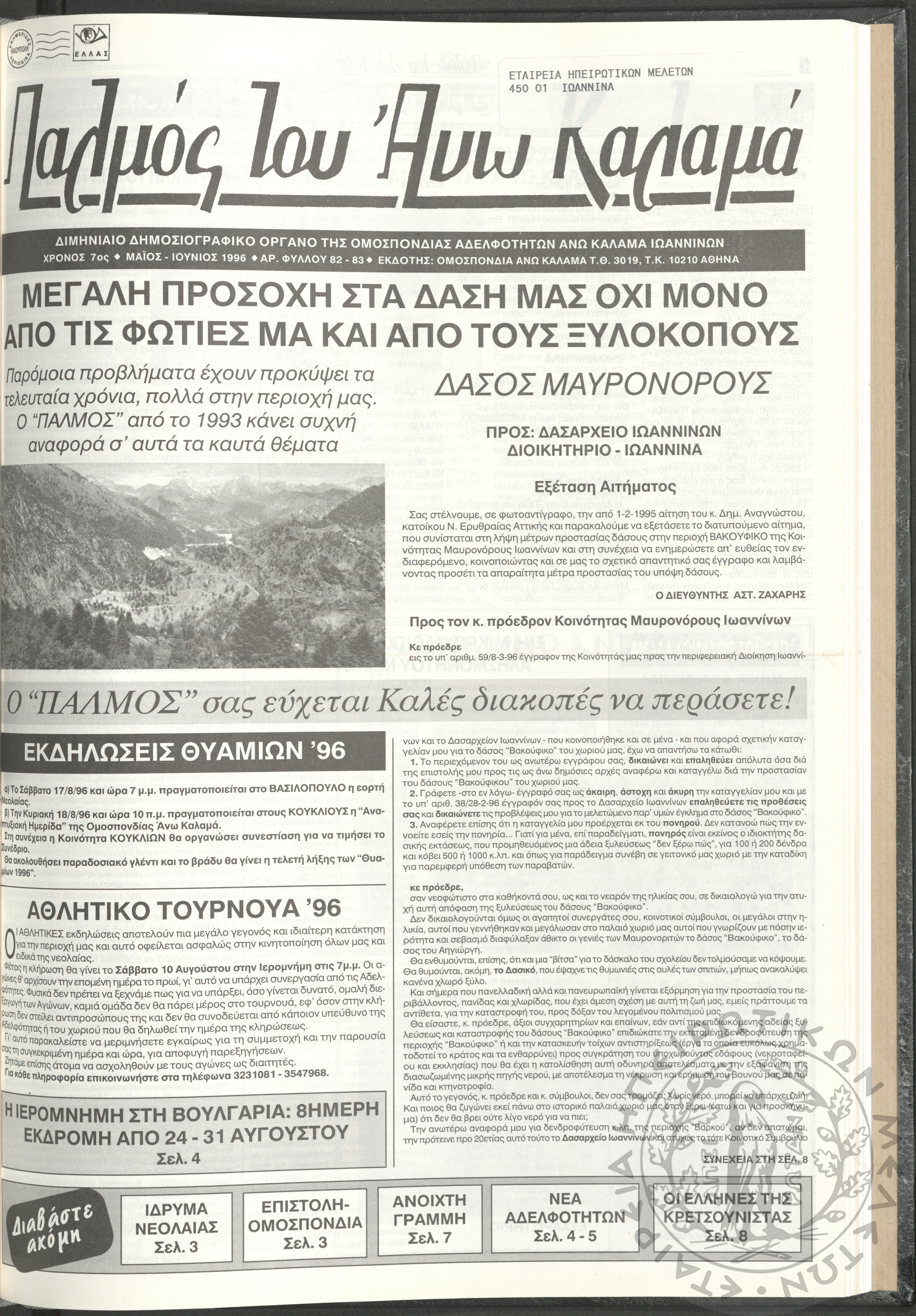 Παλμός του Άνω Καλαμά: διμηνιαίο δημοσιογραφικό όργανο της Ομοσπονδίας Αδελφοτήτων Άνω Καλαμά Ιωαννίνων, 1996, φ. 82-83Έτος 7ο, αρ. φ. 82-83...