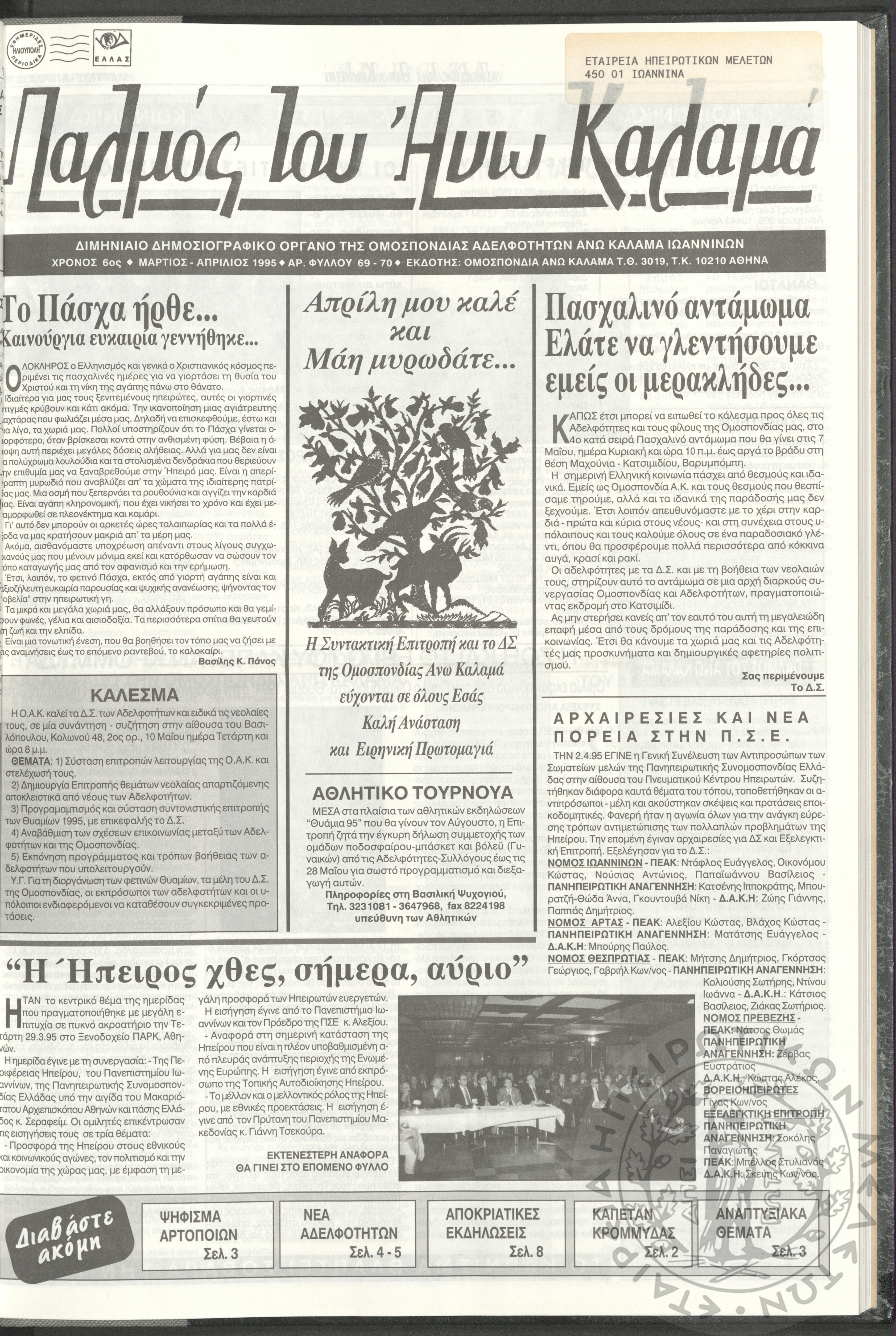 Παλμός του Άνω Καλαμά: διμηνιαίο δημοσιογραφικό όργανο της Ομοσπονδίας Αδελφοτήτων Άνω Καλαμά Ιωαννίνων, 1995, φ. 69-70Έτος 6ο, αρ. φ. 69-70...