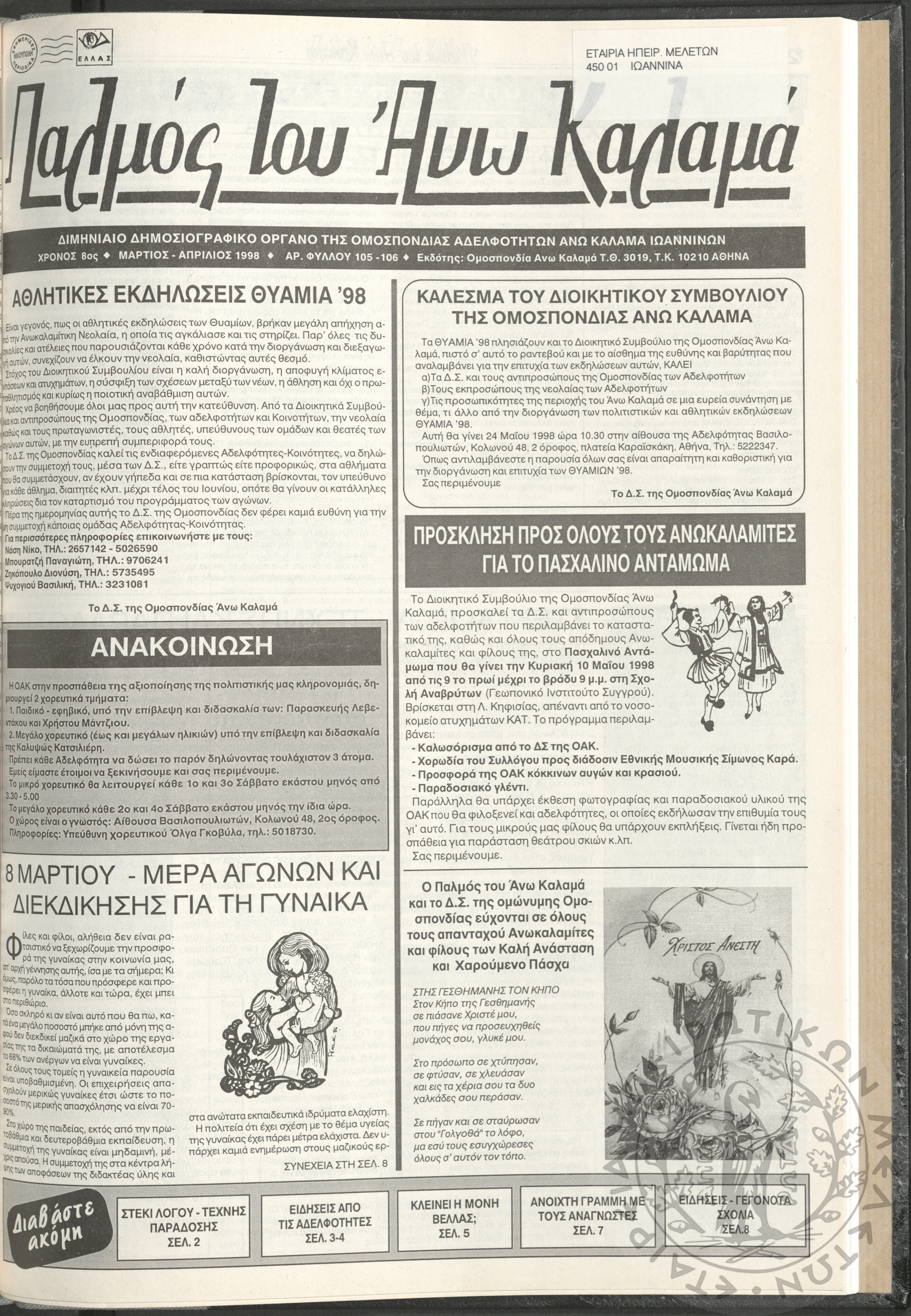 Παλμός του Άνω Καλαμά: διμηνιαίο δημοσιογραφικό όργανο της Ομοσπονδίας Αδελφοτήτων Άνω Καλαμά Ιωαννίνων, 1998, φ. 105-106Έτος 8ο, αρ. φ. 105-106...