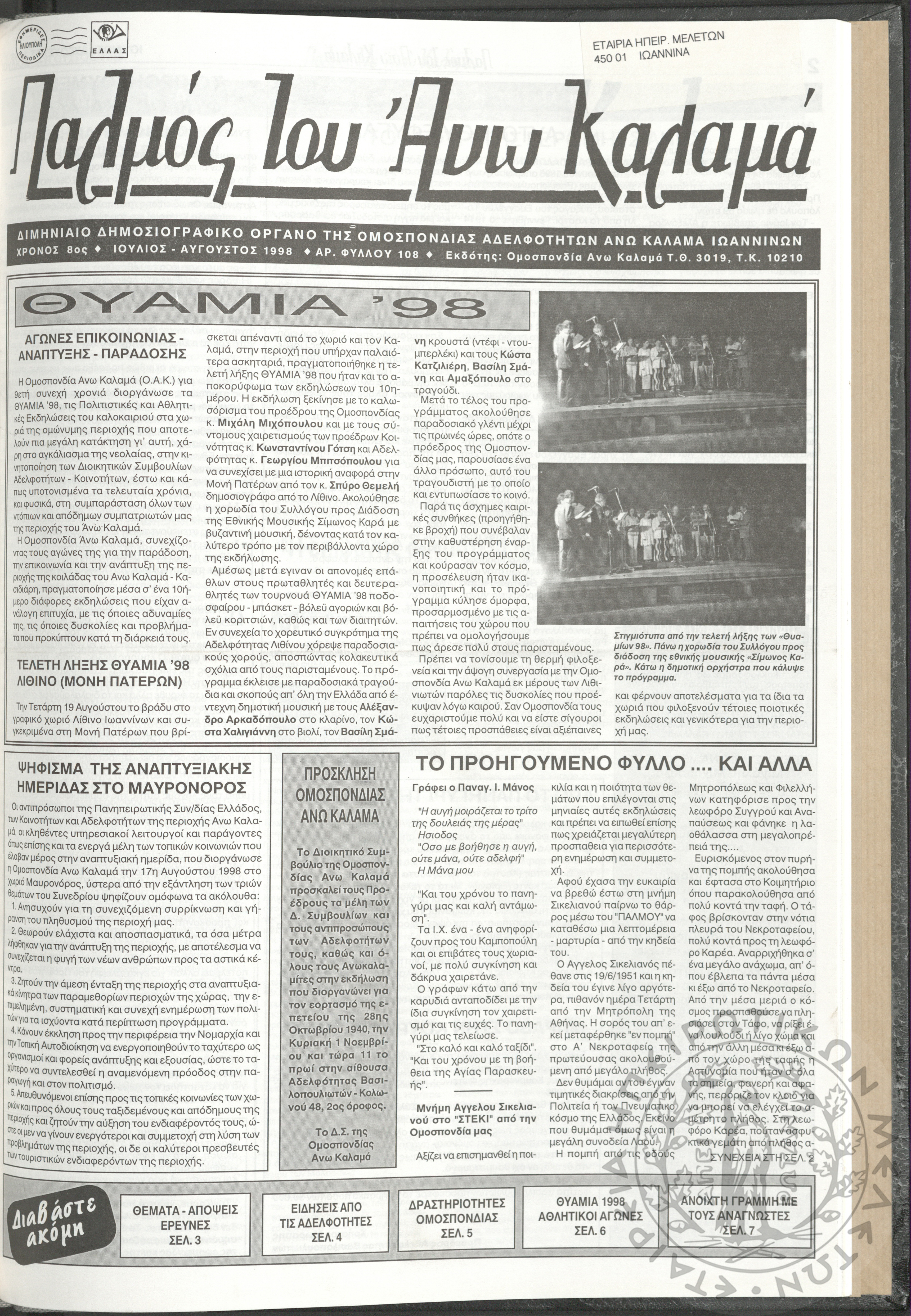 Παλμός του Άνω Καλαμά: διμηνιαίο δημοσιογραφικό όργανο της Ομοσπονδίας Αδελφοτήτων Άνω Καλαμά Ιωαννίνων, 1998, φ. 108Έτος 8ο, αρ. φ. 108...